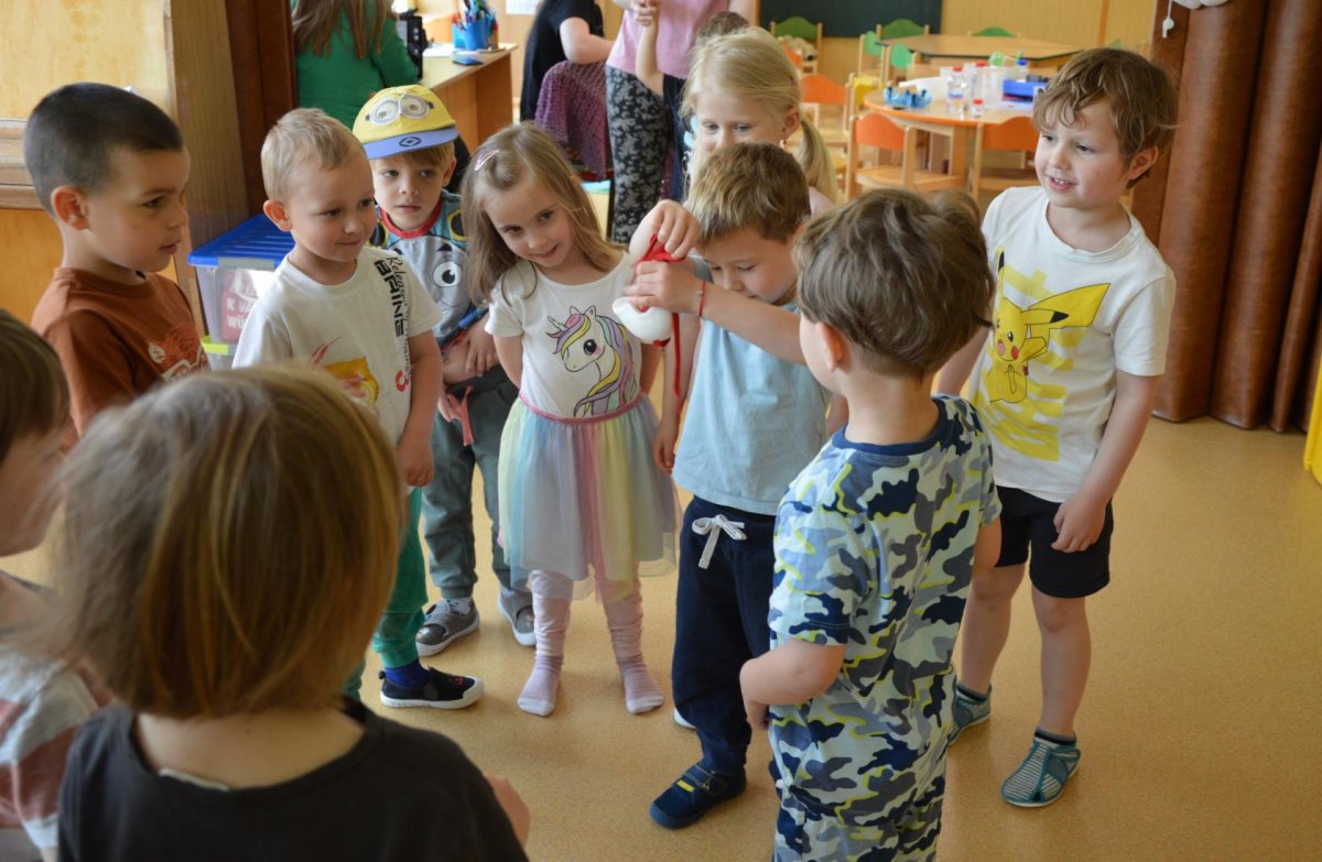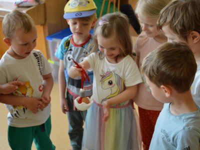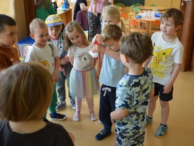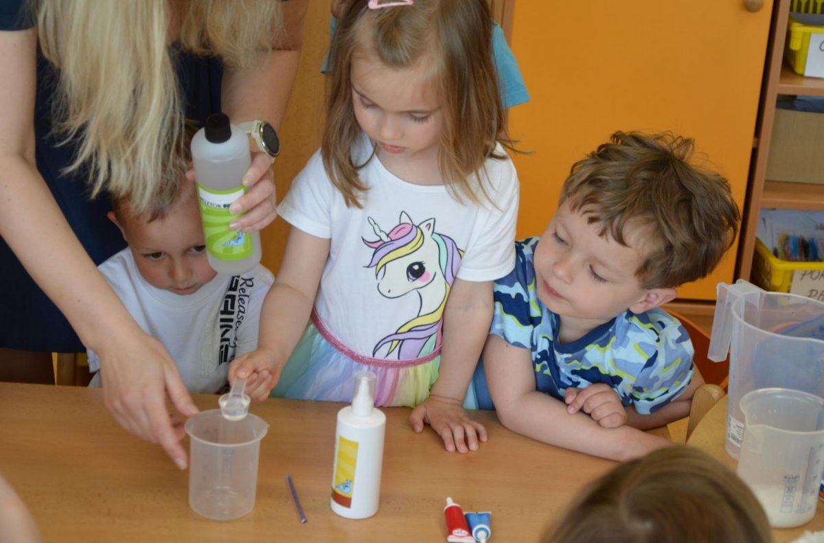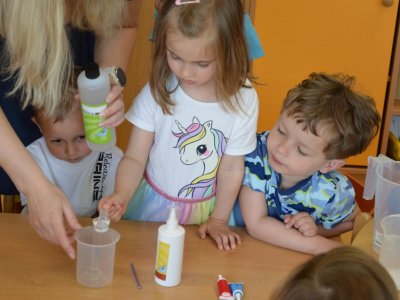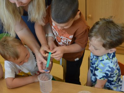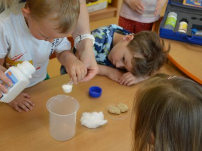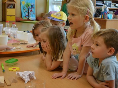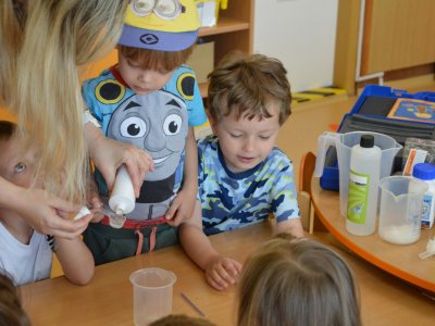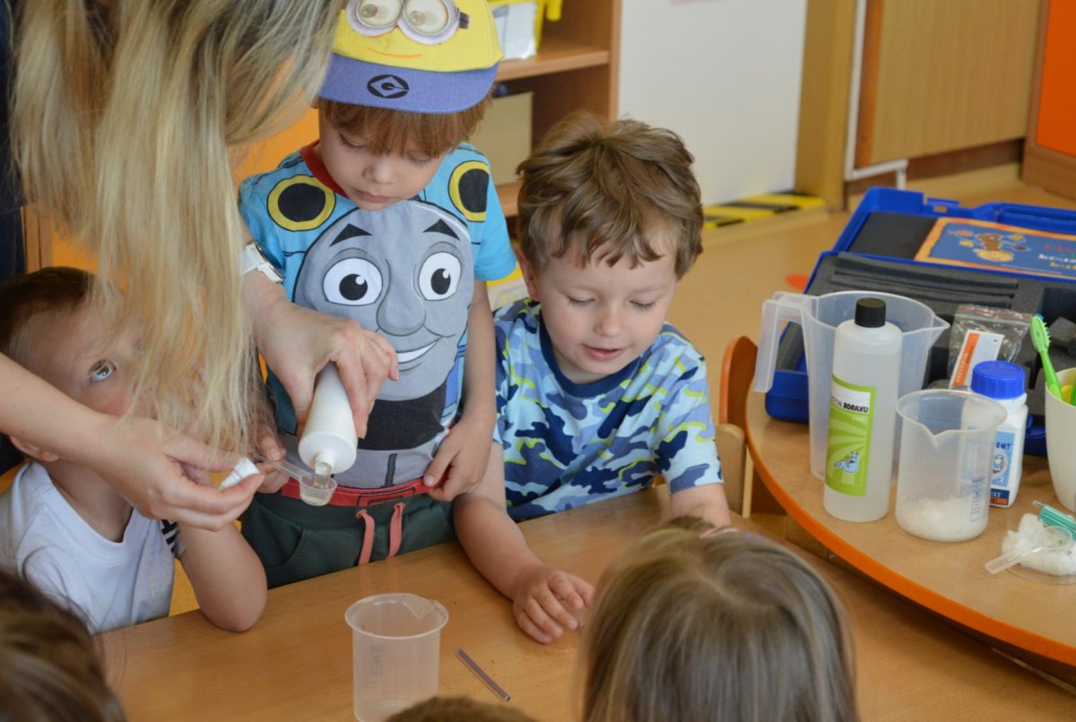 Dnes jsme se opět seznamovali s Plastíkem a jeho kouzelným kufříkem, tentokrát ve třídě Myšek. Nejdřív jsme si vysvětlili, co vlastně plasty jsou, z jakých surovin se vyrábí a kde všude mají využití. Zároveň jsme si zopakovali, kam patří plastový odpad a proč je důležité třídit. Nadšení dětí bylo obrovské, tak jsme přešli k pokusům, při prvním pokusu jsme mohli pozorovat, jaký materiál zadržuje vodu. V Plastíkově kouzelném kufříku jsme našli superabsorbent , zjistili jsme, že sice vypadá jako písek, ale je to plast a k čemu se v běžném životě používá. Při dalším pokusu jsme mohli díky mimbráně filtrovat vodu a zjistit tak rozdíl mezi sítkem a plastovou membránou. Teď už víme, jak se voda vyčistí v čističce odpadních vod. Nakonec jsme si sami plast vyrobili, a to z lepidla a kapaliny s názvem roztok boraxu. Velký úspěch však u dětí měla malá polystyrenová přilba, do které jsme připoutali uvařené vajíčko a nechali ho spadnout na zem. Názorně jsme si potom předvedli, co se vejcem stane bez přilby. Na závěr jsme si přečetli pohádku o Plastové princezně.