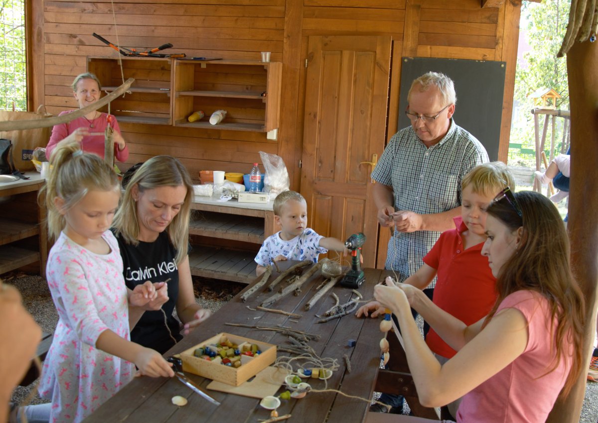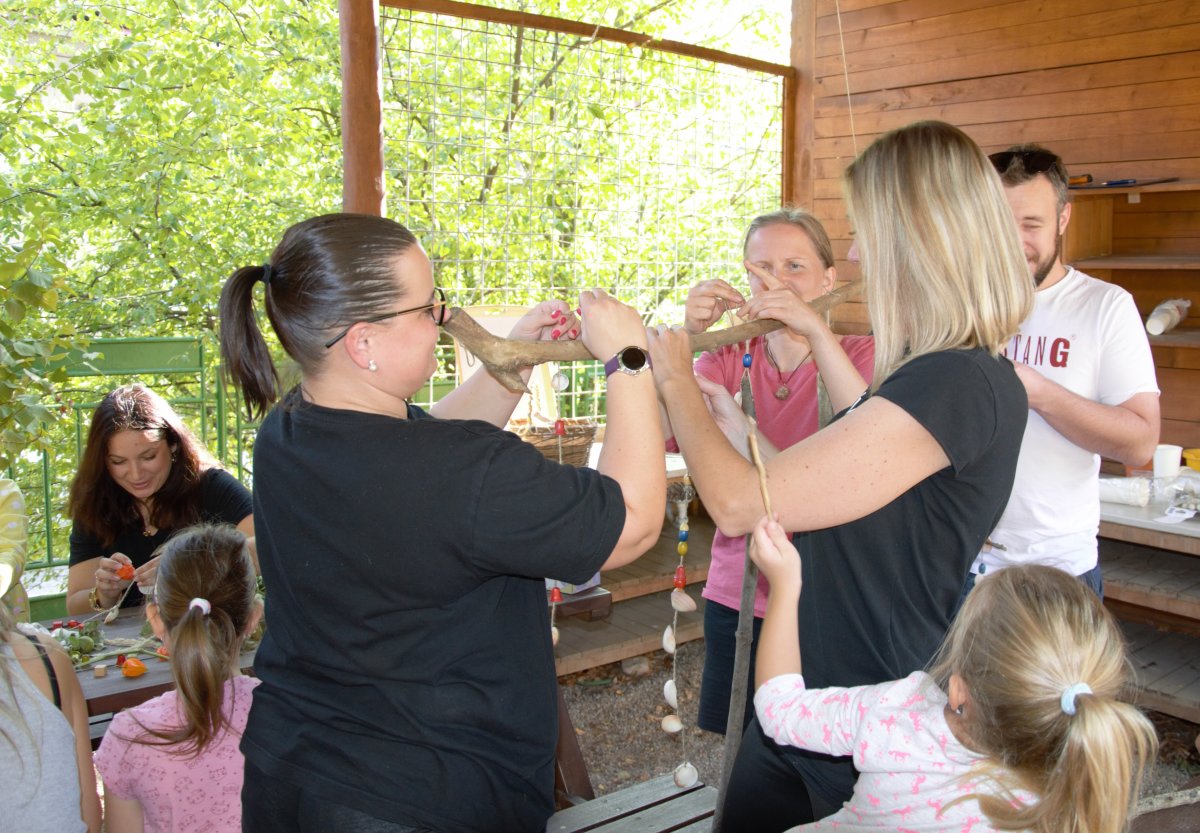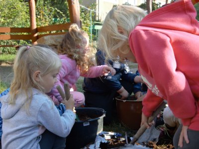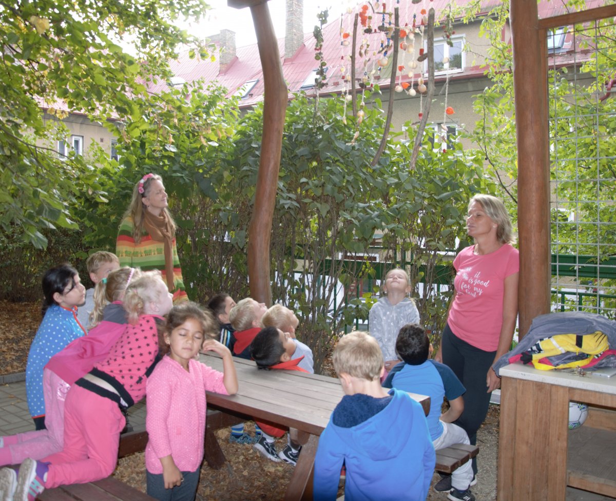 Setkání s rodiči jsme si ve velmi přátelském duchu užili v altánu, kde proběhla teoretická část. Rodičům se osvojily základní principy propojení přírody a jejího kladného vlivu na zdárný vývoj předškoláka. Poté následovala i praktická ukázka, co všechno lze s dětmi realizovat přímo na zahradě formou zábavných her a tvoření z přírodnin, aniž by děti věděly, že si tím upevňují správný úchop, rozvíjí jemnou i hrubou motoriku.
