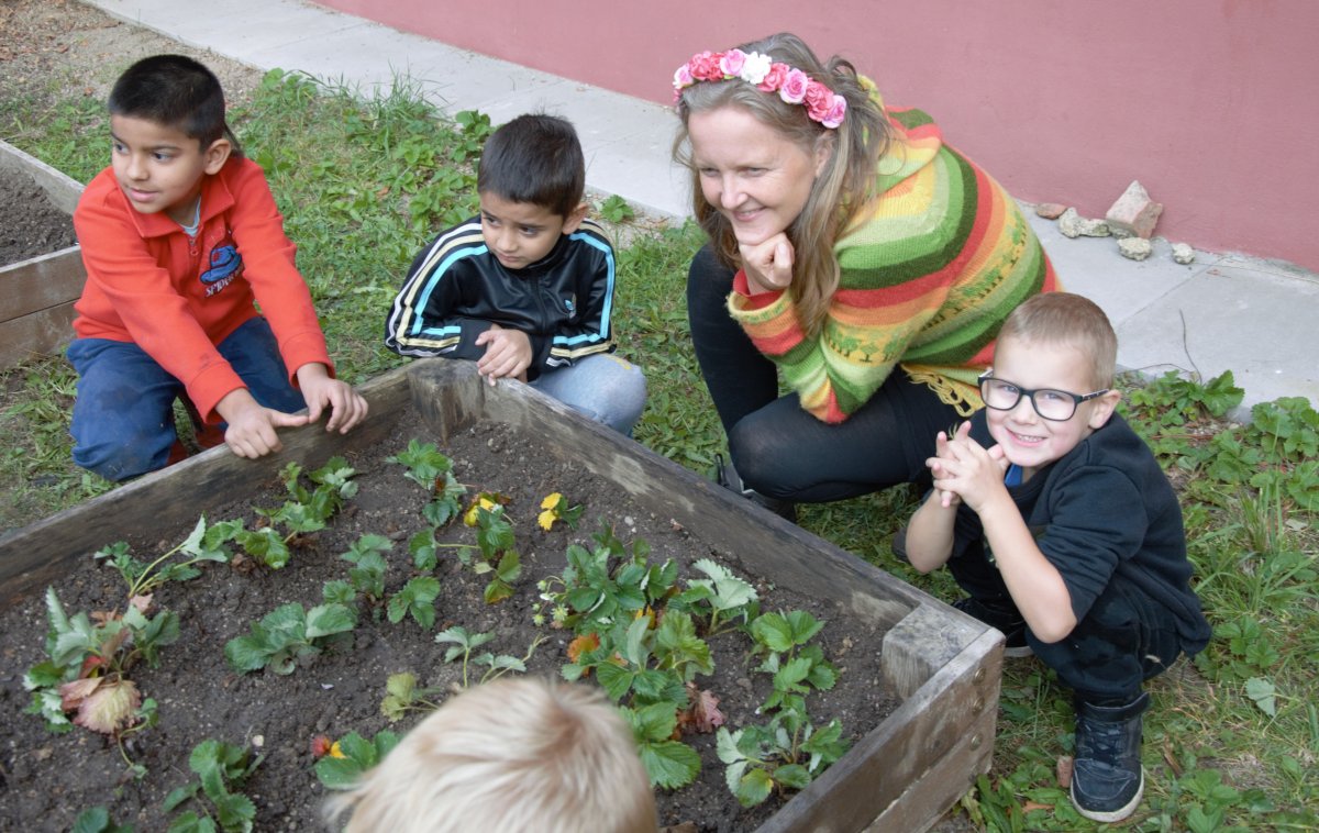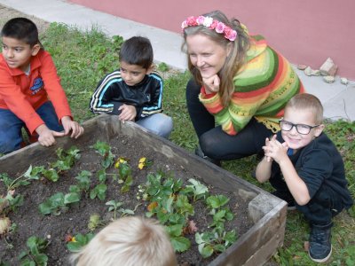Nezapomnělo se ani na třídní záhonky. Pod vedením lektorky si děti samy sázecími kolíky hloubily jamky a vsazovaly jahodníky. Rovněž jsme se zastavily u popisu celých rostlinek, od kořínků, srdíčka, stonku, listů a poté změny kvítků na plody.