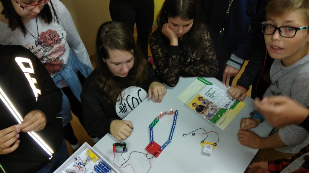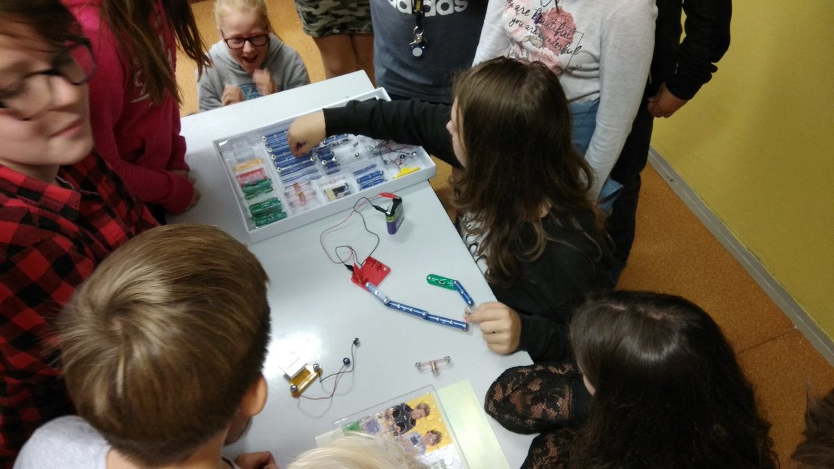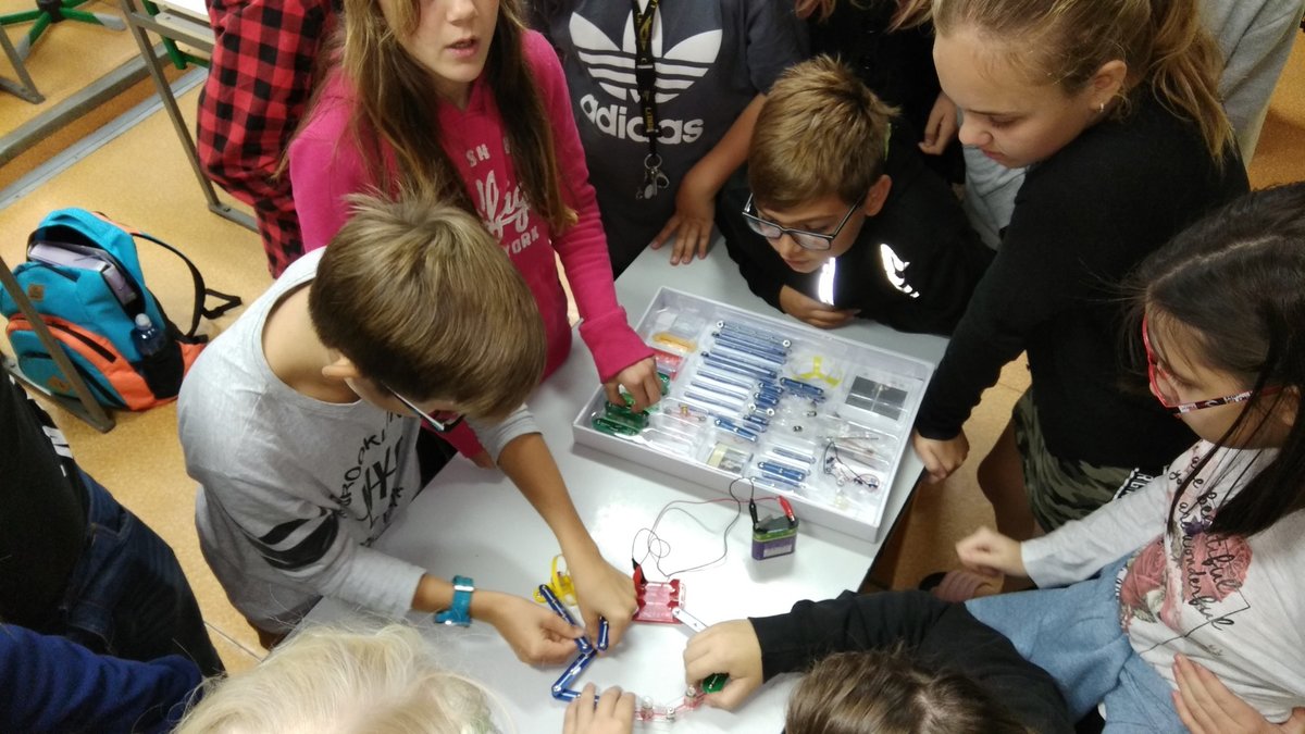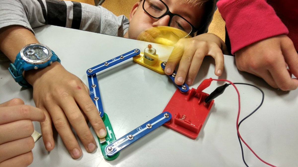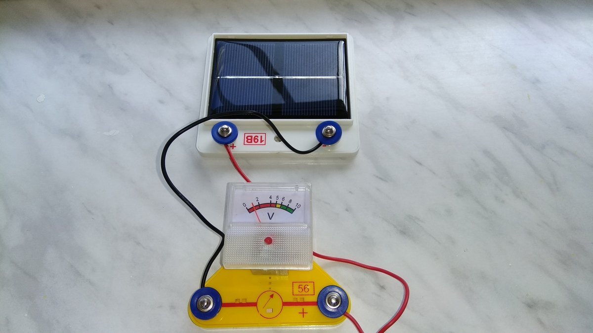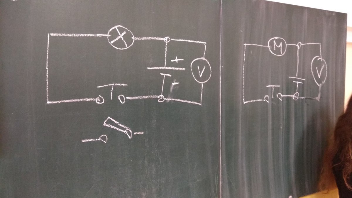 Zapojovaná schémata. Práce na sestavování elektrických obvodů. Sestavování a modifikace elektrických obvodů. Tlačítkový spínač roztáčí stejnosměrný motor a vrtulka vzlétá... Práce na sestavování elektrických obvodů. Sestavený obvod rozsvěcuje dvě žárovky. Jednoduchý solární článek. Voltmetr změřil 1 V při zatažené obloze.