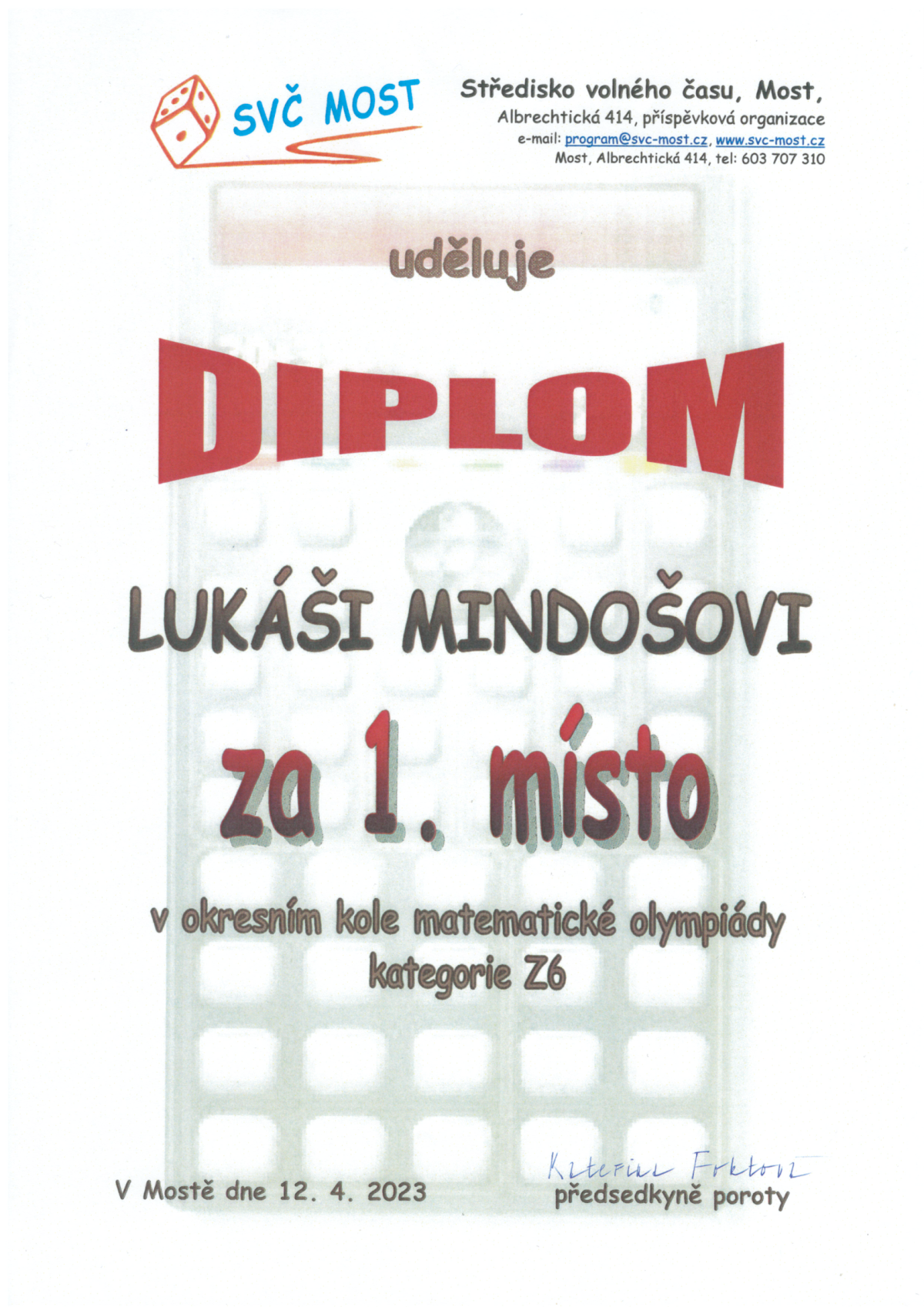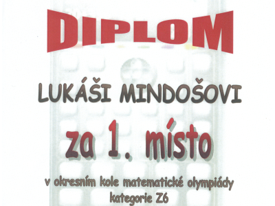 1. místo "Okresní kolo matematické olympiády" - Lukáš Mindoš