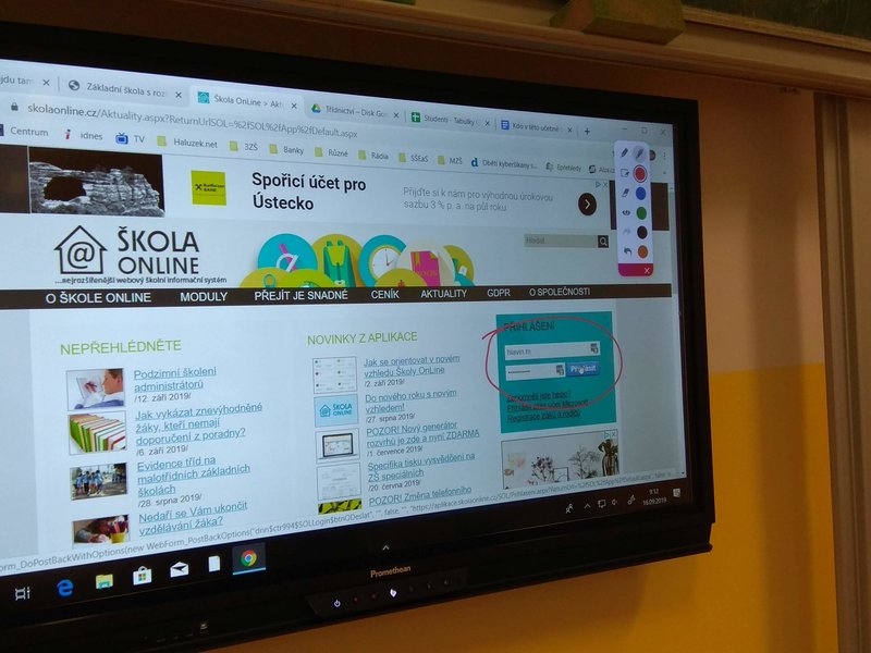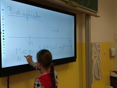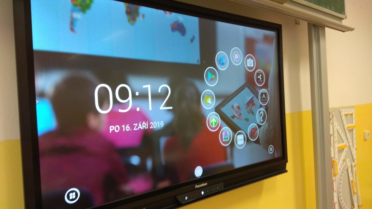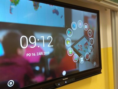 Ve druhé polovině hlavních prázdnin jsme vyměnili jednu interaktivní tabuli za aktivní panel. Získali jsme ho v rámci sponzorského programu Aktivní škola 2019. Jedná se o moderní interaktivní a multidotykové zařízení nahrazující interaktivní tabuli. Velikou výhodou jsou nulové vícenáklady při provozu (lampy do dataprojektoru, čištění dataprojektoru) a větší kontrast zobrazení, který zlepšuje sledování např. při ostrém slunečním svitu nebo z větší vzdálenosti. Sloužit může v několika režimech, a to i bez počítače. Primárním režimem je druhá multidotyková interaktivní obrazovka k počítači. Dále je vhodný režim běžné tabule, u které může pracovat i více žáků v jednom okamžiku. Ve třetím režimu se chová interaktivní panel jako veliký tablet s operačním systémem Android, což bude do budoucna využitelné pro připojování vlastních mobilních zařízení žáků nebo učitelů metoda BYOD (BYOD - z anglických slov Bring Your Own Device, přines si své vlastní zařízení). Stávající interaktivní tabule byla přemístěna do jiné učebny a znovu využita.