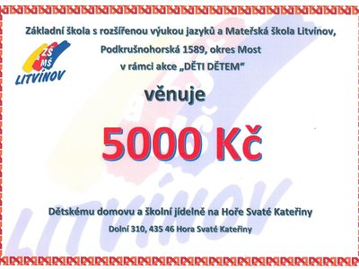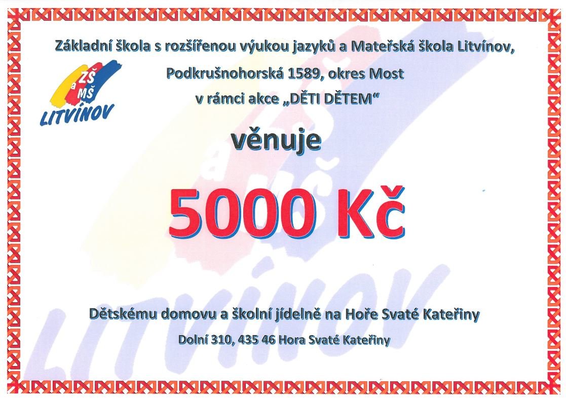 Druhá část peněz (také 5000Kč) bude věnována Dětskému domovu na Hoře Svaté Kateřiny. Zbylé prostředky půjdou směrem k žákům, například na odměny za soutěže, studijní a sportovní úspěchy.