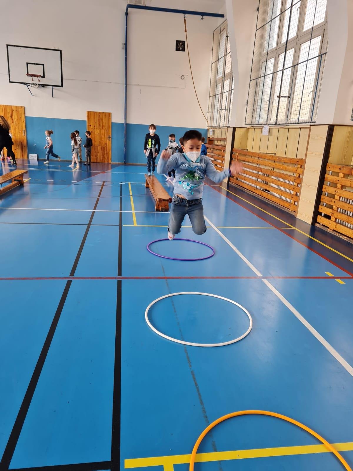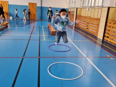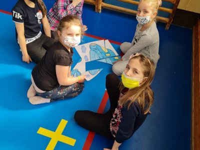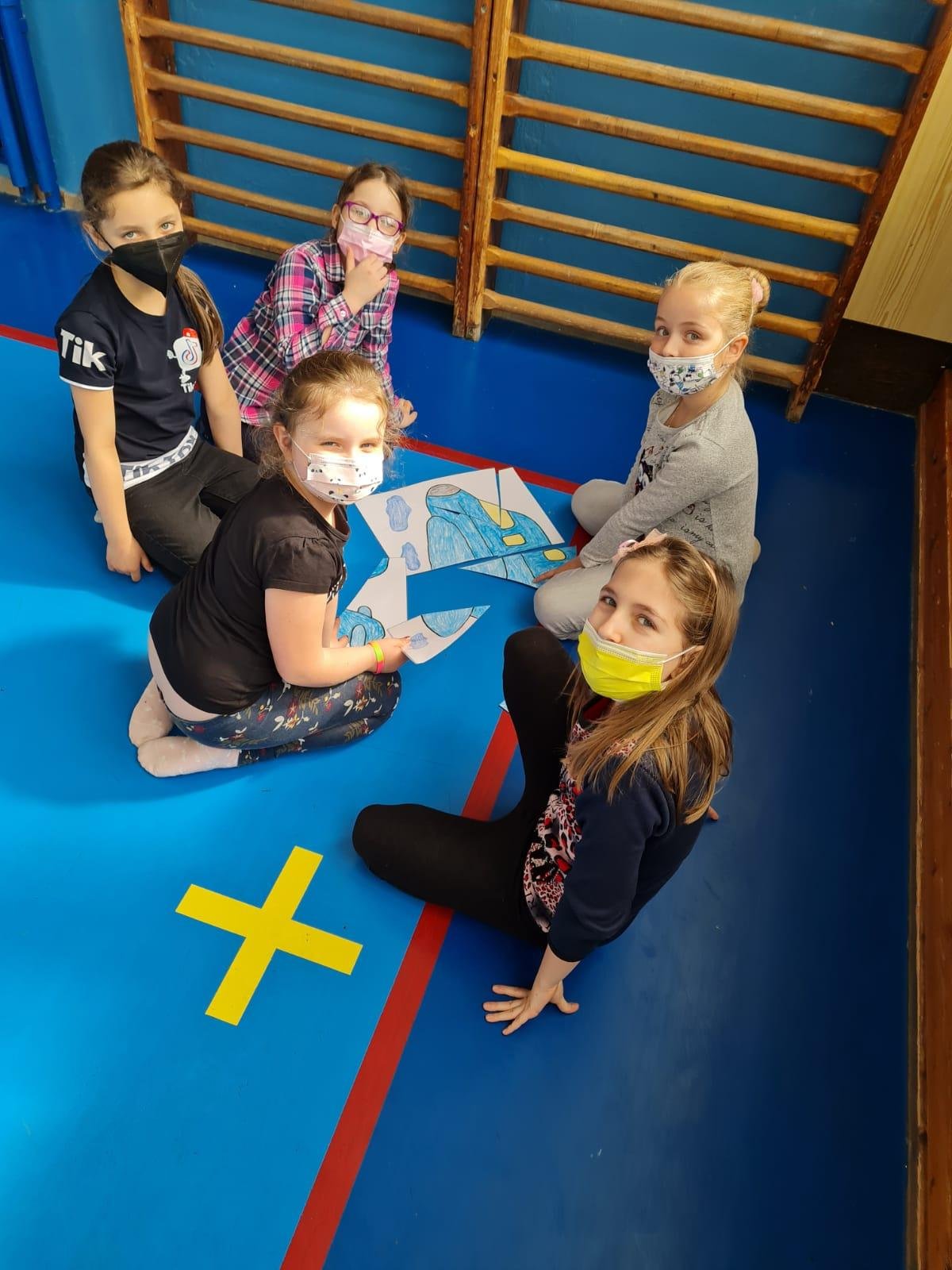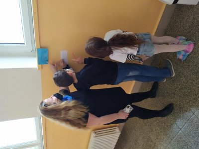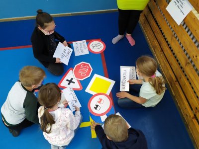 Tímto bychom jí chtěli moc poděkovat. Připravila pro nás vědomostní kvíz, který jsme splnili správným vyplněním tajenky. Některé odpovědi byly i vtipné, ale s pomocí paní učitelek a asistentek, jsme vše zvládli. Počasí nám nepřálo, ale nám to nevadilo, protože nám paní asistentky otázky schovaly v části modré budovy naší školy. Poté, co byly tajenky vyluštěny, jsme se přesunuli do tělocvičny, kde jsme si formou hry zdokonalili své vědomosti v dopravě a zručnosti.