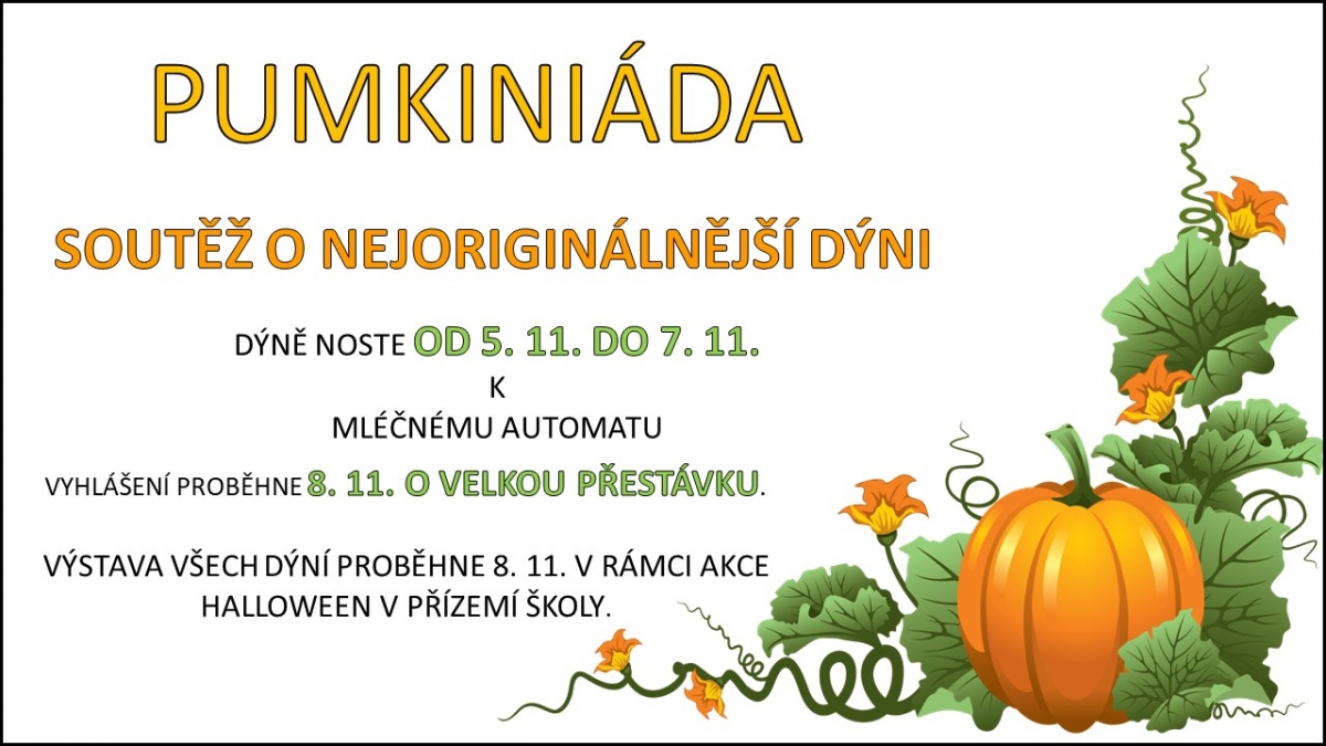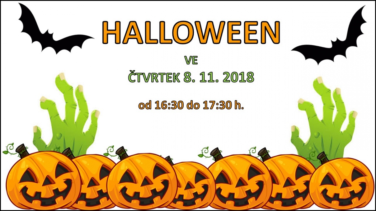 Srdečně vás všechny zveme na tradiční akci Halloween. Je pro vás připraveno strašidelné podzemí, soutěž o nej dýni a nej masku a samozřejmě na vás čekají sladké dobroty :).
