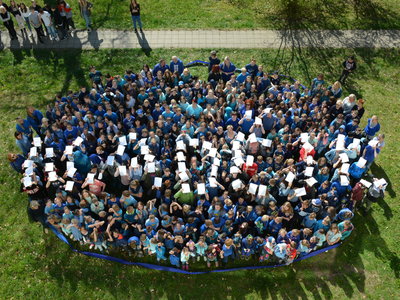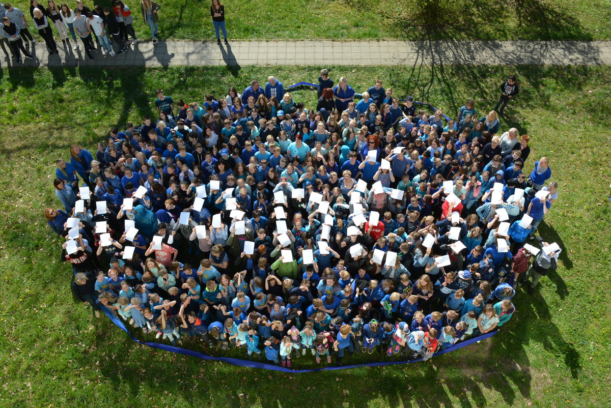 I my na jazykovce jsme se domluvili, že se ke kampani připojíme, a to v pondělí 15. dubna. Od nejmenších po největší, ráno jsme přišli do školy v modrém. Nejprve jsme autismu věnovali naši pravidelnou třídní chvilku, diskutovali, ptali se a dívali se na videa. V 11 hodin jsme se sešli v parku před školou, abychom se společně vyfotografovali, a vznikla tak naše "živá modrá fotka ve tvaru balónku".