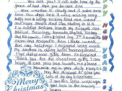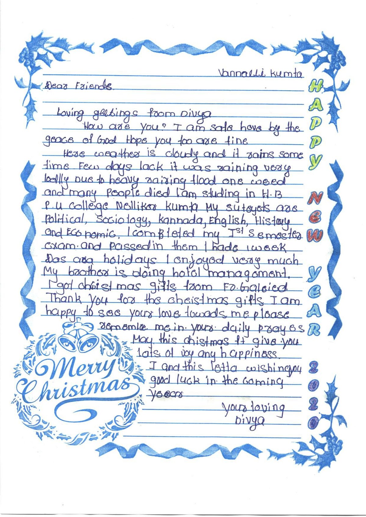 krásné pozdravy od Divye. Jak se máte? Jsem tu v bezpečí milosti Boží. Doufám, že se taky máte dobře. Je zde zataženo a někdy prší. Před pár dny pršelo hodně. Kvůli prudkým dešťům nastaly povodně a mnoho lidí zemřelo. Studuji na vysoké škole v Kumtě. Moje předměty jsou politika, sociologie, Kannada (indický jazyk), angličtina, dějepis a ekonomie. Splnila jsem první zkoušky semestru a prošla. Měla jsem týden prázdnin. Hodně jsem si je užila. Můj bratr je hotelový manažer.