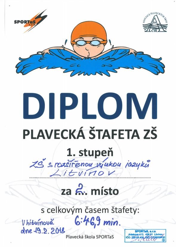 Plavecká škola SPORTaS uděluje Základní škole s rozšířenou výukou jazyků a MŠ Litvínov