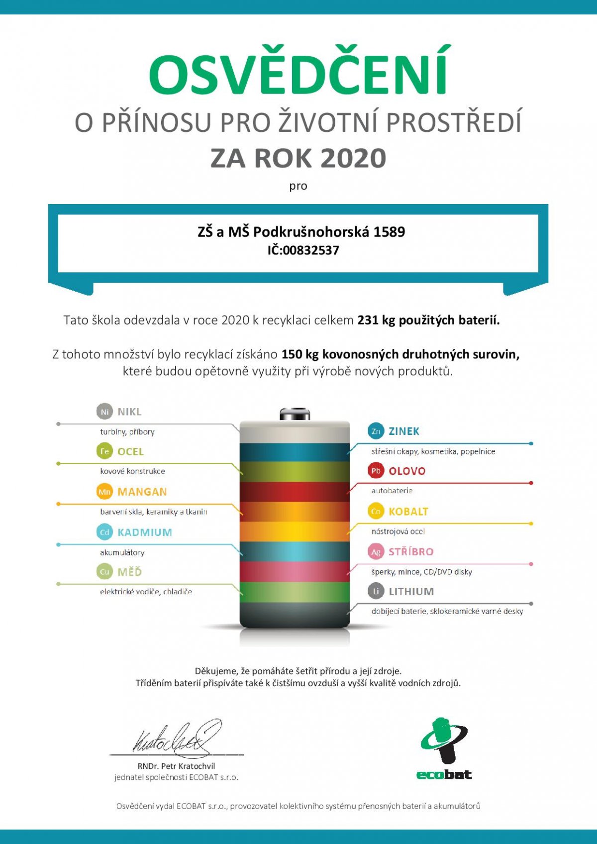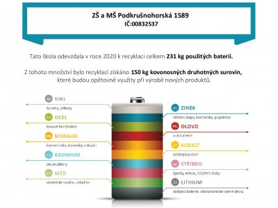 Získali jsme osvědčení o činnosti prospívající přírodě a to v podobě sběru použitých baterií. Celkem jsme jich sesbírali 231 kg, což umožňuje získat až 150 kg kovonosných druhotných surovin, které budou znovu využity při výrobě nových produktů.