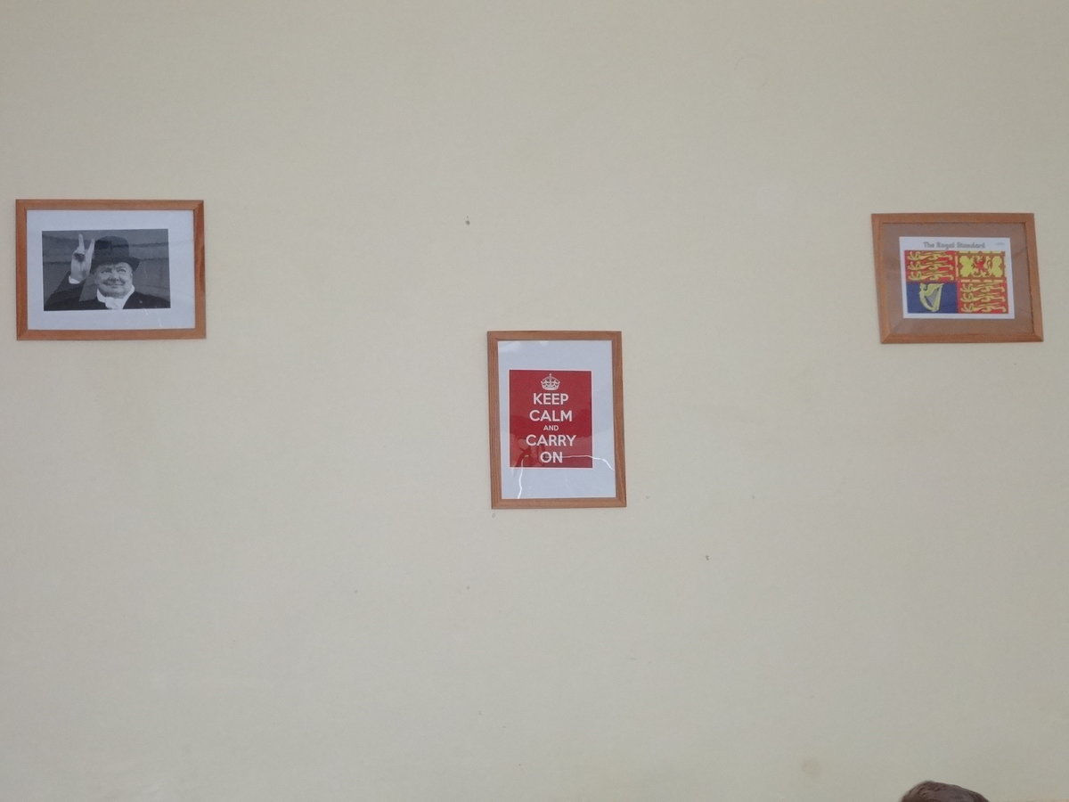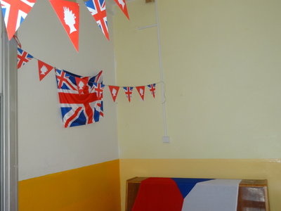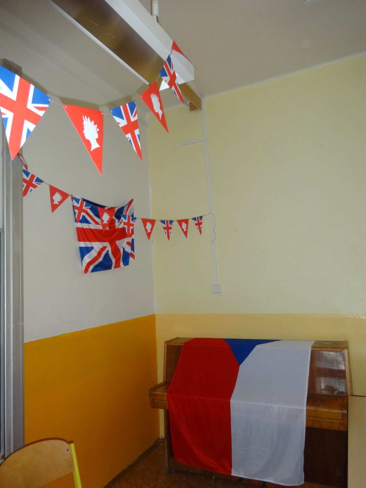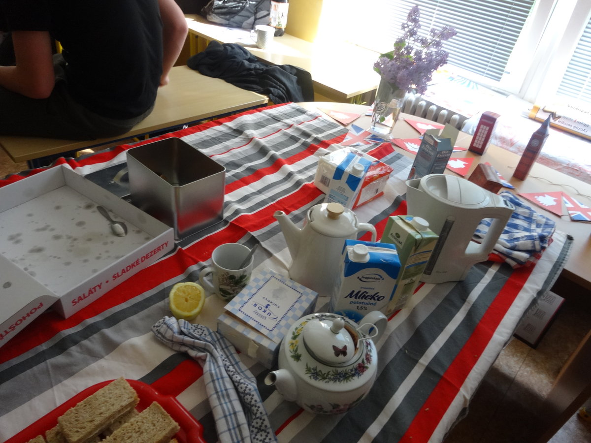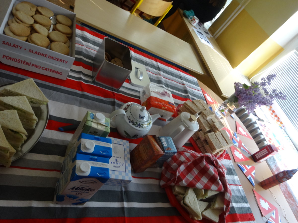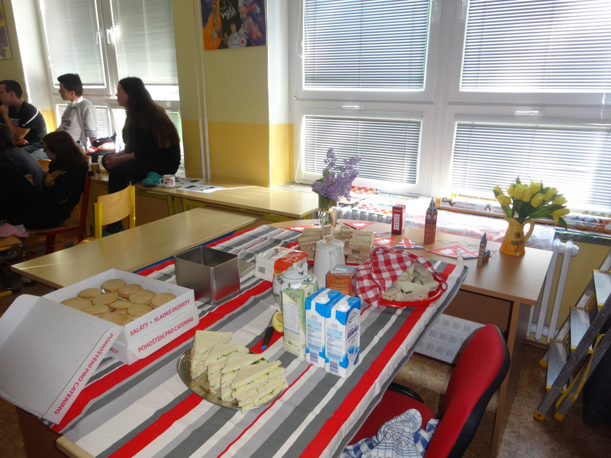 V pátek 4. května jsme vstoupili na pár hodin do 40. let minulého století okamžikem, kdy jsme vzali za kliku učebny č. 47. Paní učitelka nás přivítala v dobovém oblečení i účesu. Třída byla vyzdobena v anglickém stylu, na stěnách visely portréty královské rodiny, sira Winstona Churchilla i britská standarta společně s českou a britskou vlajkou. Na lavicích byly vystaveny papírové modely Big Benu, Britského parlamentu i červených telefonních budek. Ve váze voněl šeřík. Třídu dekorovaly girlandy s britskými motivy, Union Jackem a siluetou současné panovnice královny Elizabeth II. Také pro nás byl připravený nazdobený foto koutek. A v neposlední řadě na nás čekal velký stůl s občerstvením, které paní učitelka s pomocí několika žáků přichystala. Na stole byly čajové konvičky s anglickým čajem, talíře s pravými anglickými sendviči a v plechovkách domácí anglické Digestive biscuits.