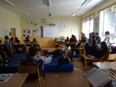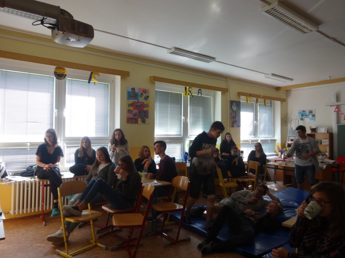 Atmosféra během celého dne se měnila od vážné a místy pochmurné a smutné až ke smíšeným pocitům, spokojenosti a radosti. Když odbíjely zvony, všichni chápali vážnost situace a ve třídě bylo hrobové ticho a zvuk zvonů se linul celým křídlem školy. I společnou píseň většina z nás nahlas zpívala a věděli jsme, že to není jen nějaký text a melodie. Cítili jsme ten smysl toho všeho. Film byl vynikající a většinu z nás to vtáhlo do děje, chvílemi jsme hrůzou nedýchali, chvílemi se některým chtělo brečet, zvlášť, když si člověk připomenul, že to, co vidíme na plátně, se skutečně stalo a skutečnou tvář pana Spielmana jsme znali z fotografií. Zažili jsme ale i veselé chvilky, když jsme společně popíjeli čaj, jedli sendviče a mlsali sušenky. I během práce s pracovními listy byl ve třídě klid a snažili jsme se zapojit všichni do práce. Na konci akce při společném fotu na závěr bylo vidět, že si to většina z nás opravdu užila.