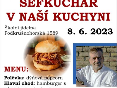 U výdeje pro žáky a zaměstnance školy čekala dýňová polévka s popcornem a burger s trhaným vepřovým masem, gurmánské brambory, bylinkový dip a zelný salát Coleslaw.
