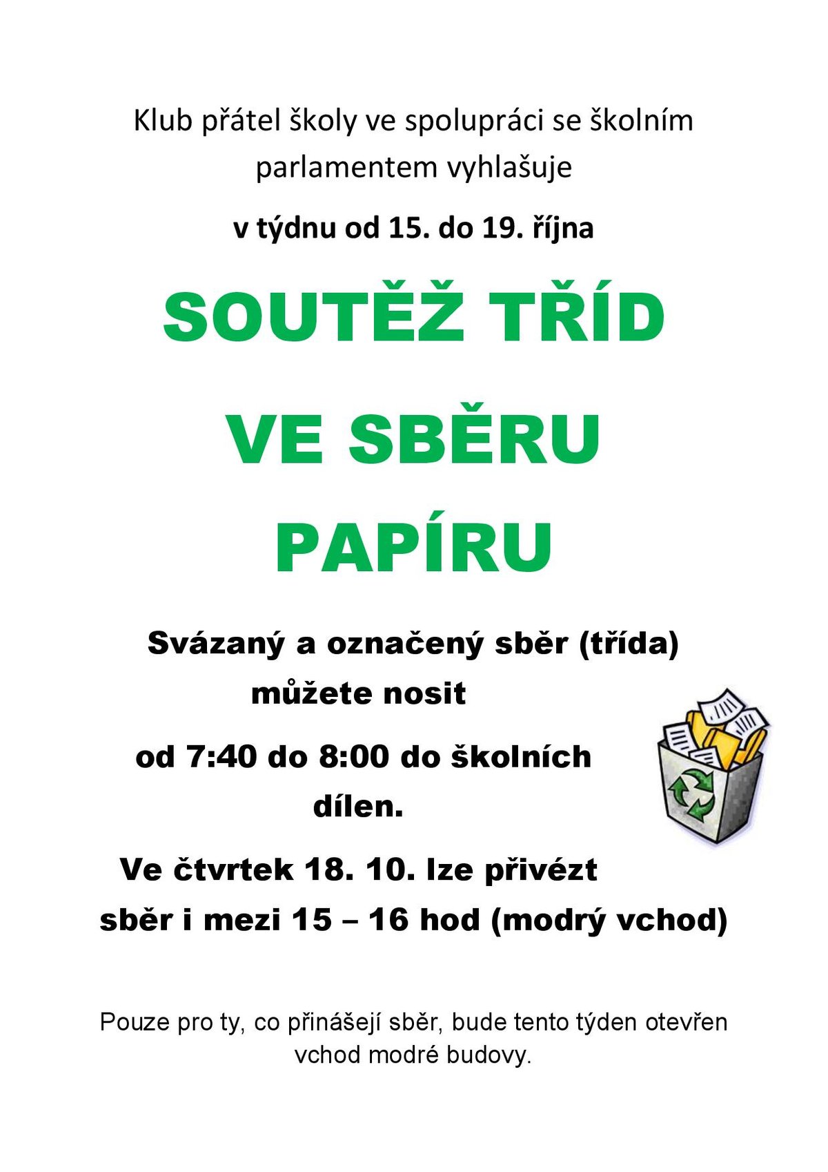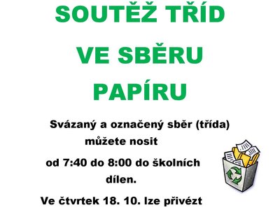 Svázaný a označený sběr (třída) můžete nosit od 7:40 do 8:00 do školních dílen. Ve čtvrtek 18. 10. lze přivézt sběr i mezi 15 – 16 hod (modrý vchod). Pouze pro ty, co přinášejí sběr, bude tento týden otevřen vchod modré budovy.