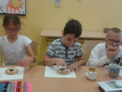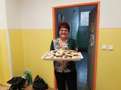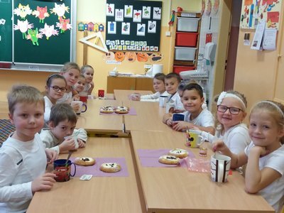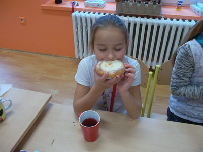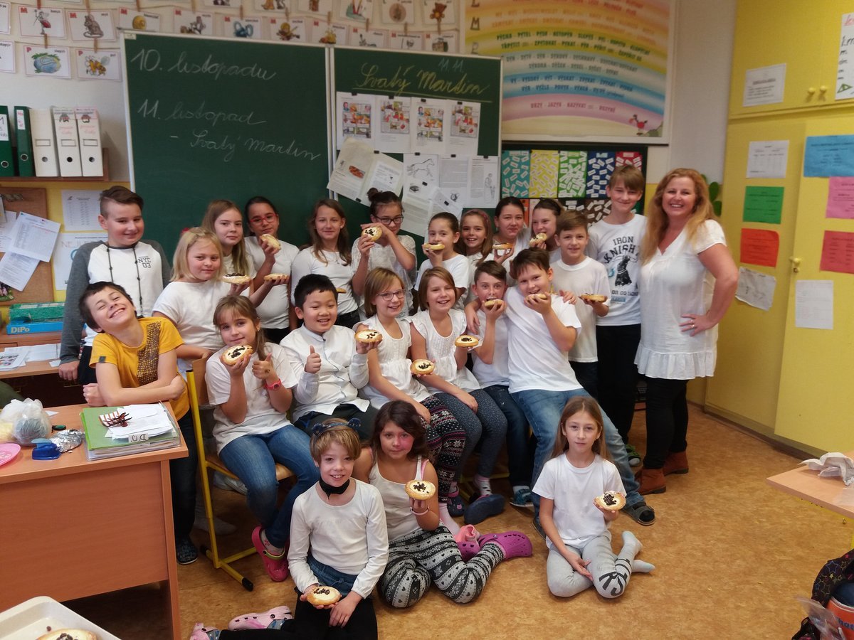 K svačince si děti s p. učitelkami uvařily čaj a pojedly výborný svatomartinský koláč. Všichni jsme ze školy odcházeli plni dojmů a s plnými bříšky, jelikož pozadu nezůstaly ani naše paní kuchařky, které nám připravily výtečnou kachnu, zelí a knedlíky. A řekněte sami, kdo by se nepřejedl?