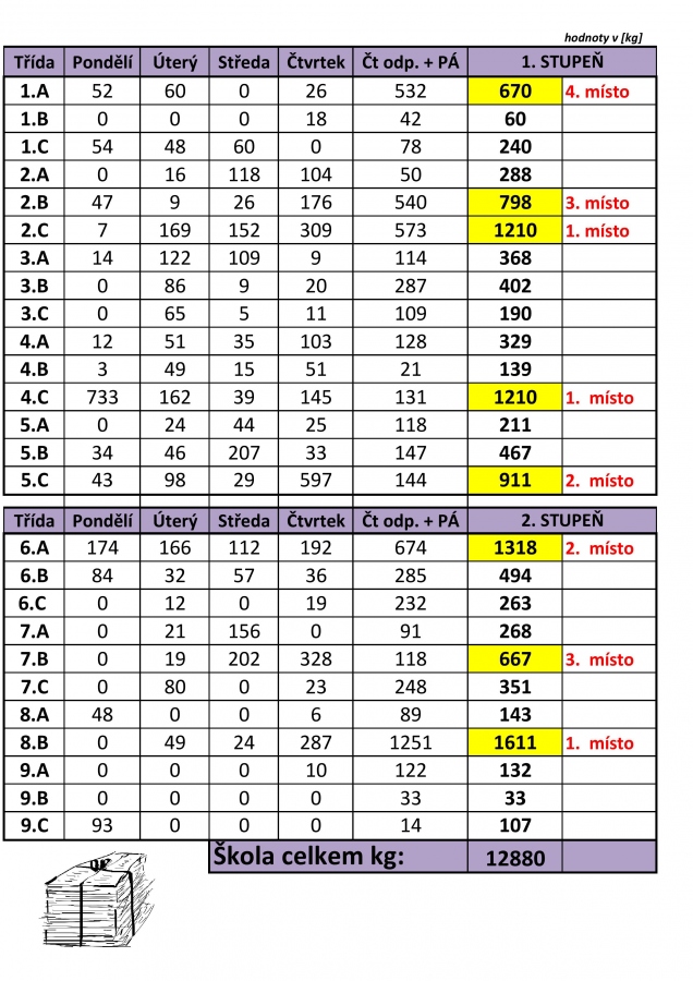 Ve dnech 15. - 19. 10. u nás proběhla sběrová akce. Všem děkujeme za donesený papír a za skvělou účast na soutěži. První tři třídy byly odměněny věcnými sladkými dary a ostatní cenou útěchy, pytlíkem bonbónů.
