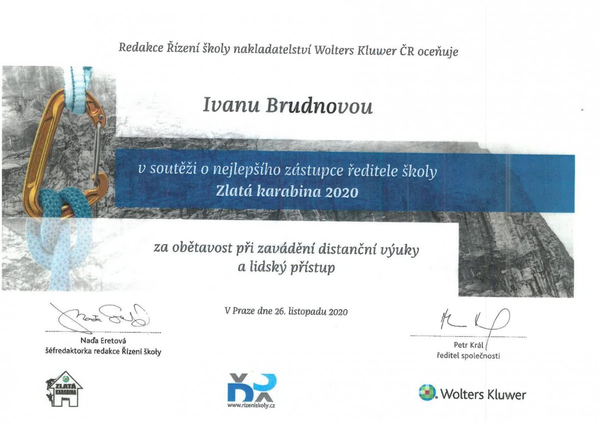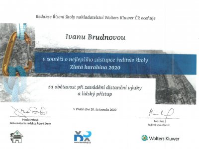 Mgr. Ivana Brudnová, zástupkyně ředitelky školy pro 2. stupeň a statutární zástupce, uspěla v soutěži o nejlepšího zástupce ředitele školy Zlatá karabina 2020. Do soutěže ji nominovala Eva Kohoutová, učitelka 2. stupně za obětavost při zavádění distanční výuky a lidský přístup. Cenu obdržela paní zástupkyně online dne 26. 11.