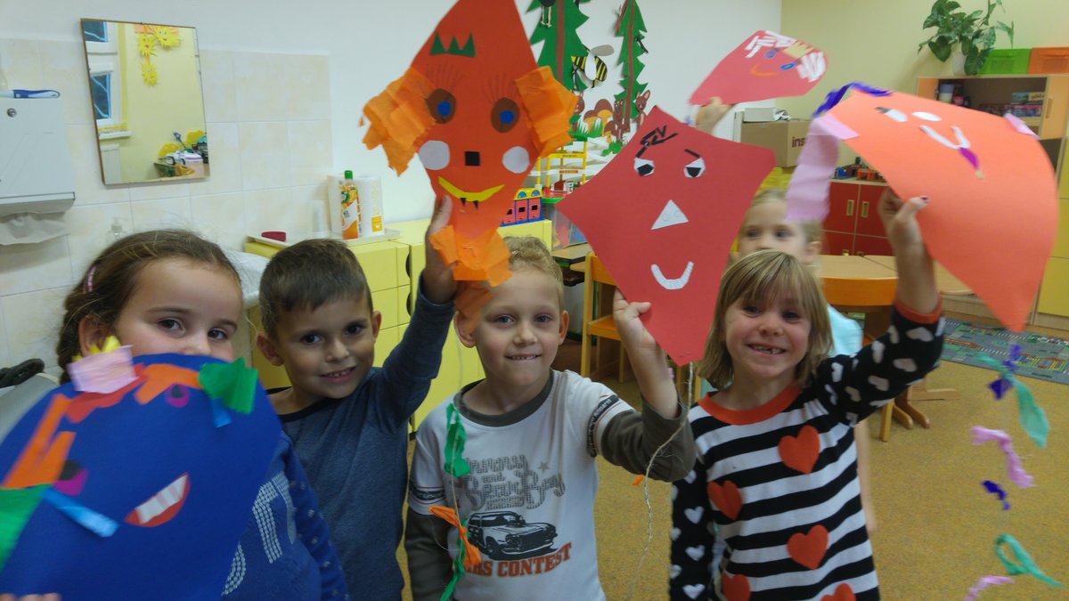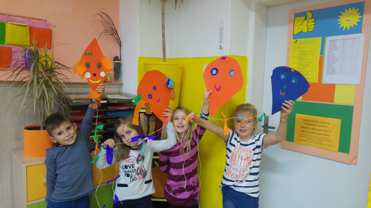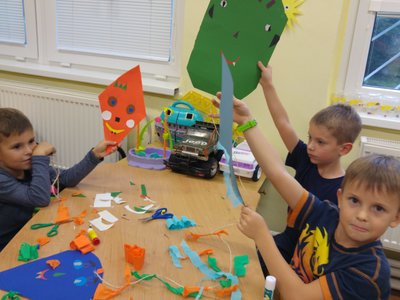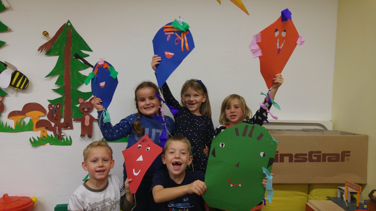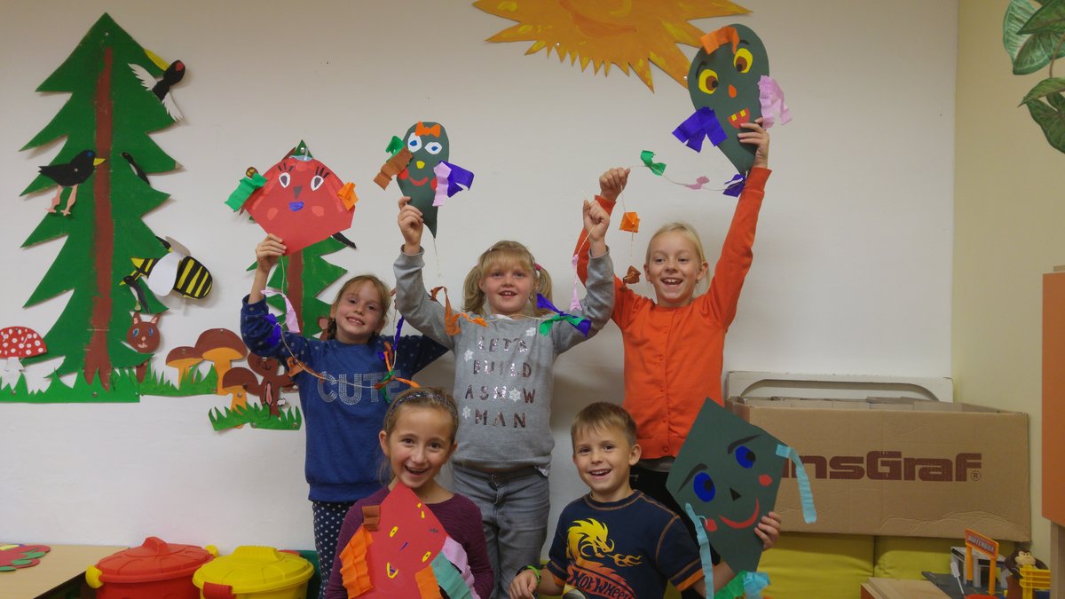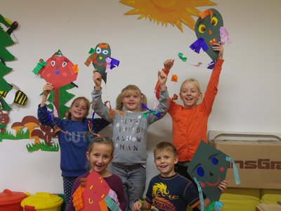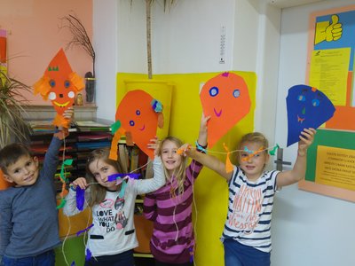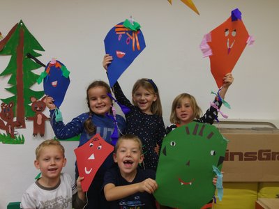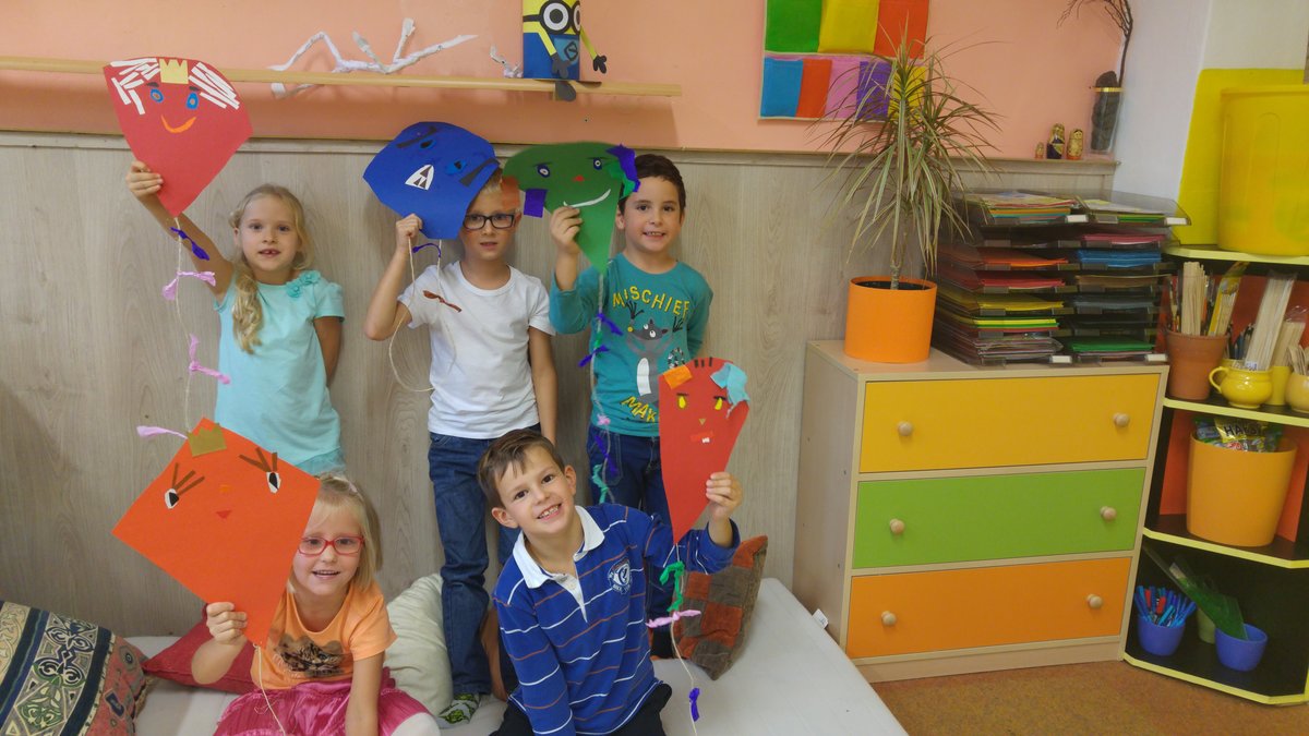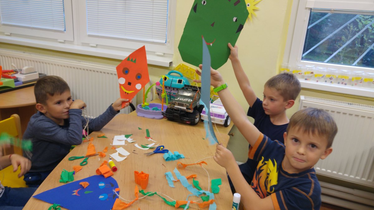 Počasí nám nepřeje a pouštět draky venku nemůžeme... Nám to ale nevadí, protože si s vyrobenými dráčky pěkně užíváme!