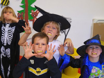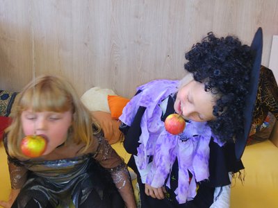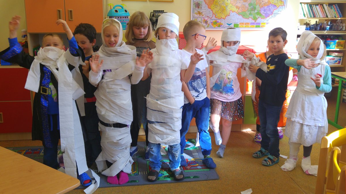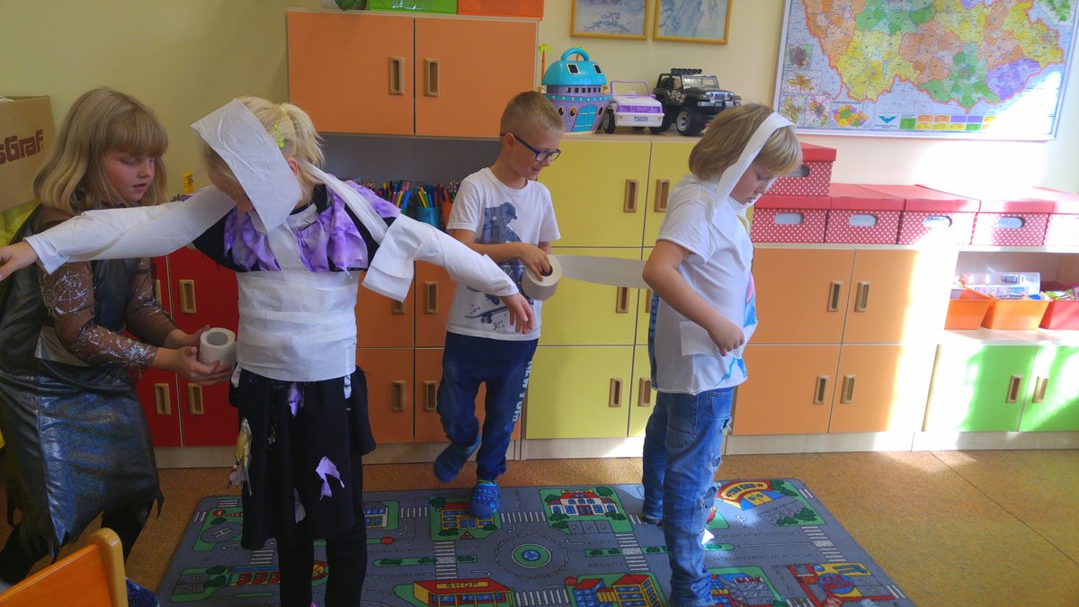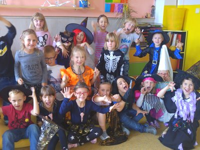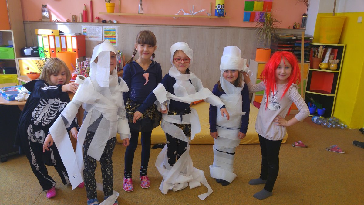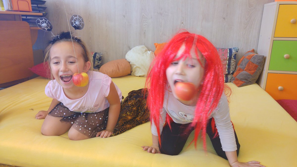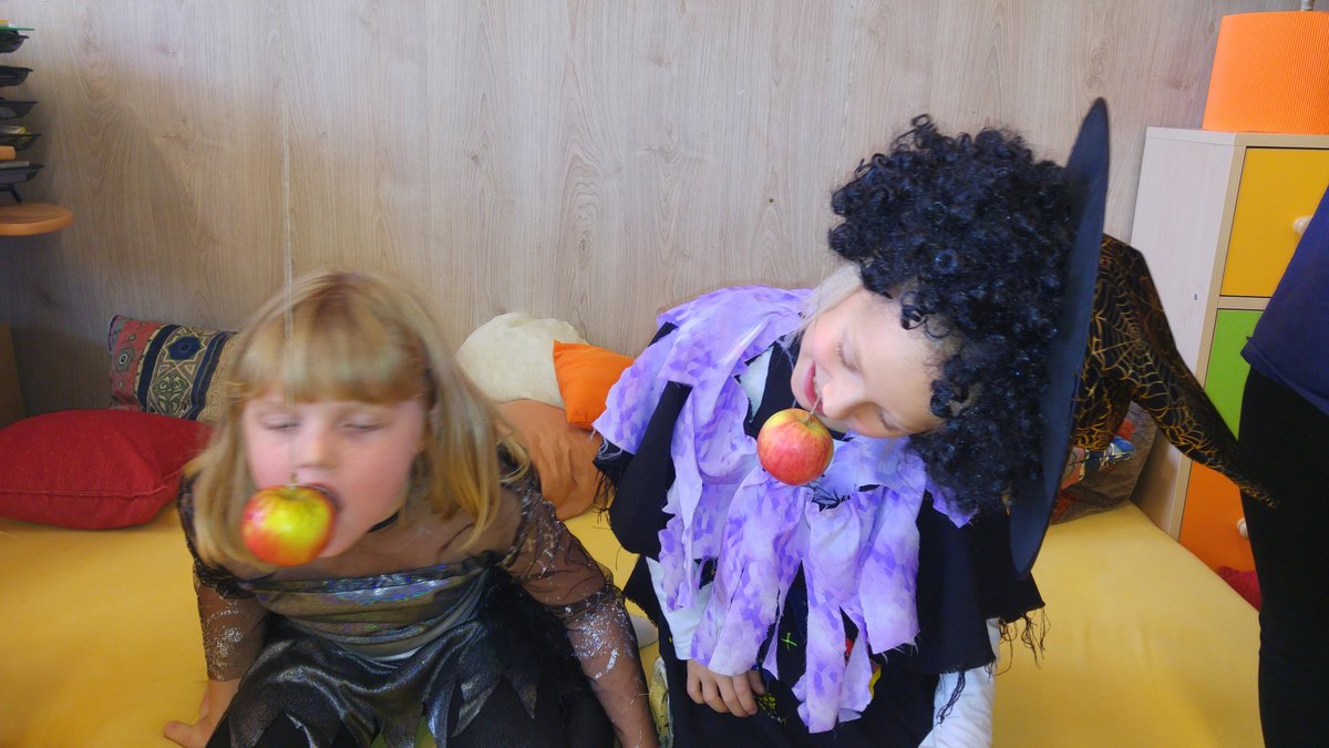 Soutěžní odpoledne bylo hodně veselé... Okusovali jsme houpací jablíčka, vázali jsme mumie, hráli bonbónovou honičku a dýňový bowling. Všichni jsme si odnesli malou odměnu na veselé strašení.
