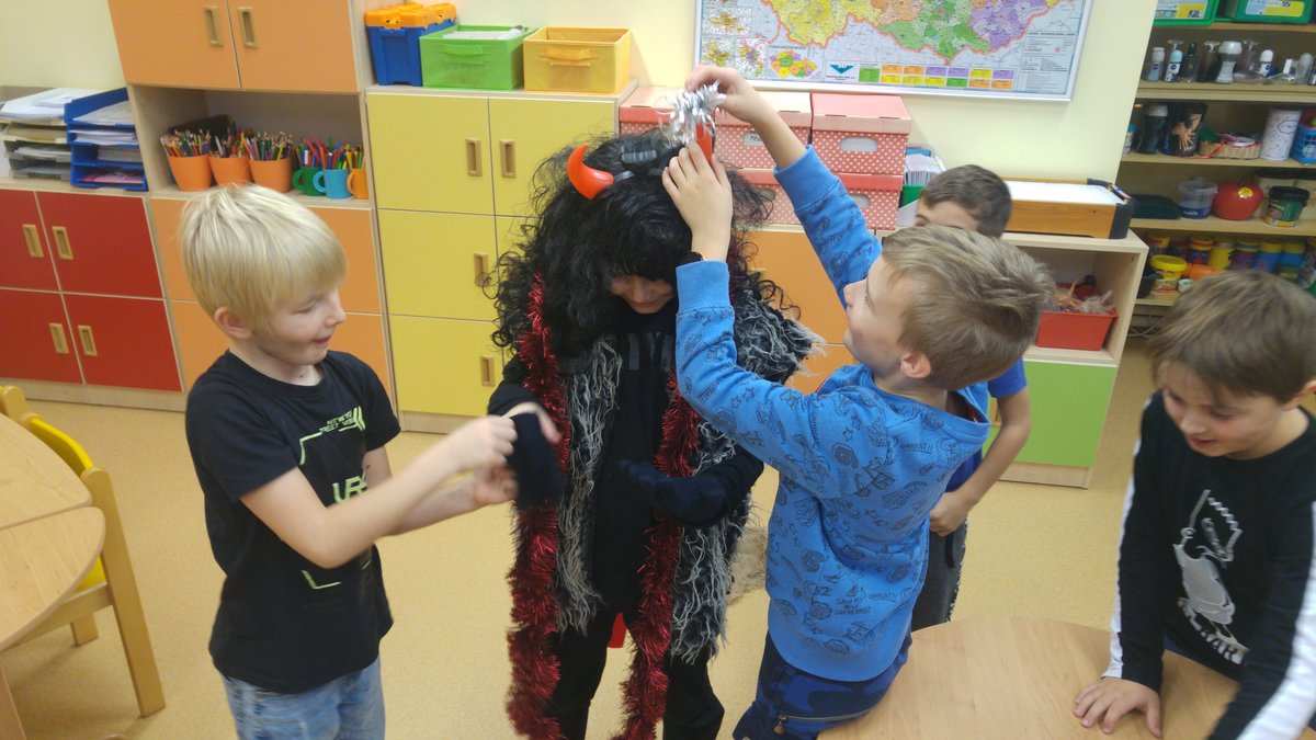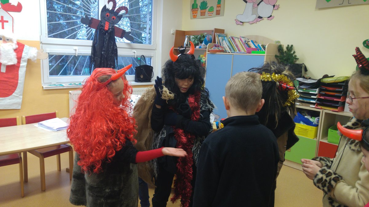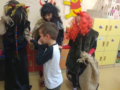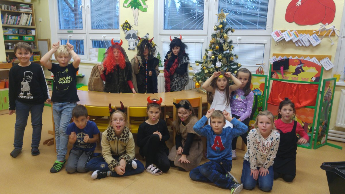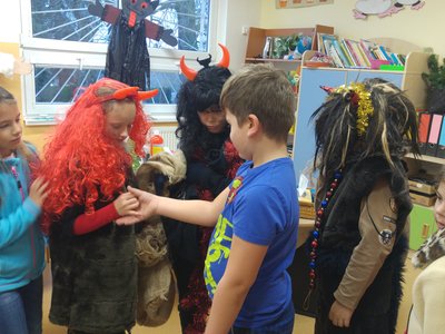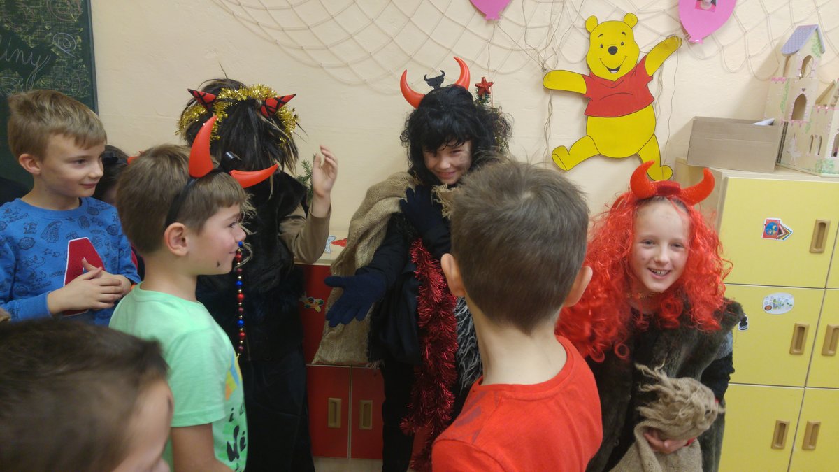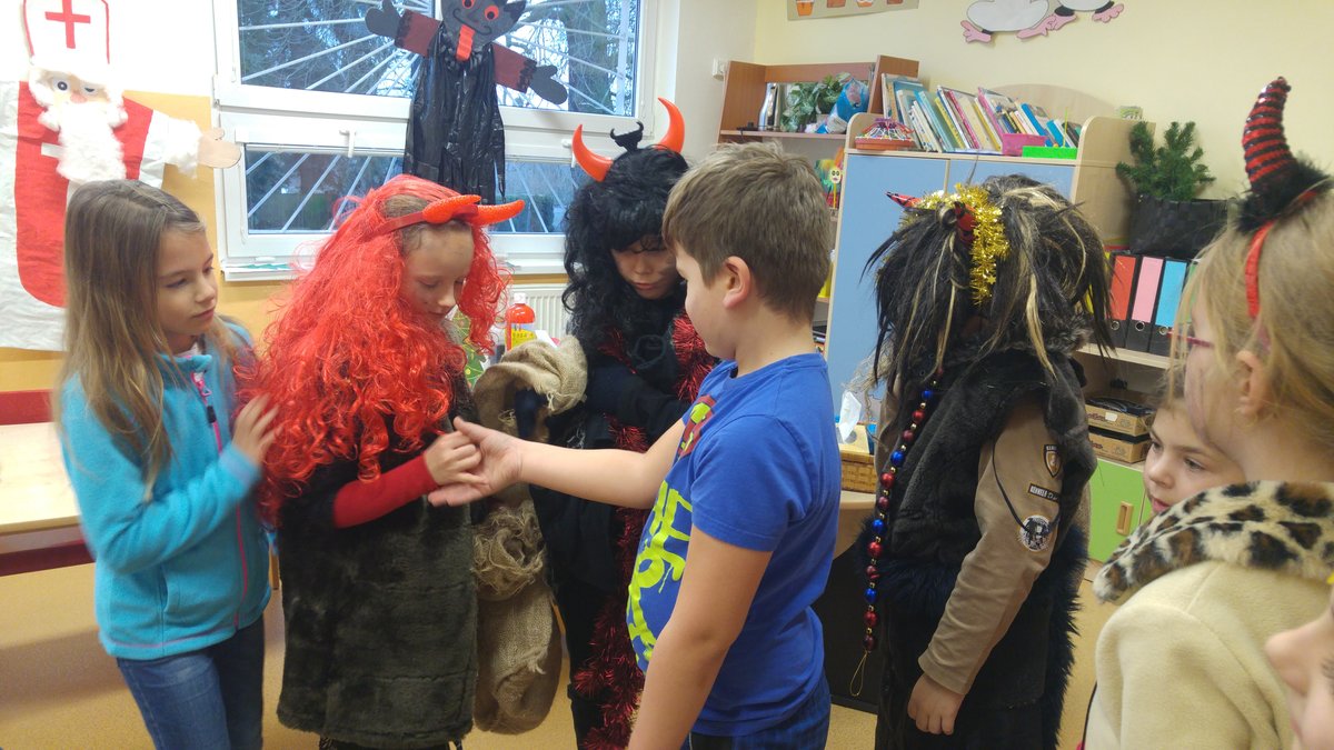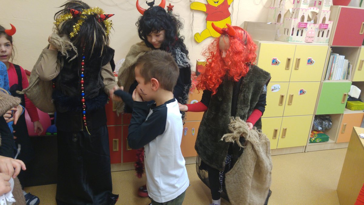Děti utvořily tři družstva a každé mělo za úkol vybrat z hromady potřebné převleky a vybraného "čerta" musely samy nastrojit. Zvládly to skvěle a když přišly k prvňáčkům, došlo i na slzy. Hříšníci ale slibili, že se polepší a čertíci jim zlobení odpustili.