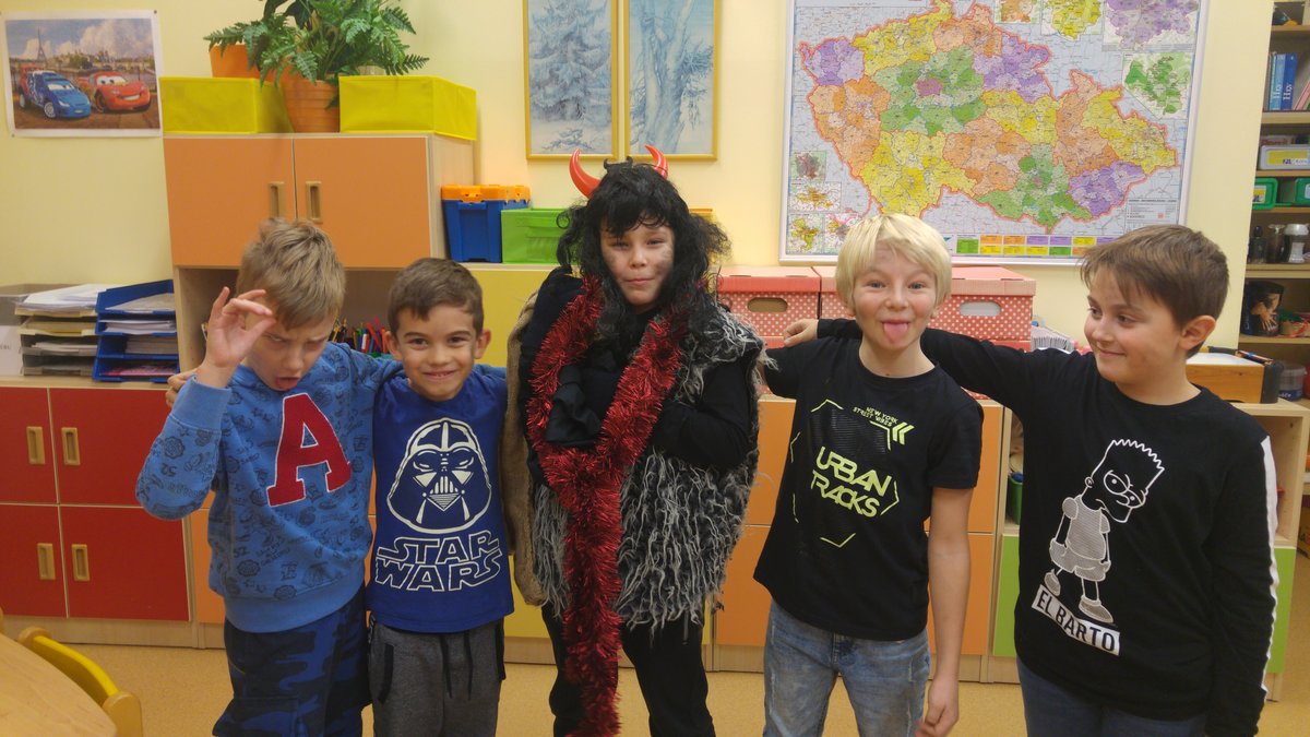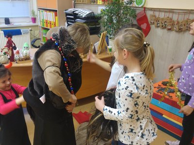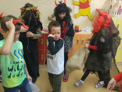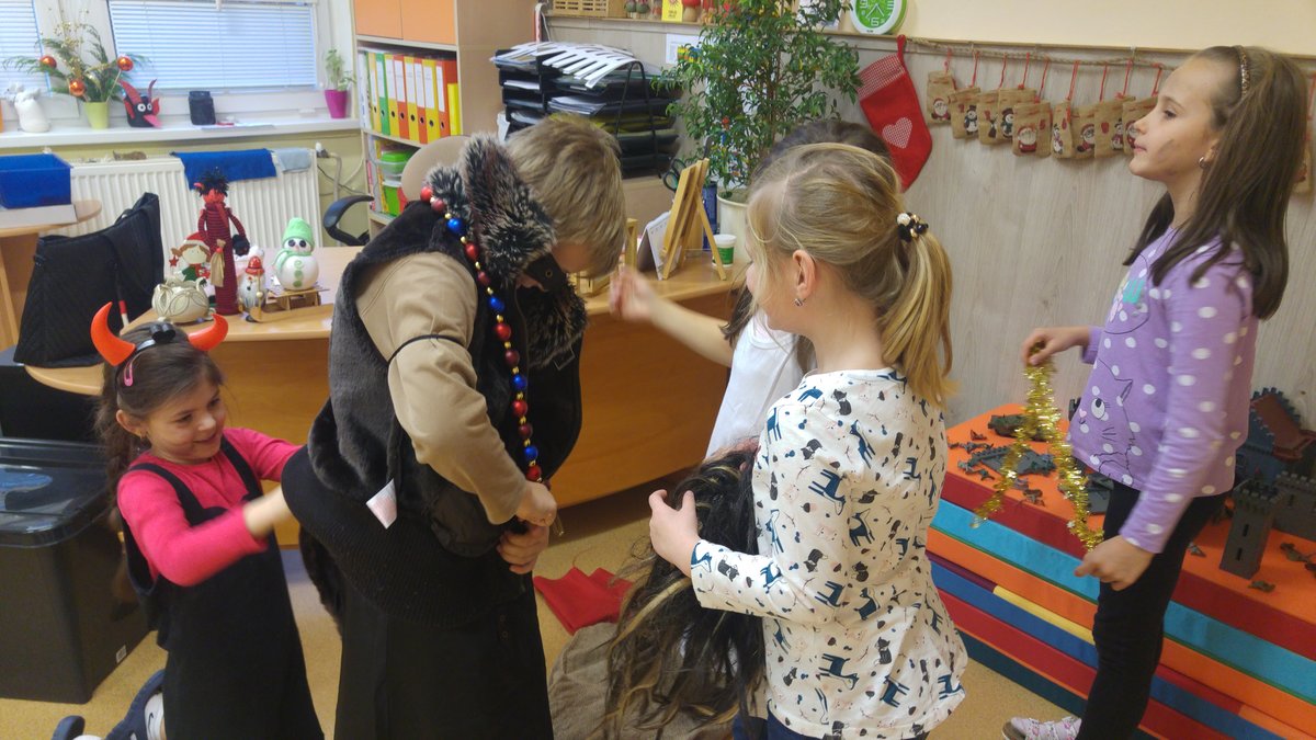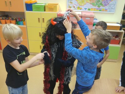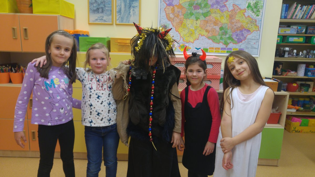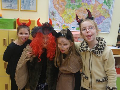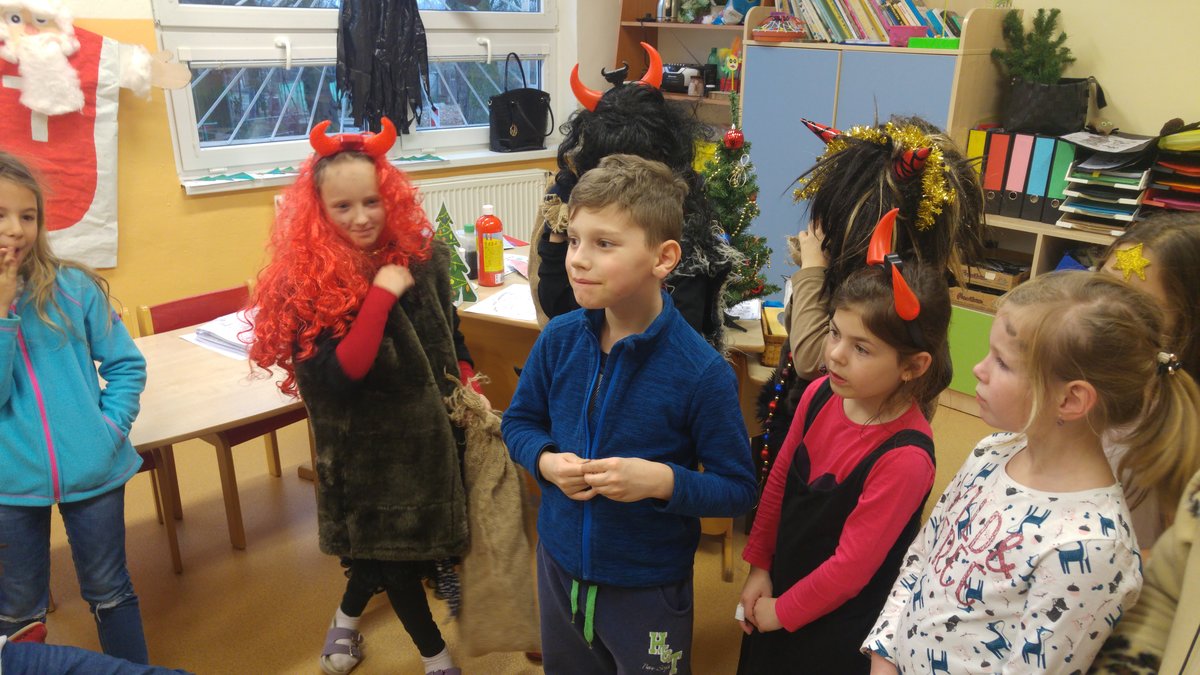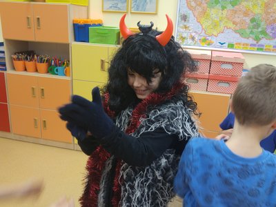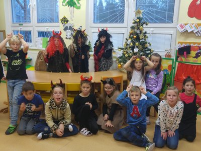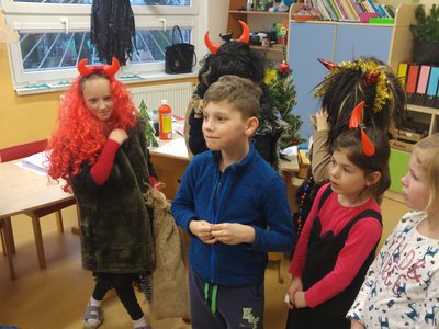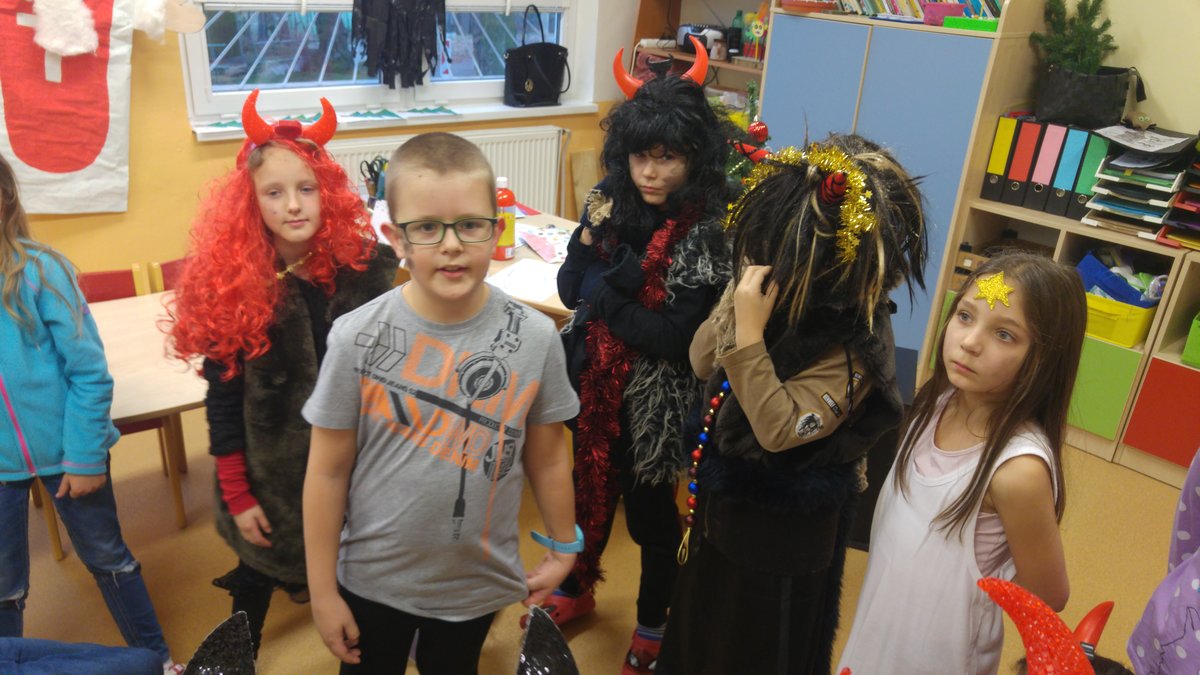 Děti utvořily tři družstva a každé mělo za úkol vybrat z hromady potřebné převleky a vybraného "čerta" musely samy nastrojit. Zvládly to skvěle a když přišly k prvňáčkům, došlo i na slzy. Hříšníci ale slibili, že se polepší a čertíci jim zlobení odpustili.
