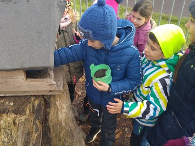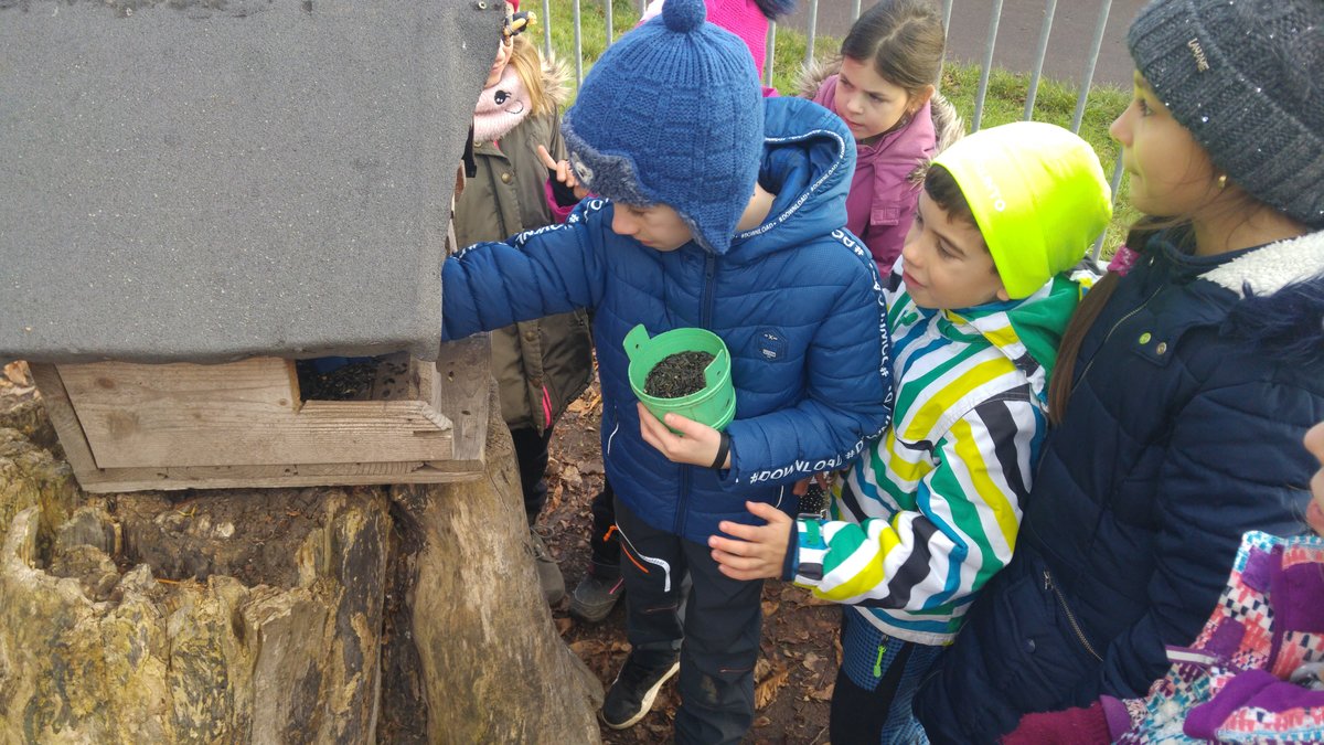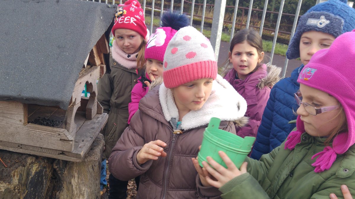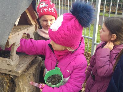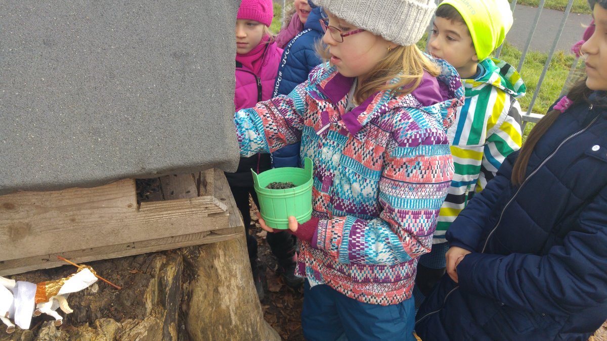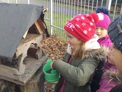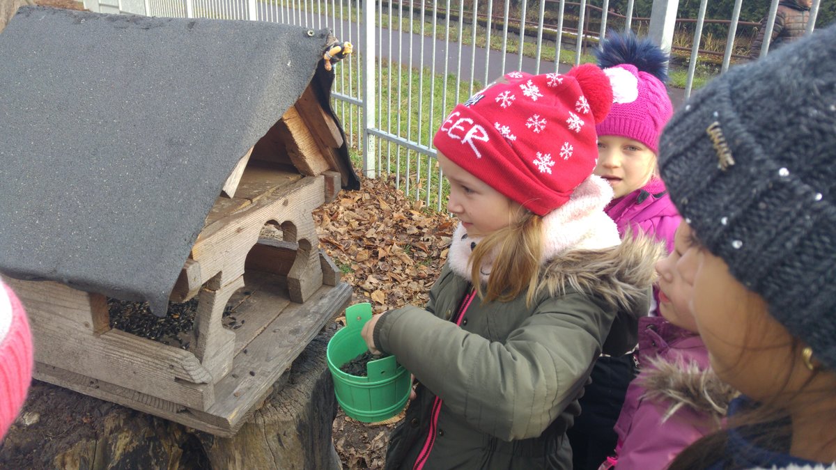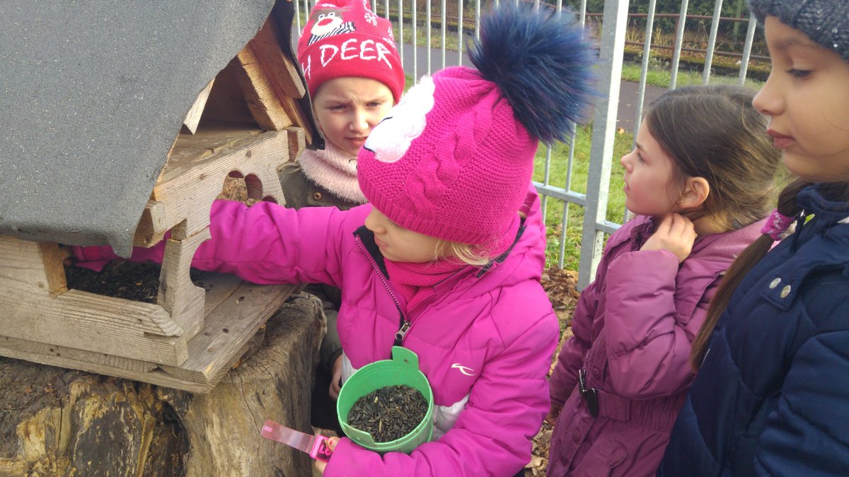Tatínek Elišky nám přinesl plný sud slunečnic a můžeme tak celou zimu krmit ptáčky. Dnes jsme jim nasypali poprvé a budeme pozorovat, jestli semínka budou ubývat.