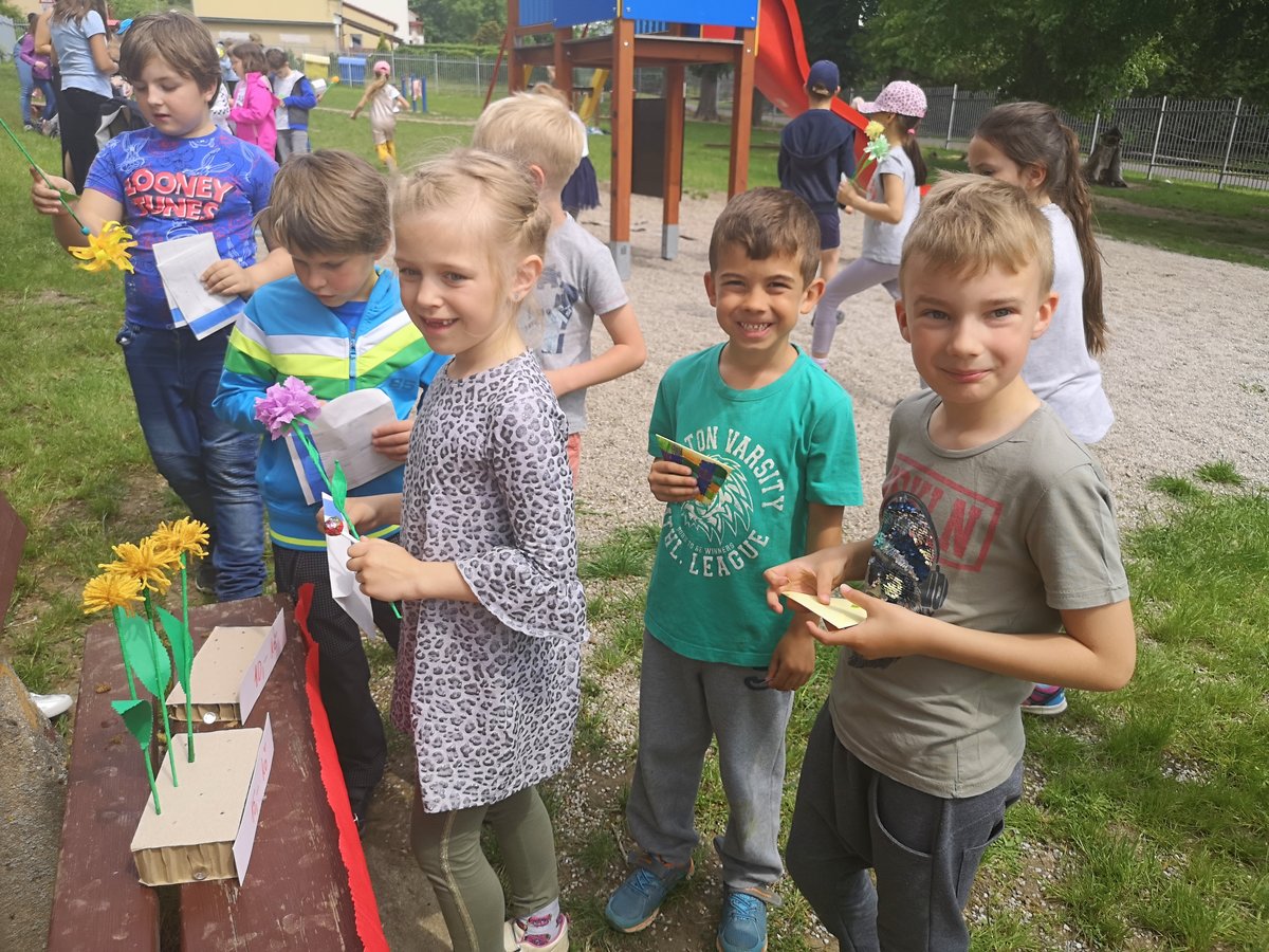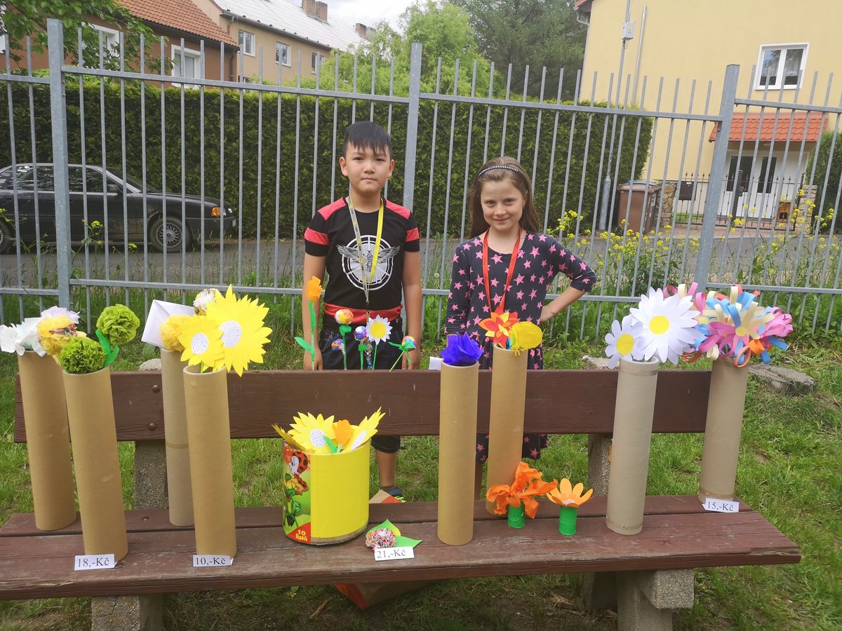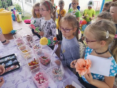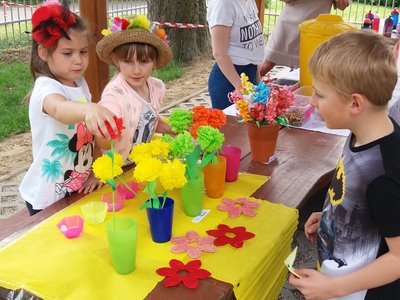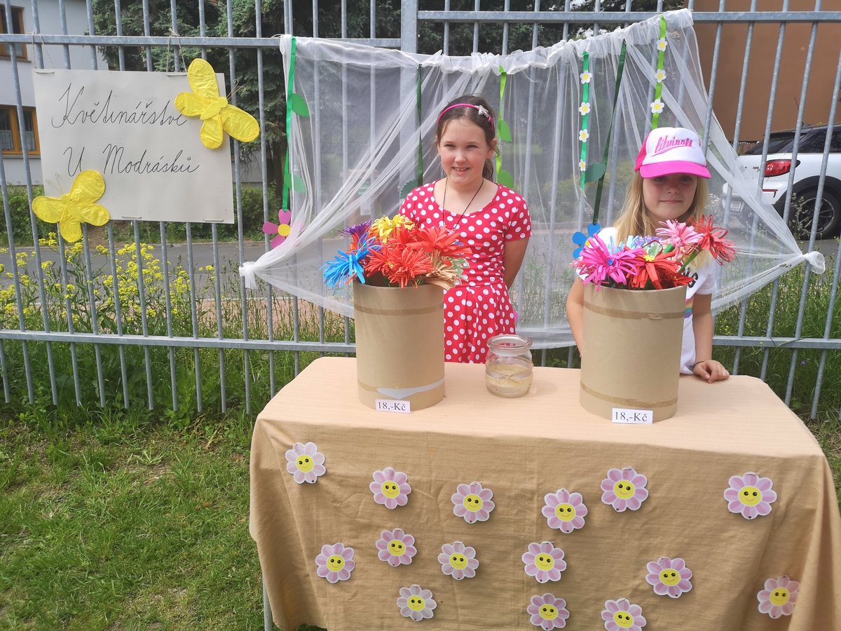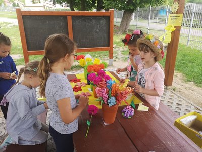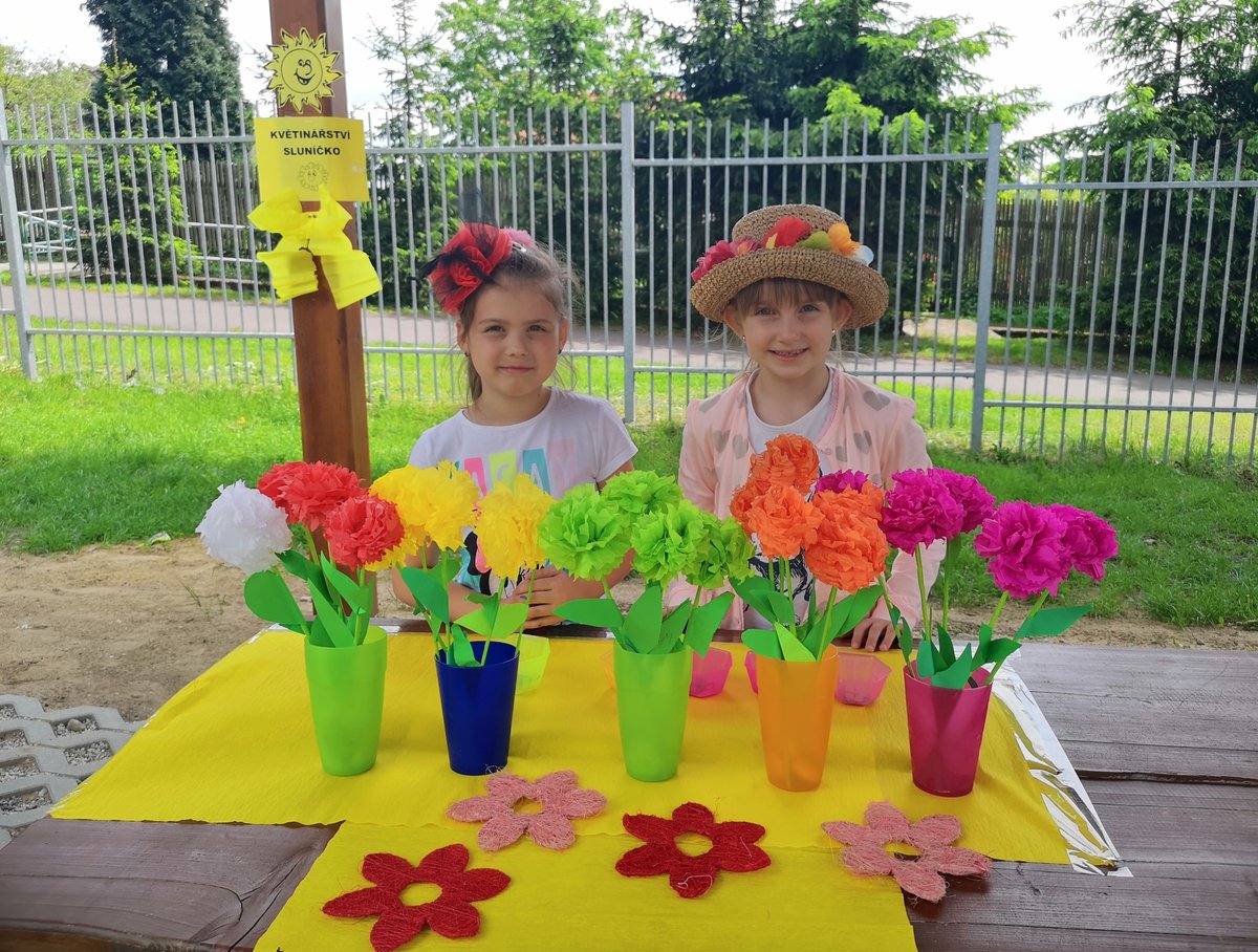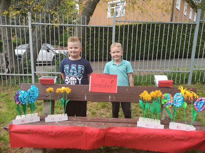 Celý týden jsme vyráběli květiny na prodej. Dnes si každé oddělení připravilo na zahradě stánek a všechny děti nakupovaly. Kdo neutratil peníze za kytičky, ten si mohl vybrat sladkosti v cukrárně. Všichni si tak procvičili matematiku
