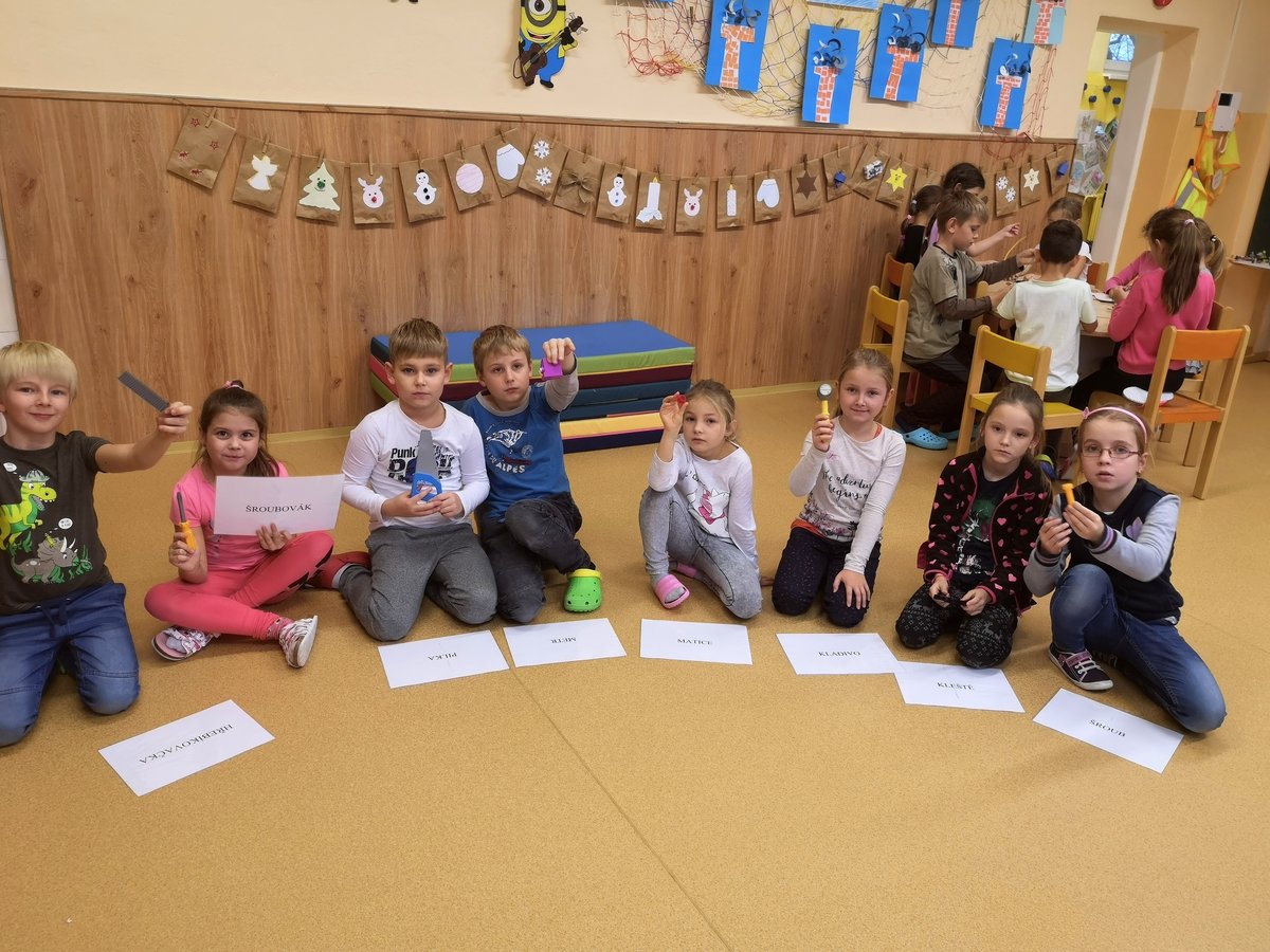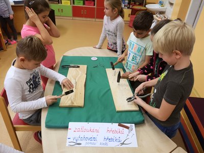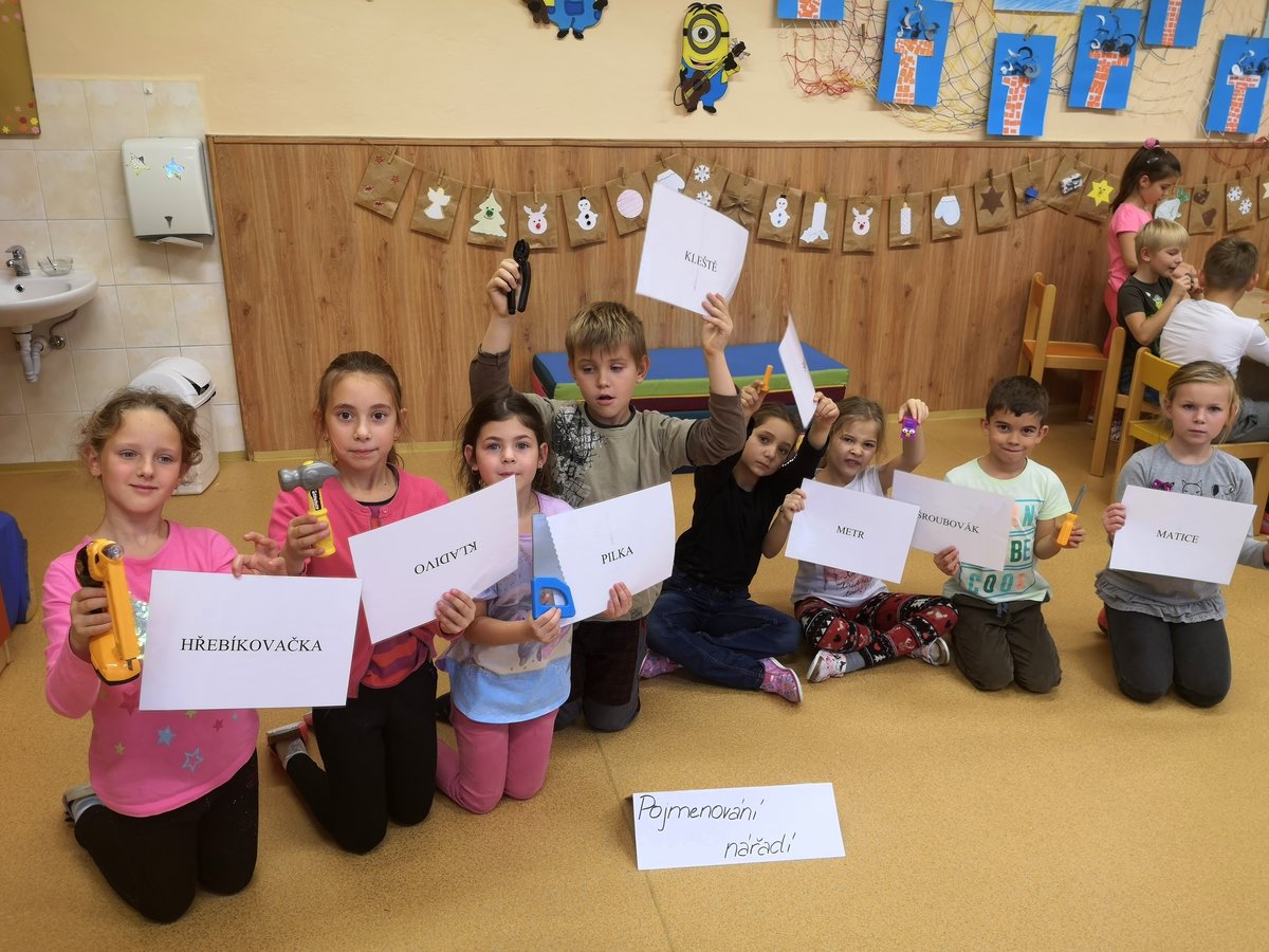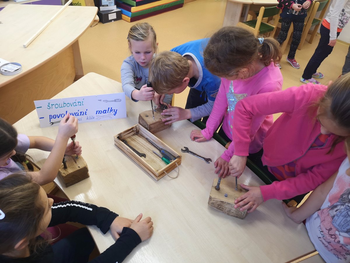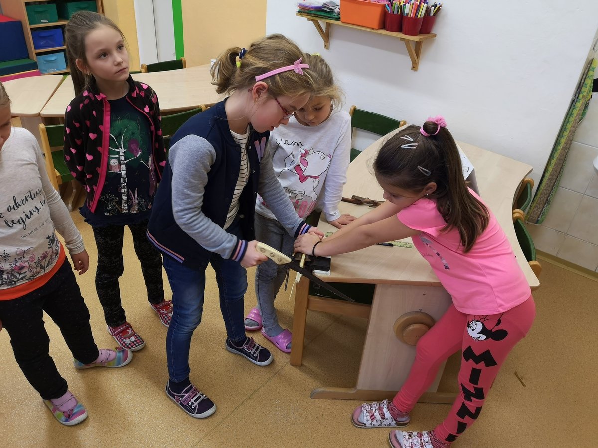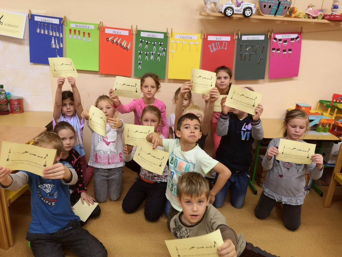 Dnes jsme prokázali svou zručnost při použití různých nářadí a pomůcek. Umíme například natřít plot, vystřihovat, uvázat tkaničku, zatloukat hřebíky, řezat pilkou, rozebrat a sestavit mlýnek na maso, navlékat nit i přišít knoflík. Za svou šikovnost jsme právem obdrželi diplom.
