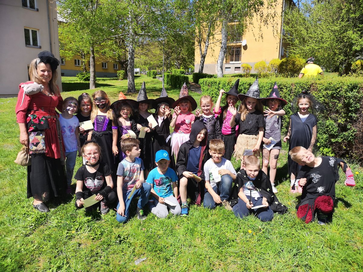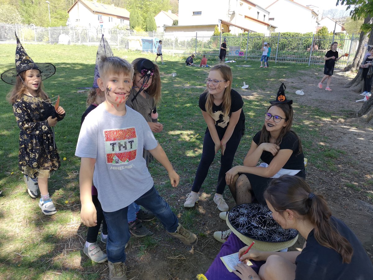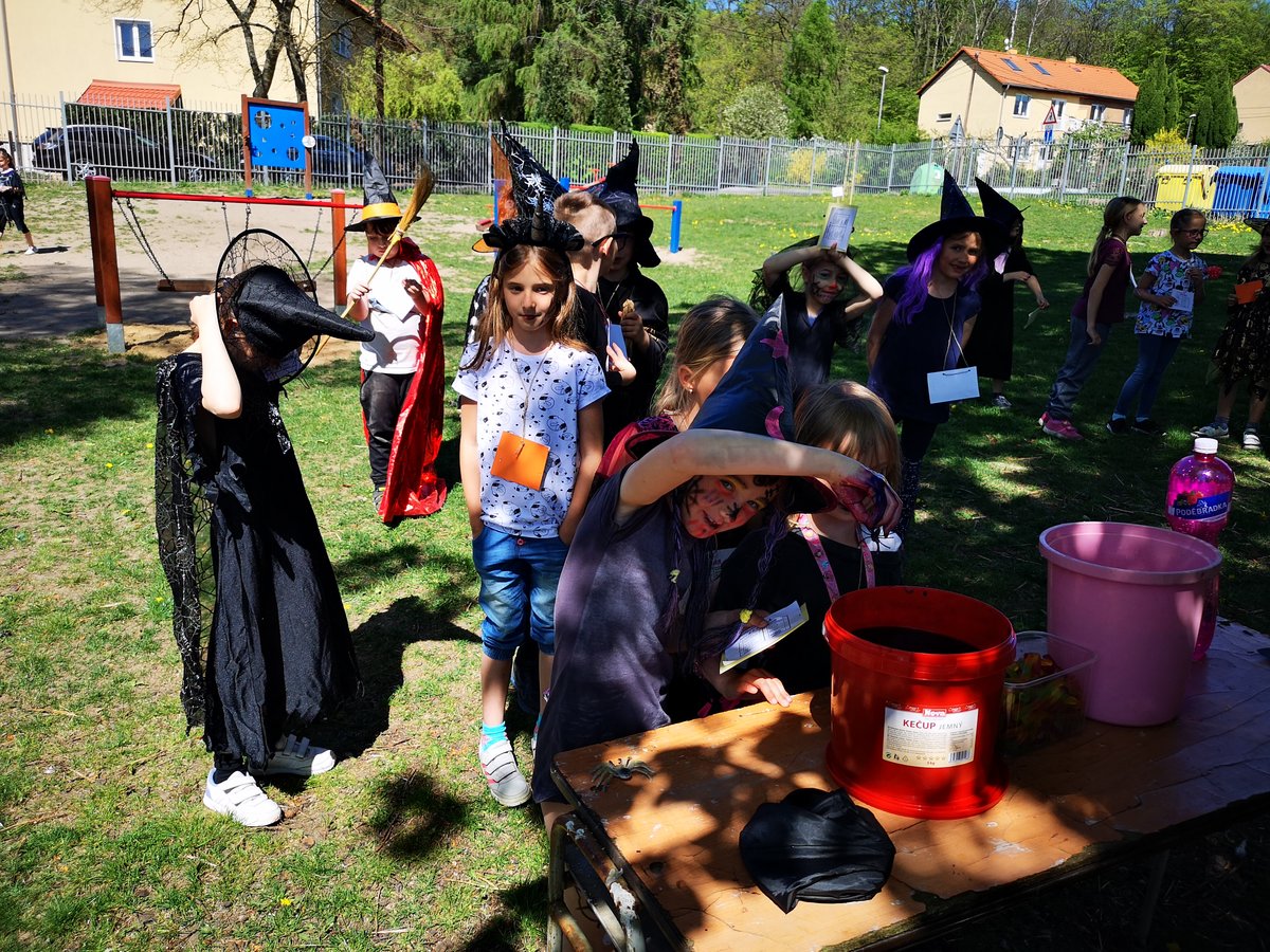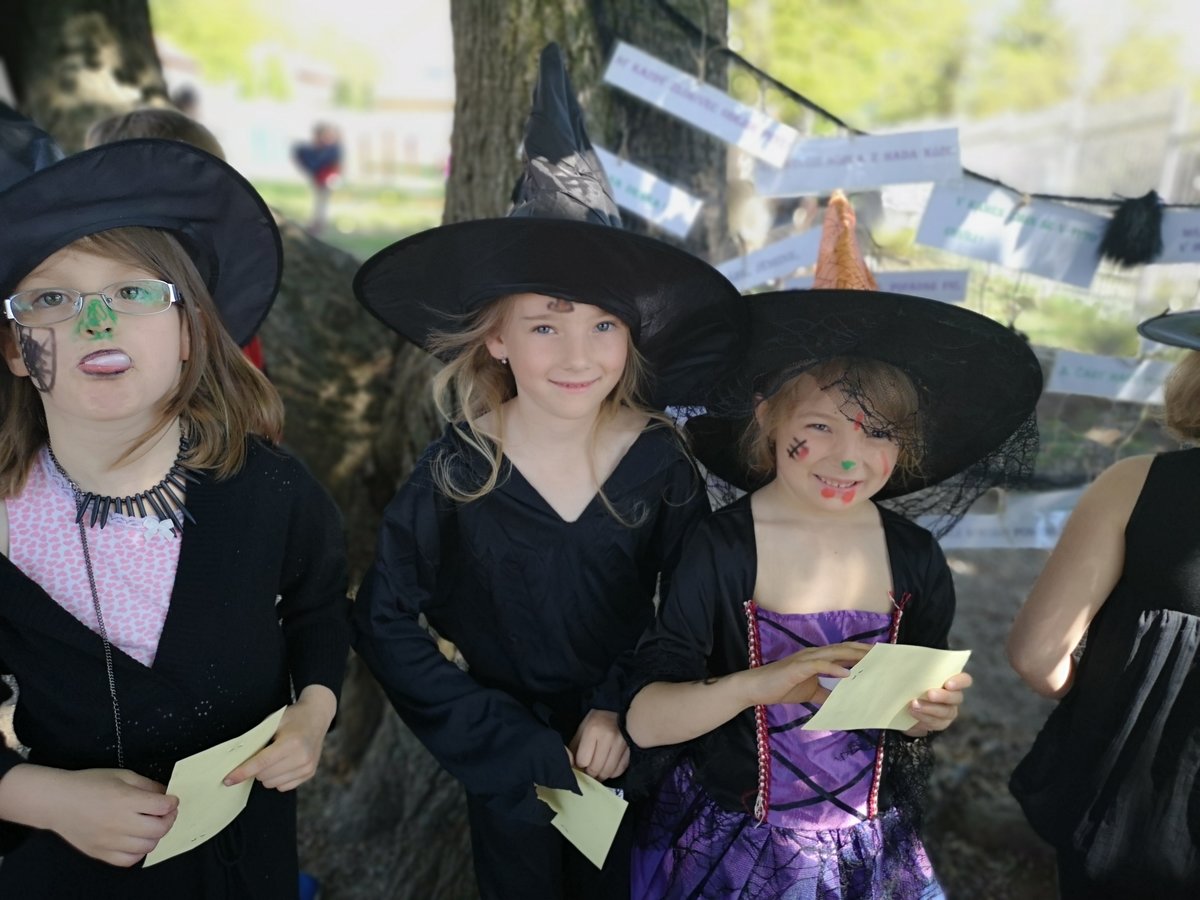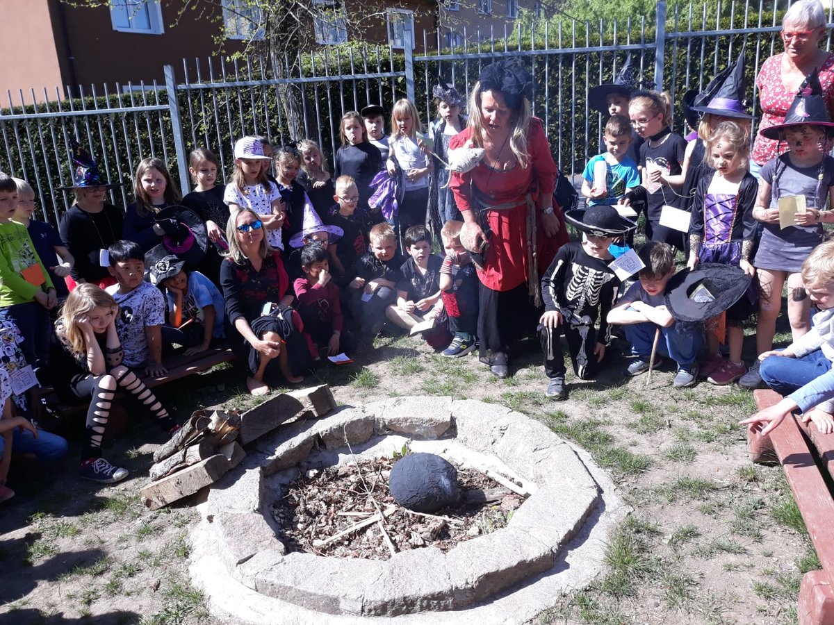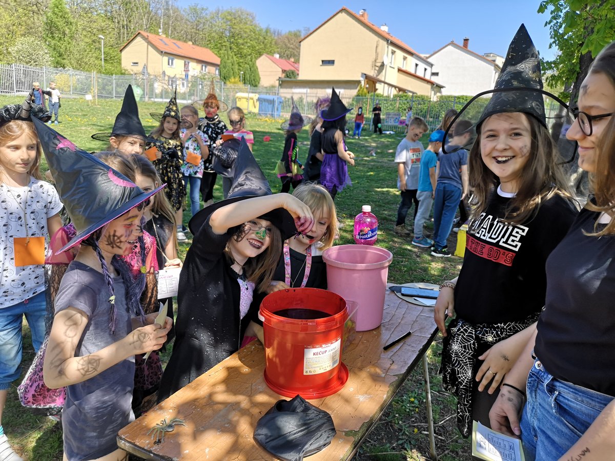 Dnešní počasí nám přálo a tak mohli všichni lovit pavouky, překusovat žížaly, lítat na koštěti a plnit ostatní úkoly. V závěru jsme spálili všechny špatné vlastnosti v černém vejci a zazpívali jsme si za doprovodu paní učitelky Martinky. Děkujeme paní učitelce a všem žákům z 5.C za přípravu stanovišť a obsluhu u jednotlivých úkolů.