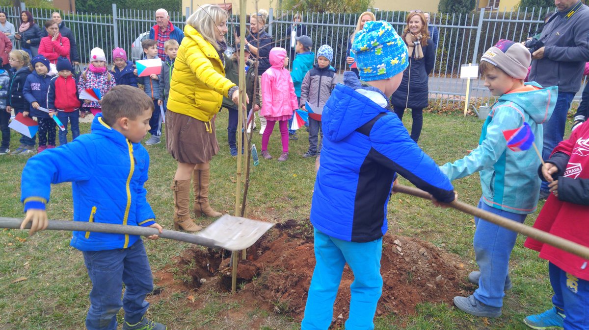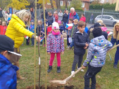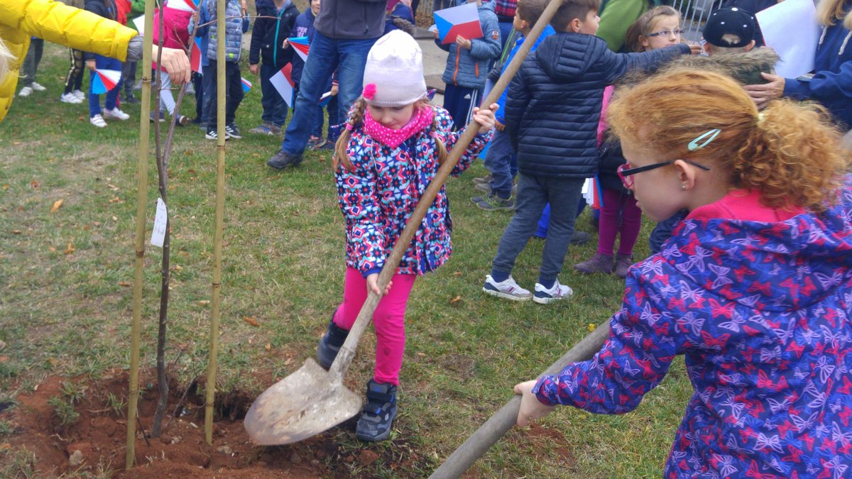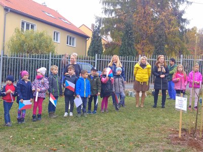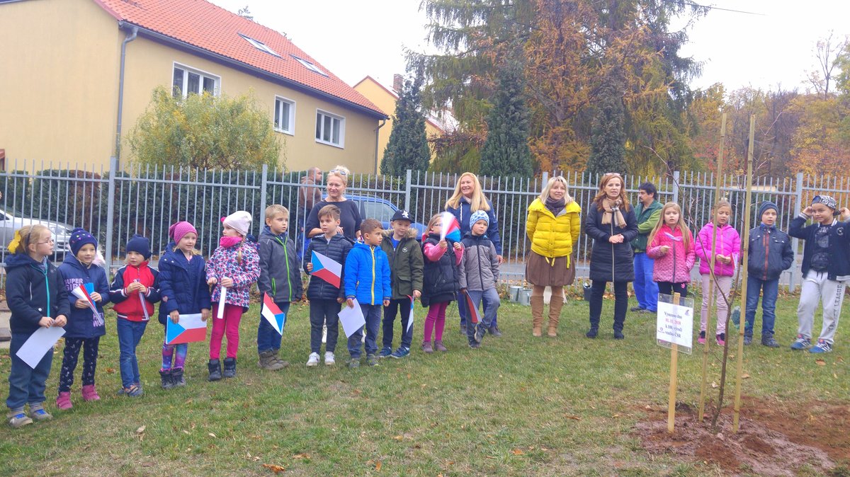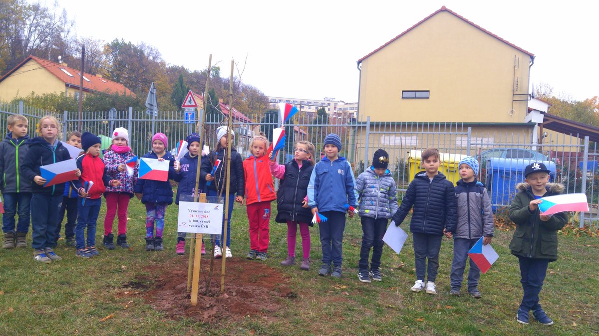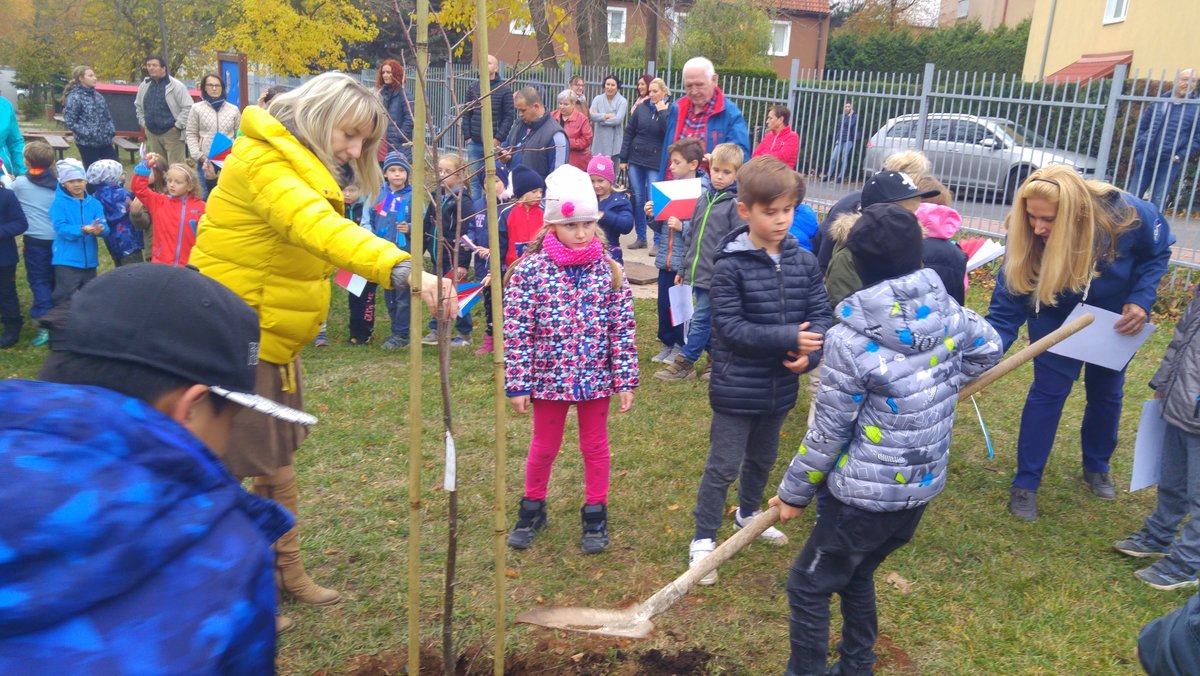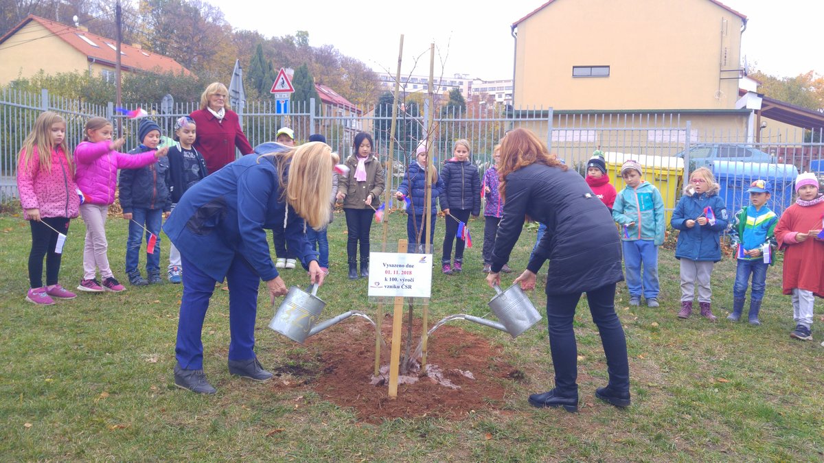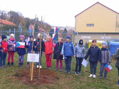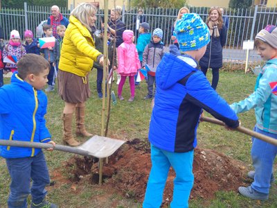 Dnes jsme zasadili náš národní strom, který budeme pravidelně zalévat a bude nám vždy připomínat 100leté narozeniny naší republiky.