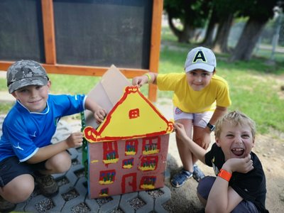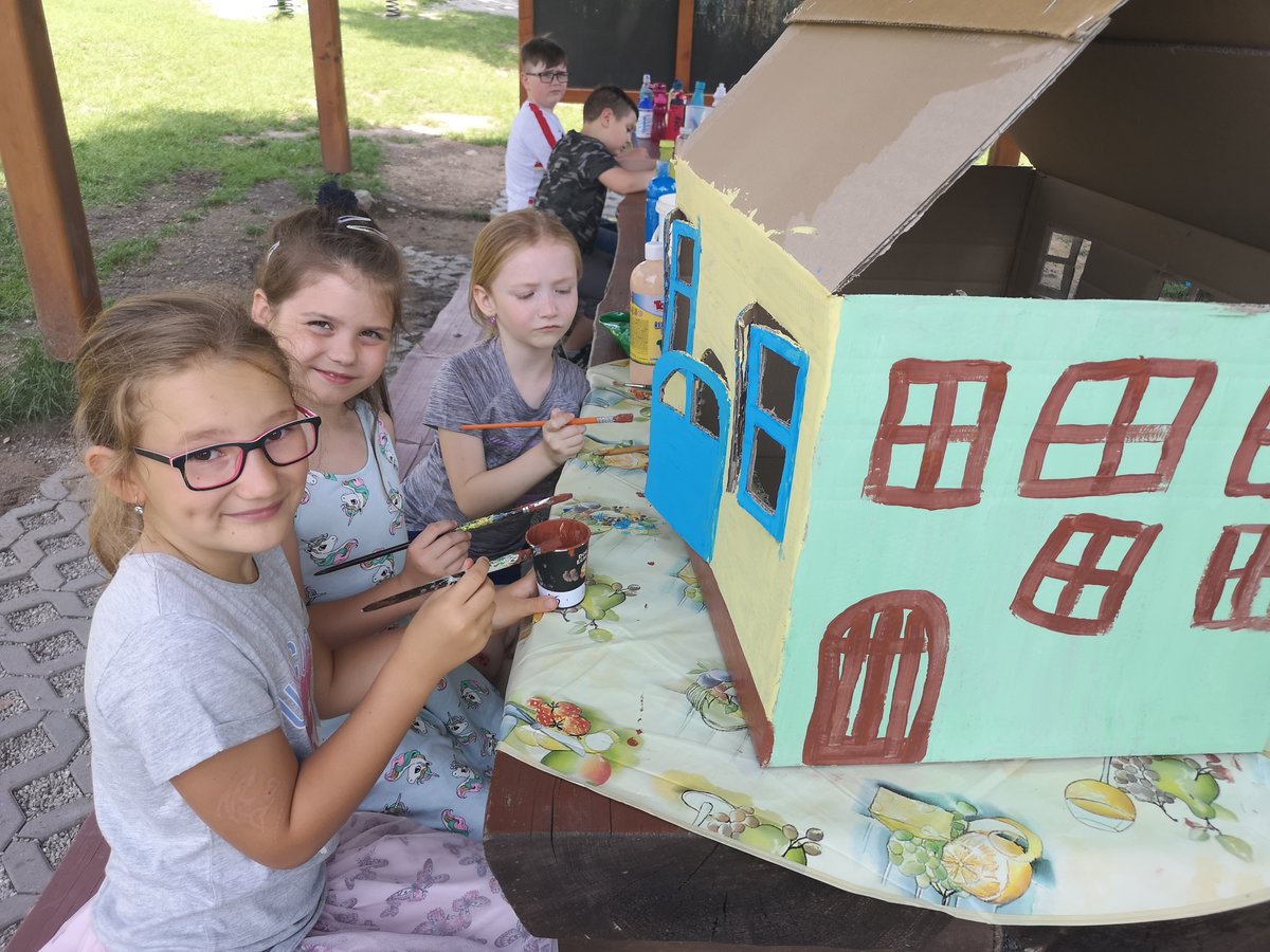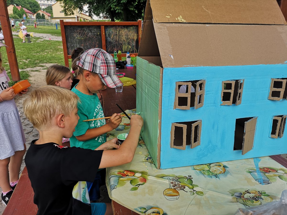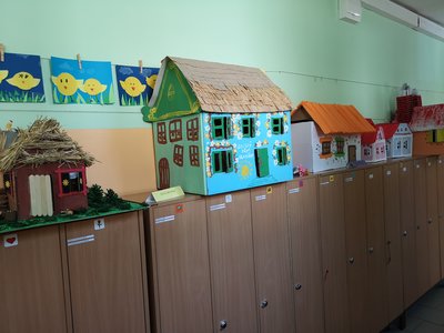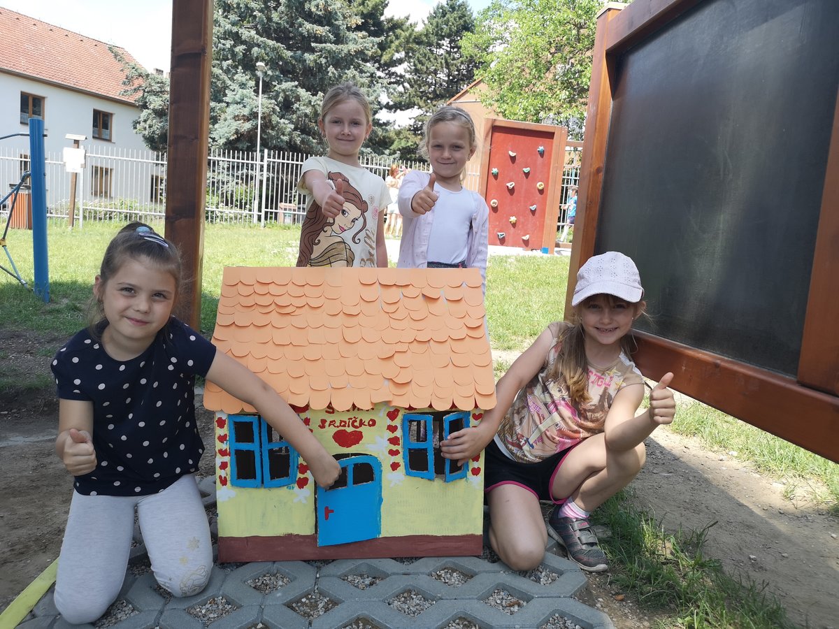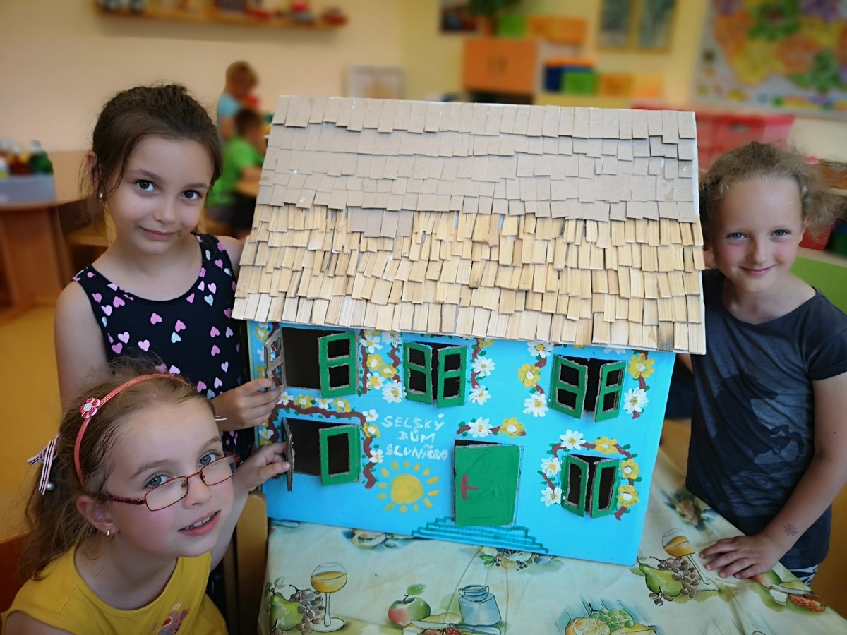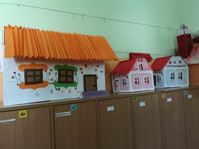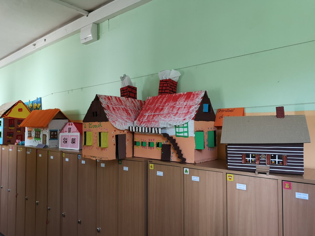 Porovnávali jsme domy moderní s těmi, ve kterých ještě bydleli babičky a dědečkové. Každá družinka vyrobila nějaký dům na výstavu a krášlí nám šatnu družinky.