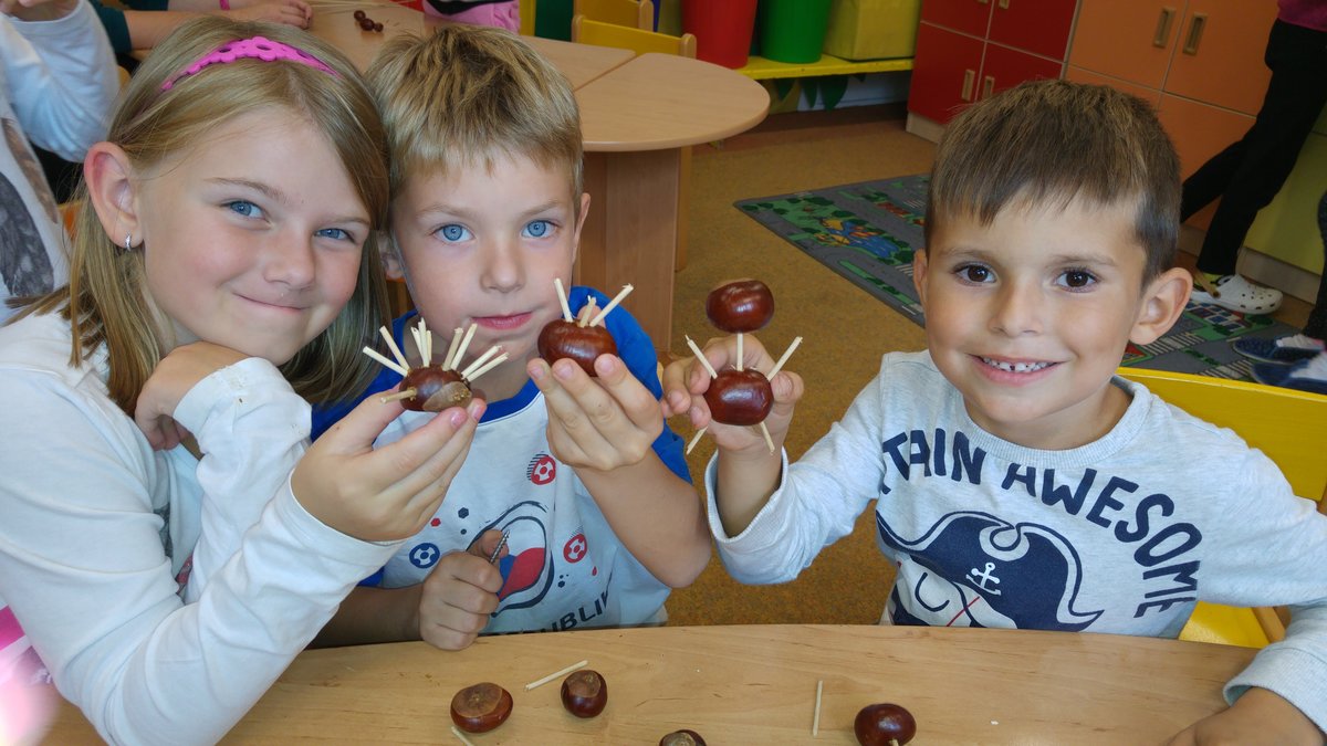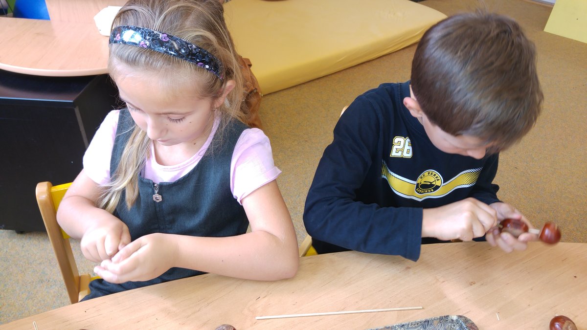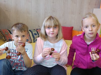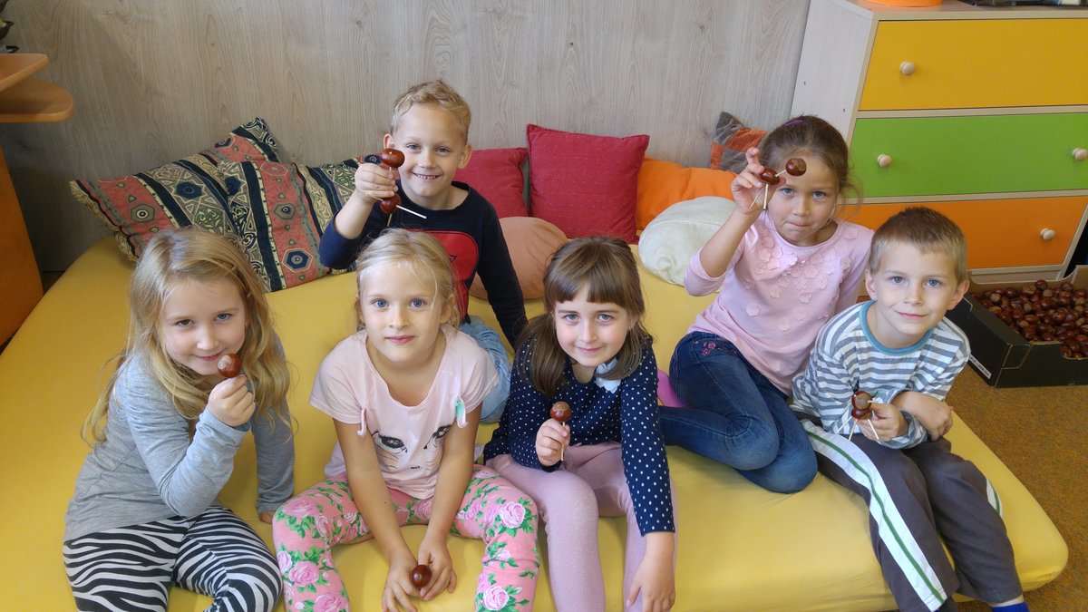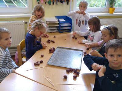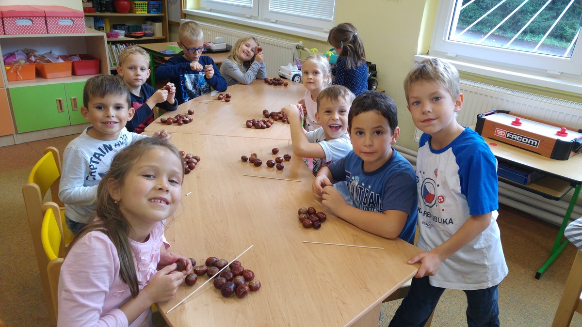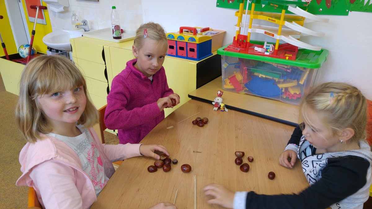 Podzim převzal vládu a kaštany nám spadaly. Protože jsme jich nasbírali spoustu, využili jsme je pří výrobě zvířátek a postaviček k pohádce O Smolíčkovi...