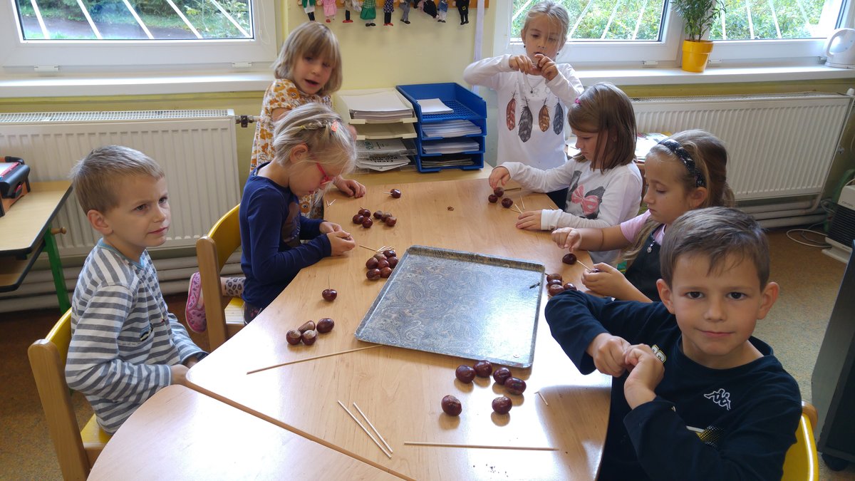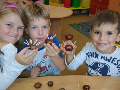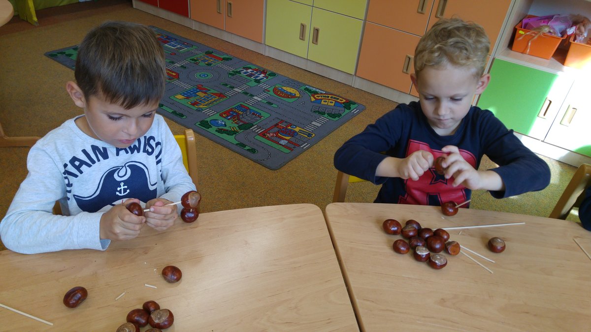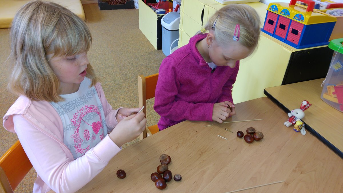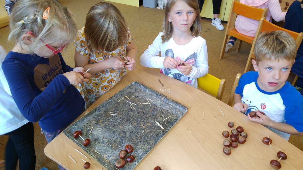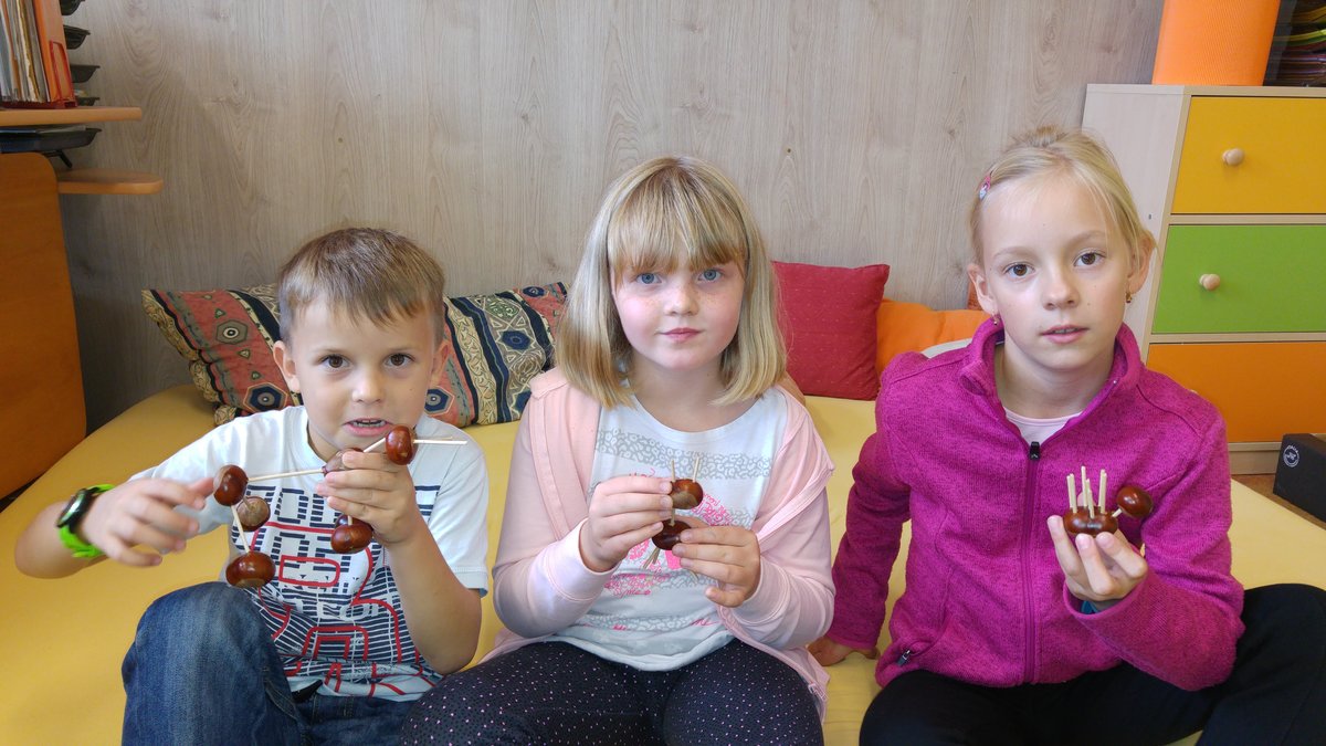 Podzim převzal vládu a kaštany nám spadaly. Protože jsme jich nasbírali spoustu, využili jsme je pří výrobě zvířátek a postaviček k pohádce O Smolíčkovi...