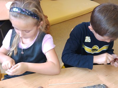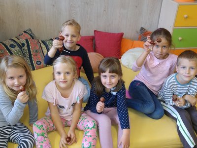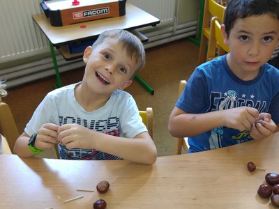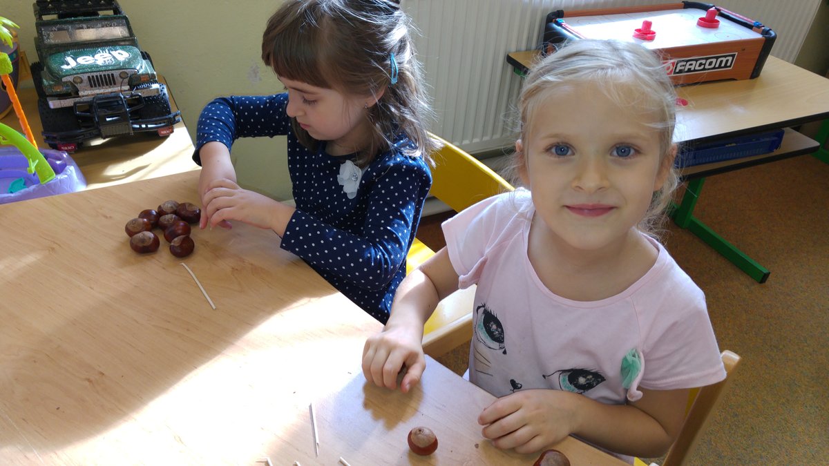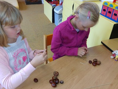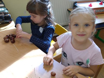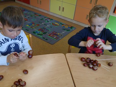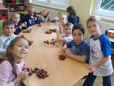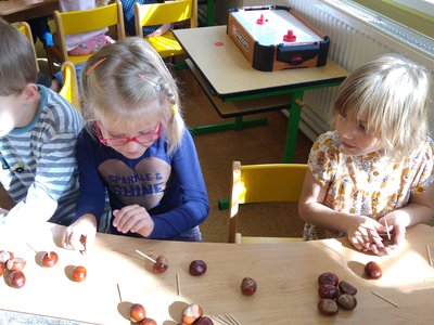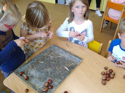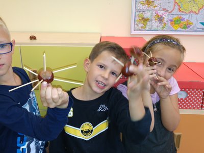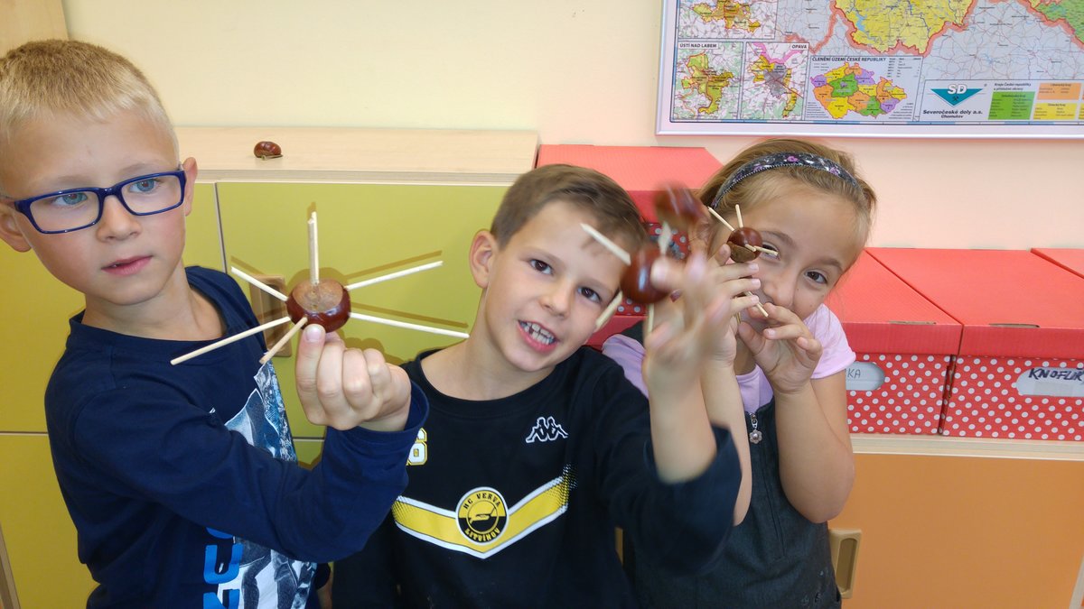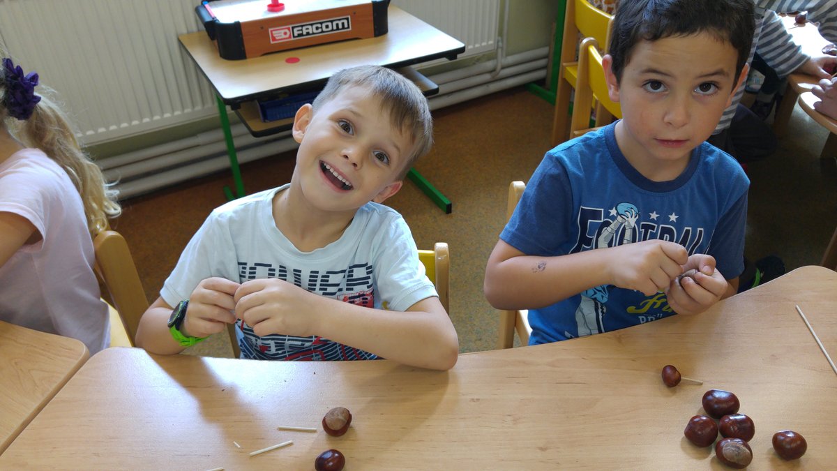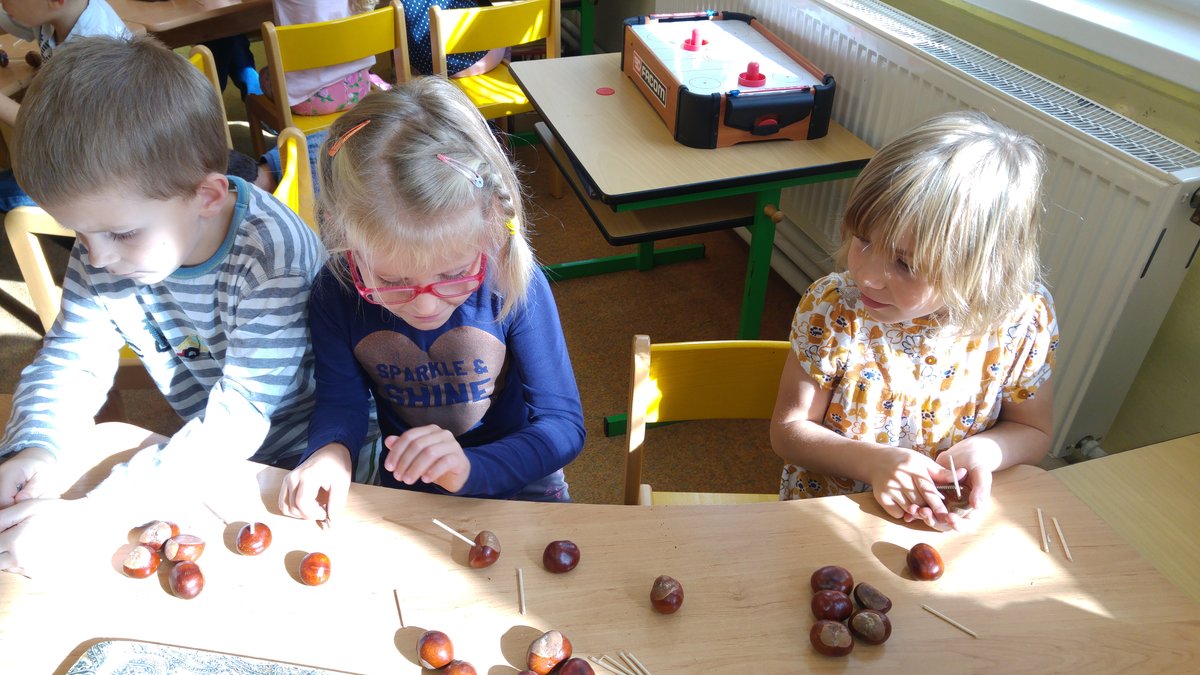 Podzim převzal vládu a kaštany nám spadaly. Protože jsme jich nasbírali spoustu, využili jsme je pří výrobě zvířátek a postaviček k pohádce O Smolíčkovi...