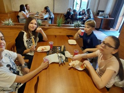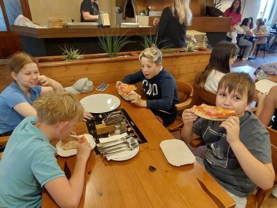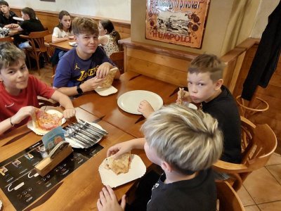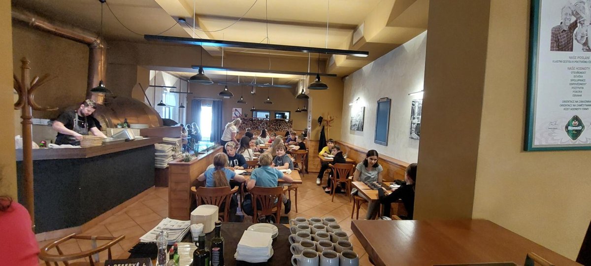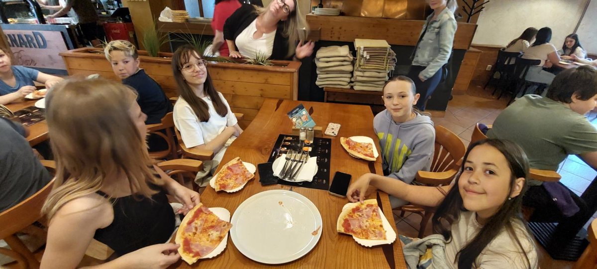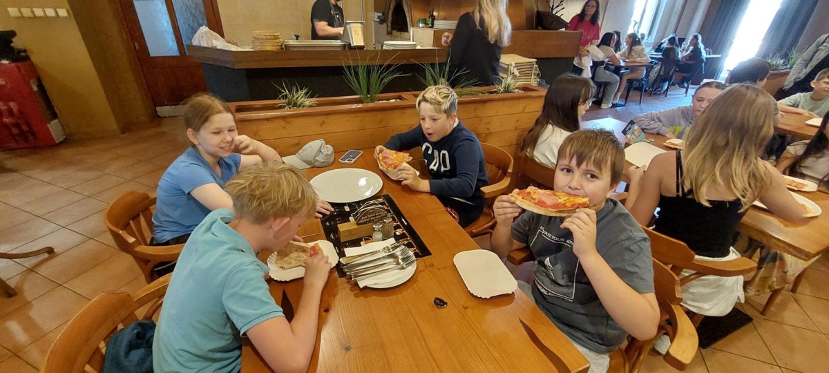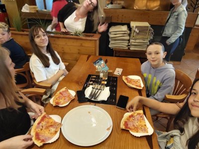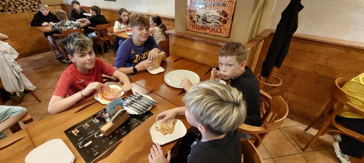 Blíží se nám konce školního roku a v průběhu 1.stupně jsme toho dokázali víc než dost. Dokonce i pizzu jsme si upekli. Děti netušily, co je dnes čeká. Překvapením byla pizza a malinovka, která na ně čekala v restauraci Bernard. Tímto děkujeme majiteli, že nám takové překvapení umožnil.