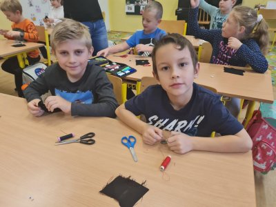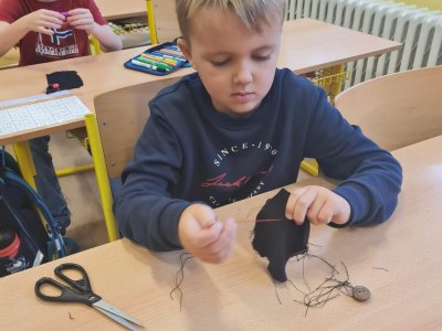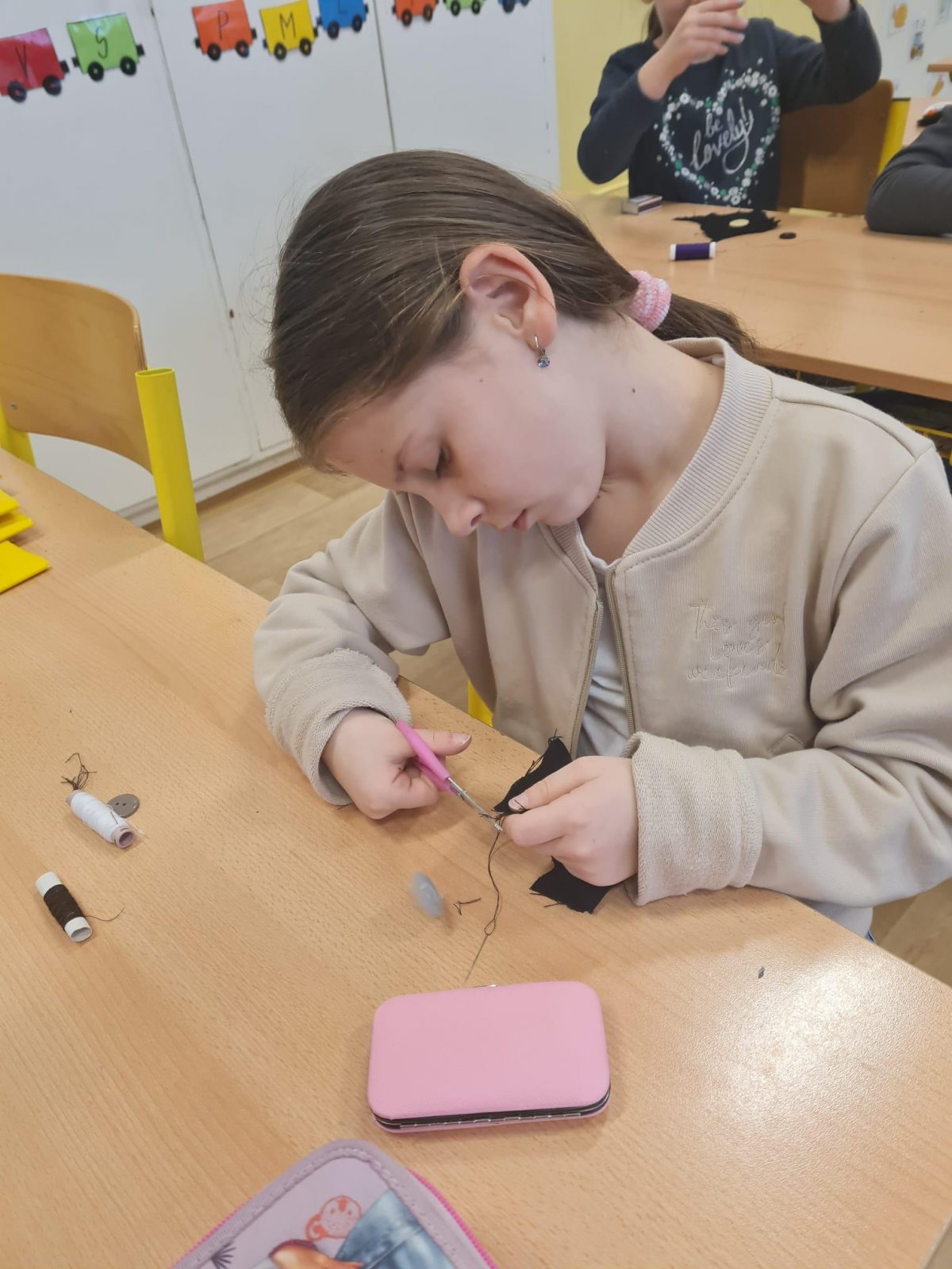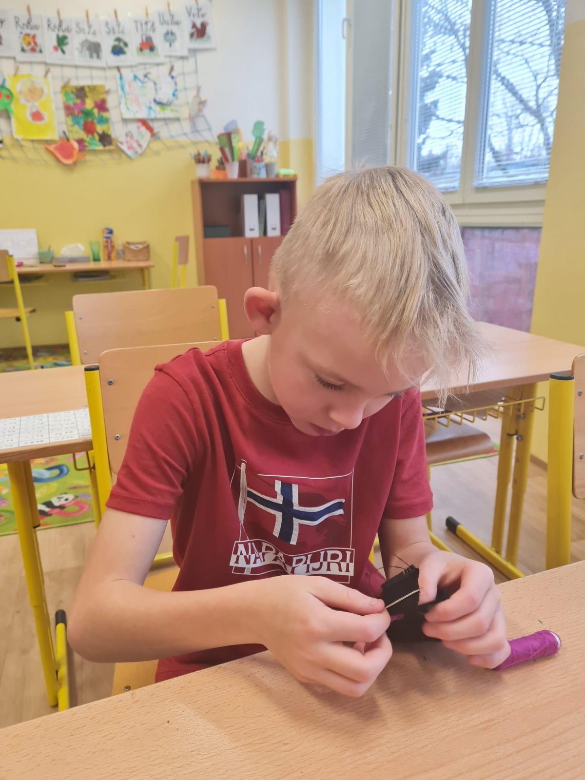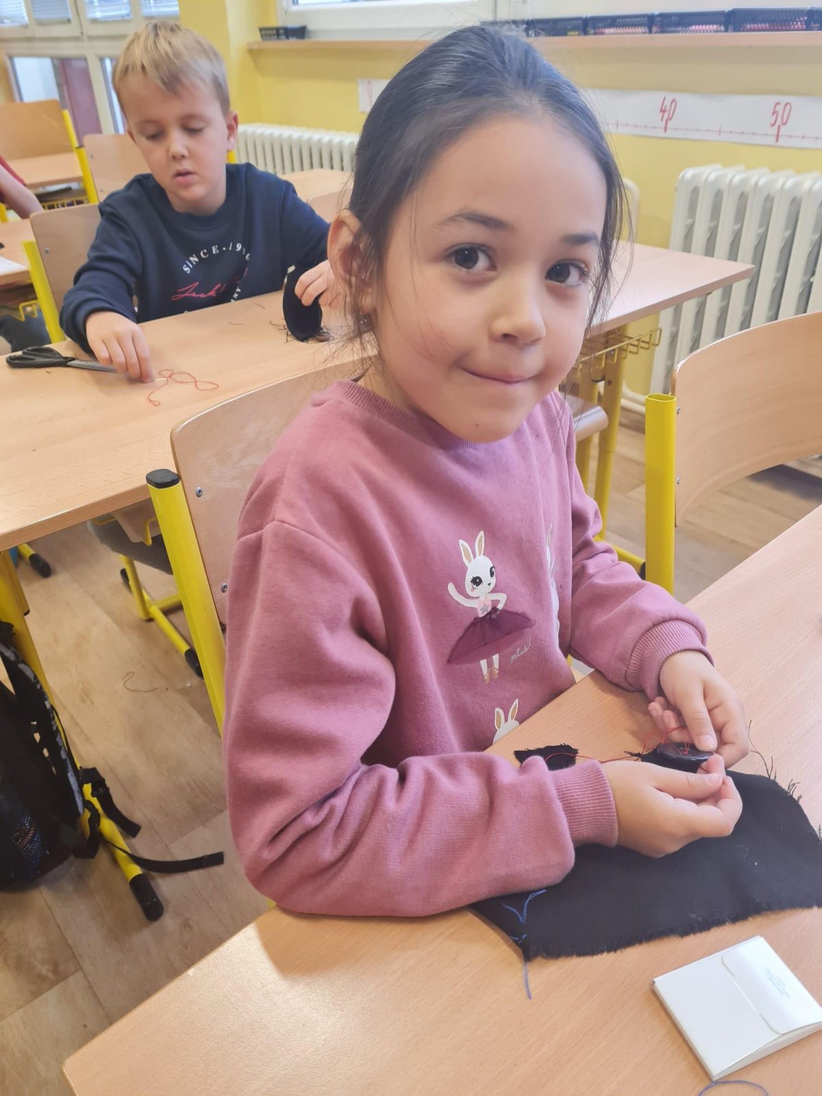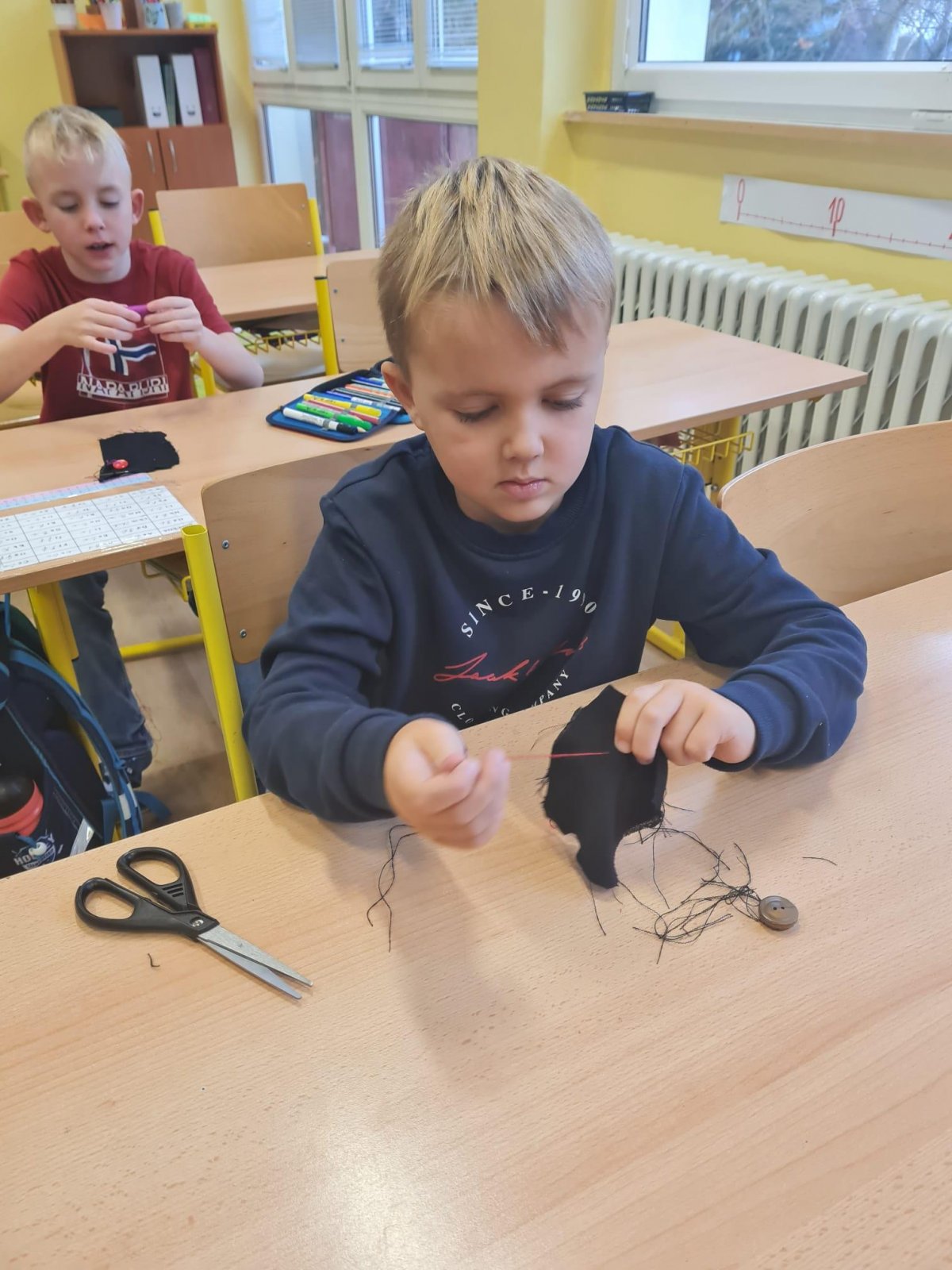 Dnes jsme se odvážně pustili do přišívání knoflíků. Došlo na pár propíchnutých prstíků, ale žádná Růženka neusnula. Myslím, že první seznámení s jehlou dopadlo na výbornou.