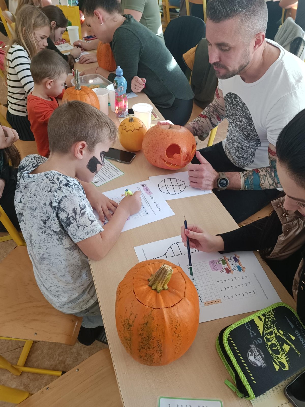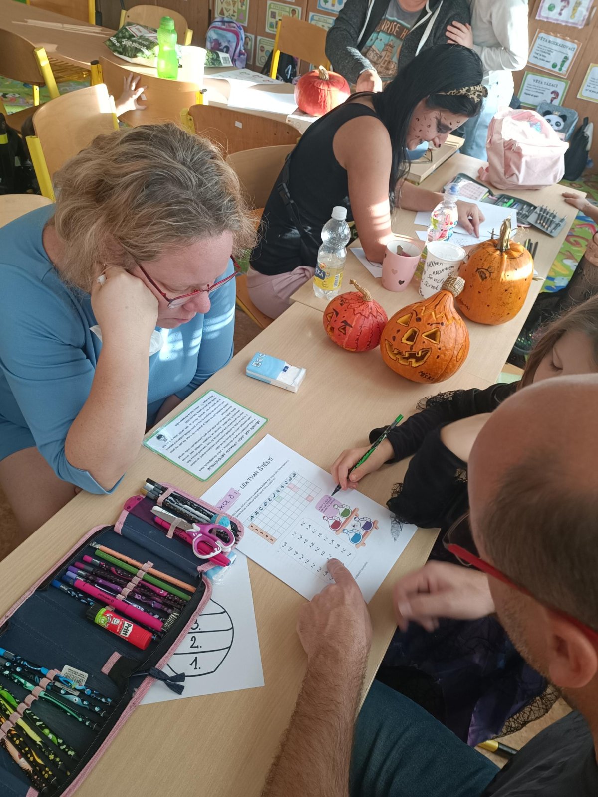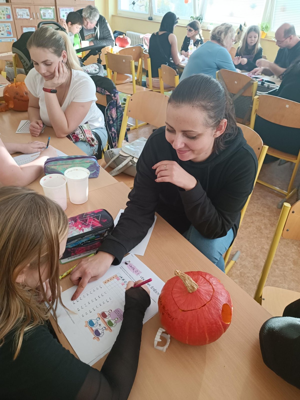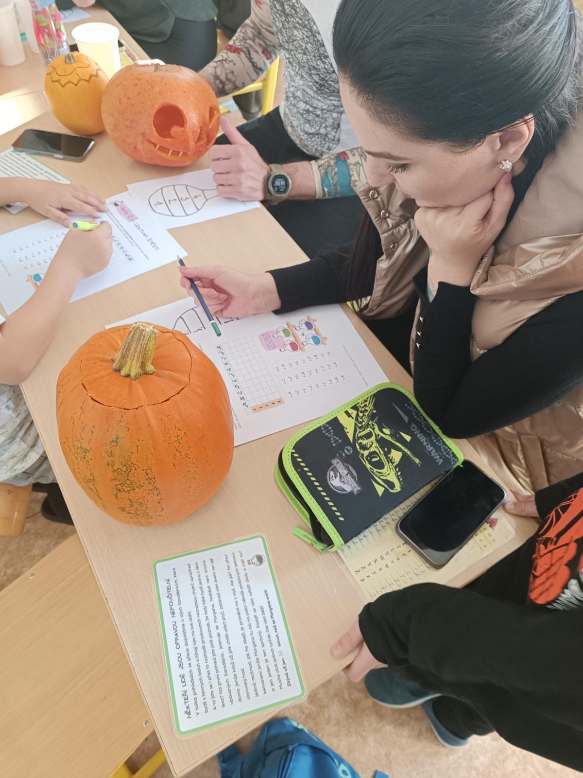 a dýně. Nejprve jsme si všichni povídali o Halloweenu, jeho zvycích a symbolech. Nezapomněli jsme ani na náš český svátek – Památka zesnulých. V duchu těchto dvou svátků se neslo celé vyučování. Žáci museli uniknout ze třídy a zachránit se před děsivou jeptiškou (paní učitelkou), následovala bojová hra, kde si vyzkoušeli své znalosti o strašidlech. Nezapomněli jsme ani na počítání netopýrů, vyzdobení hradu podle zadání a dušičkové zdobení hrobů.