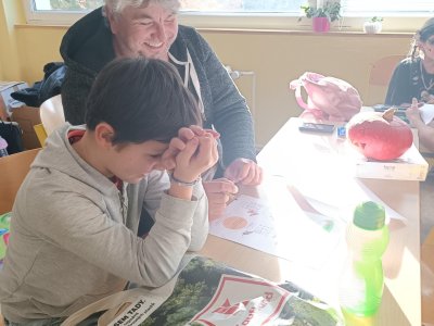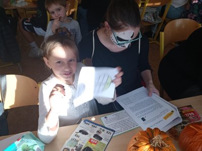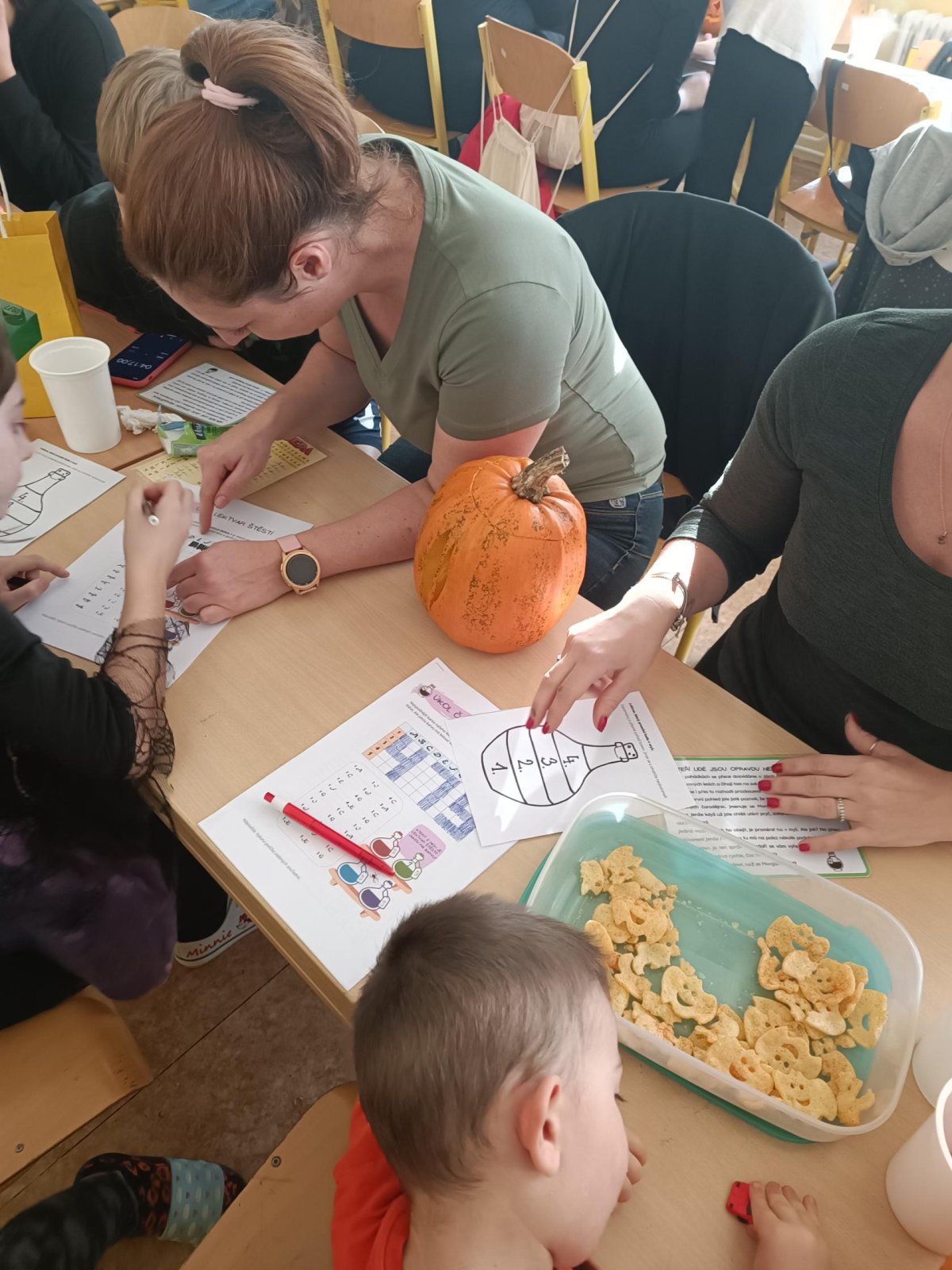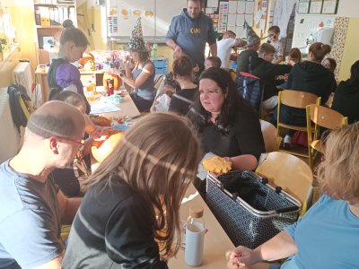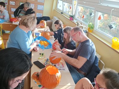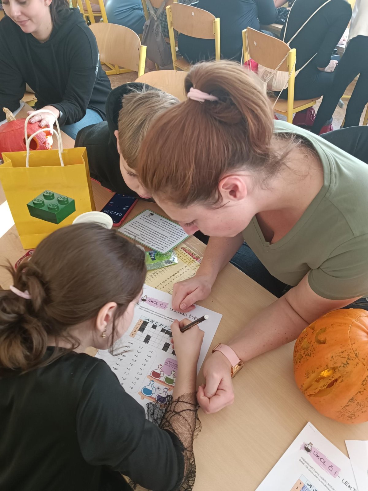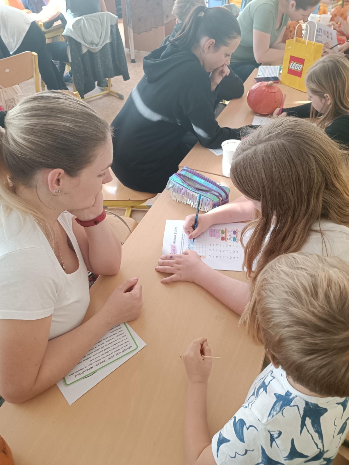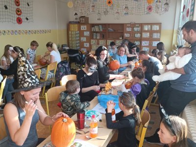 a dýně. Nejprve jsme si všichni povídali o Halloweenu, jeho zvycích a symbolech. Nezapomněli jsme ani na náš český svátek – Památka zesnulých. V duchu těchto dvou svátků se neslo celé vyučování. Žáci museli uniknout ze třídy a zachránit se před děsivou jeptiškou (paní učitelkou), následovala bojová hra, kde si vyzkoušeli své znalosti o strašidlech. Nezapomněli jsme ani na počítání netopýrů, vyzdobení hradu podle zadání a dušičkové zdobení hrobů.