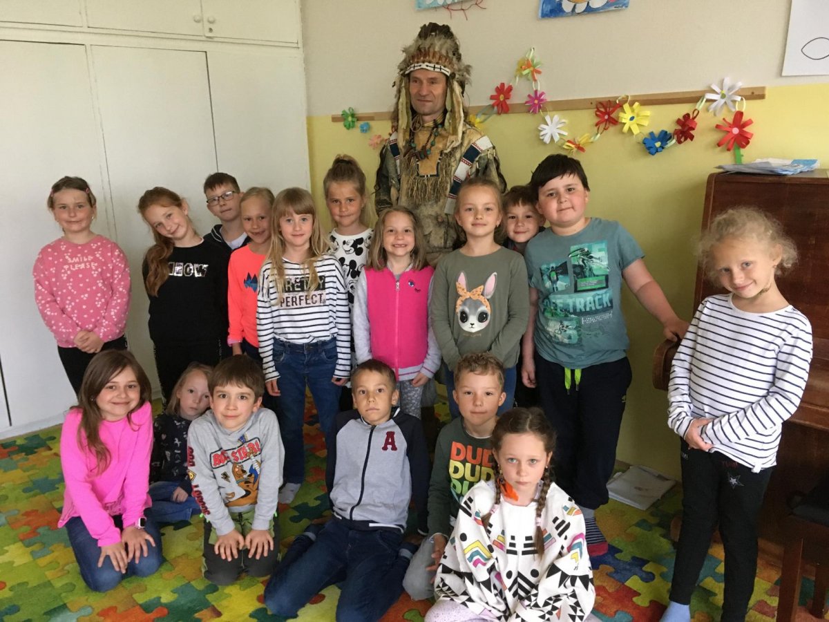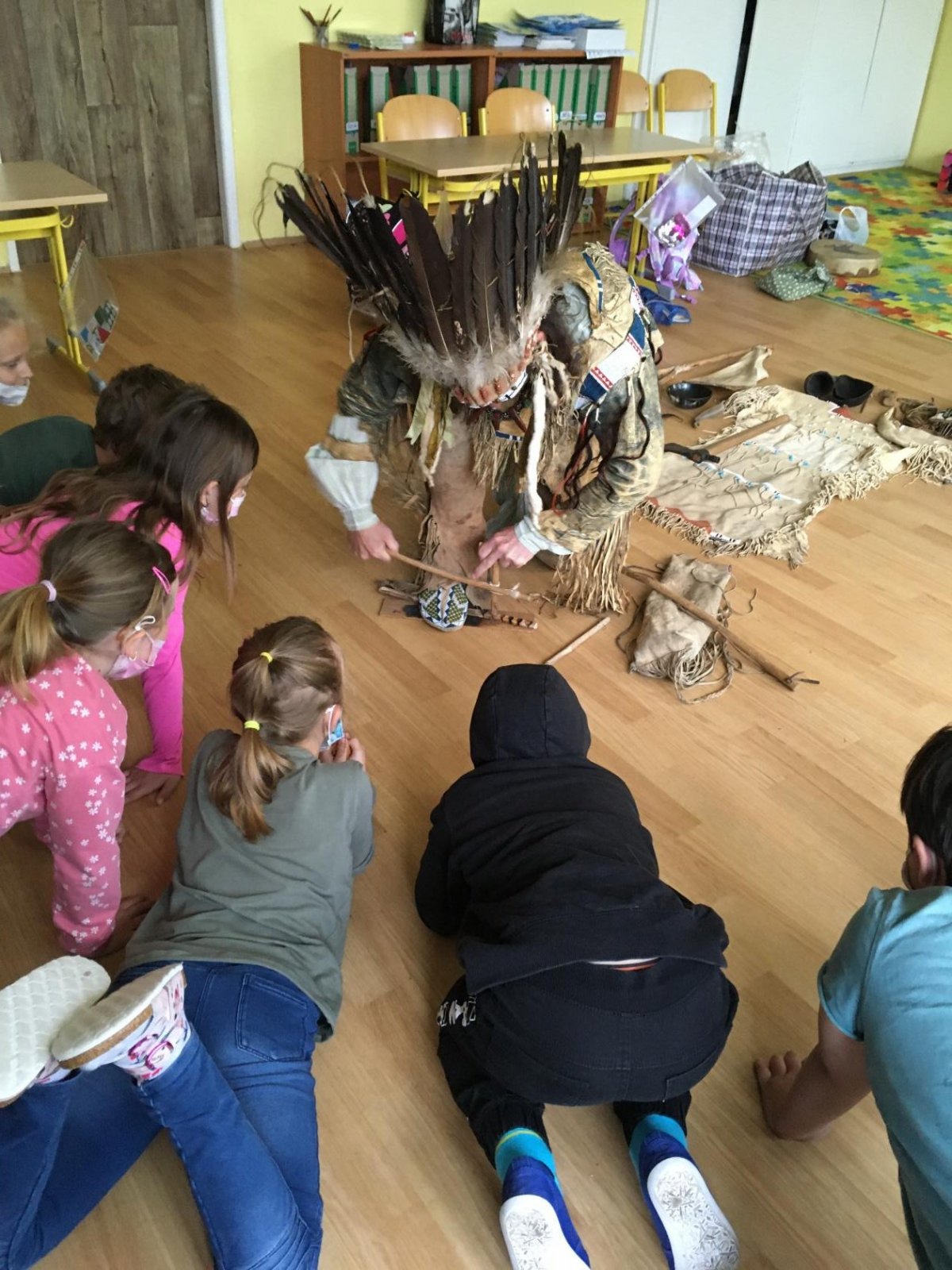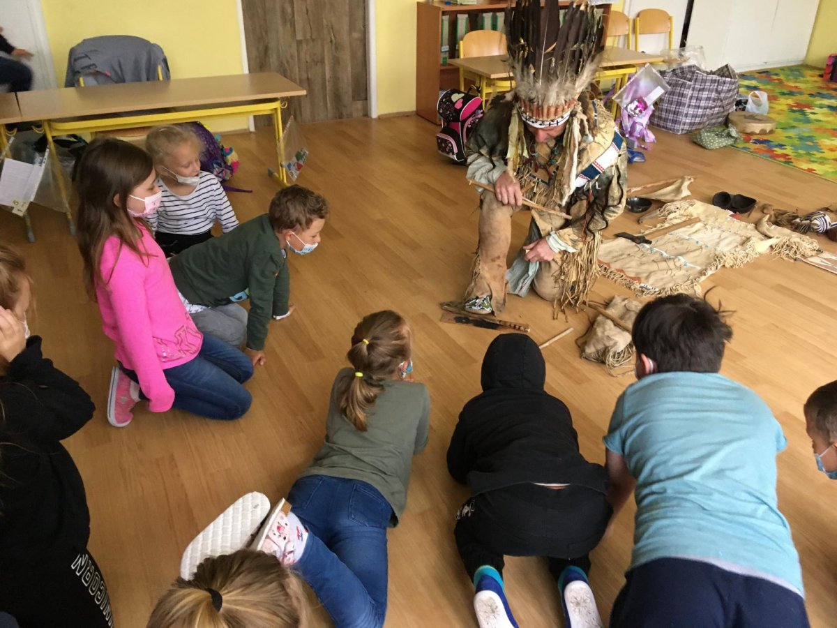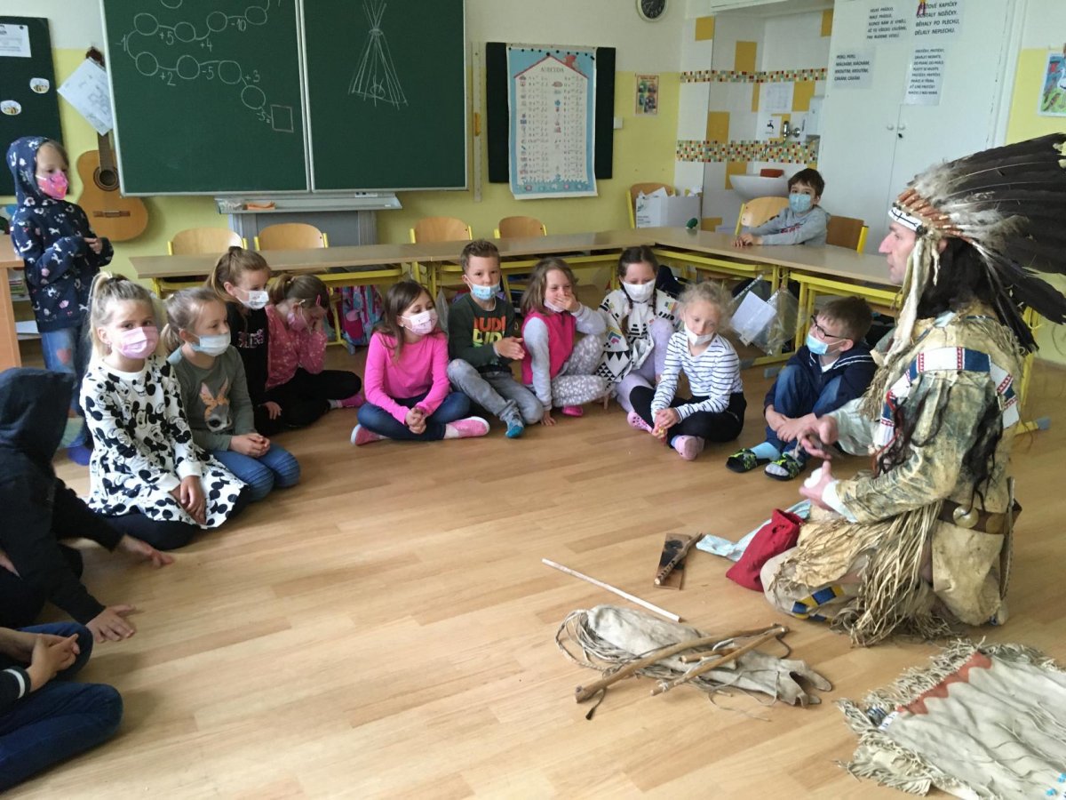 Za dětmi do 1.C přišel „pravý, nefalšovaný ?“ indián. Tak se dozvěděly spoustu zajímavých informací i životě indiánů. Mohly si sáhnout na oblečení z kůže, čelenku z peří i bojové nástroje. Viděly, jak se rozdělává oheň pomocí třecích dřívek nebo pazourků. Také si za doprovodu bubnu zazpívaly indiánskou vítací píseň a zahrály si nějaké hry.