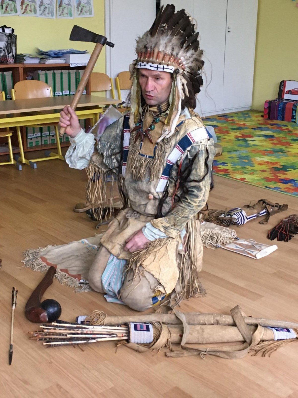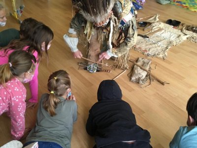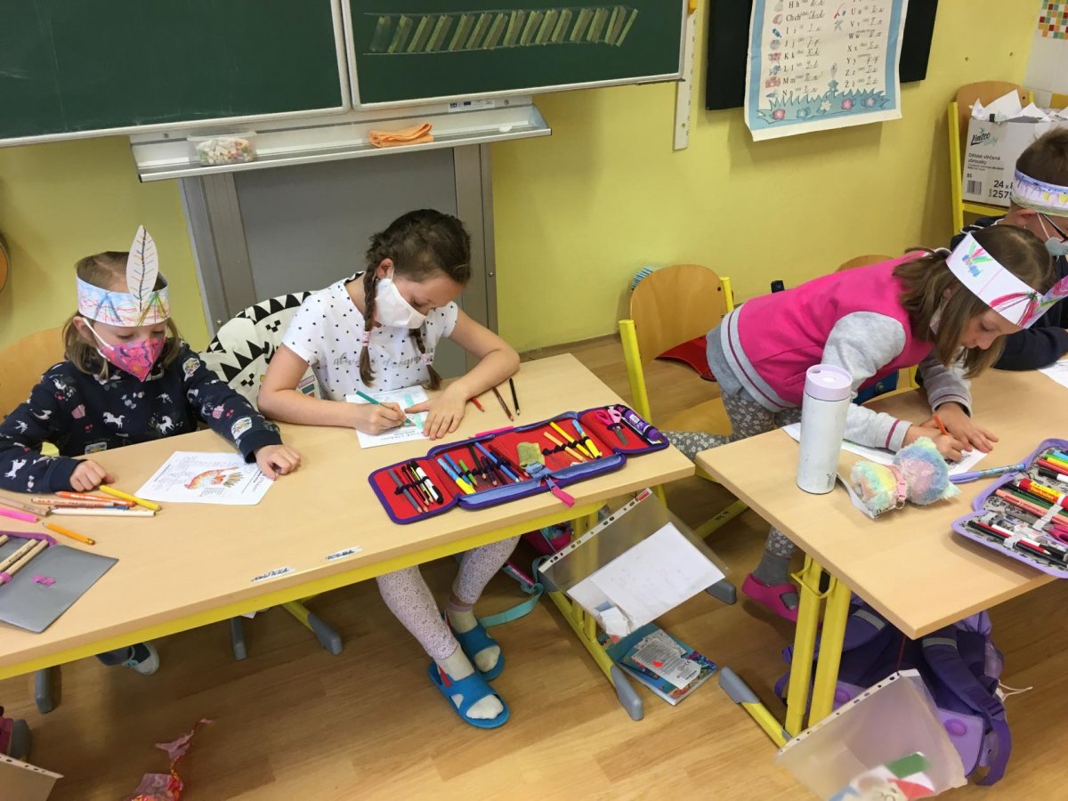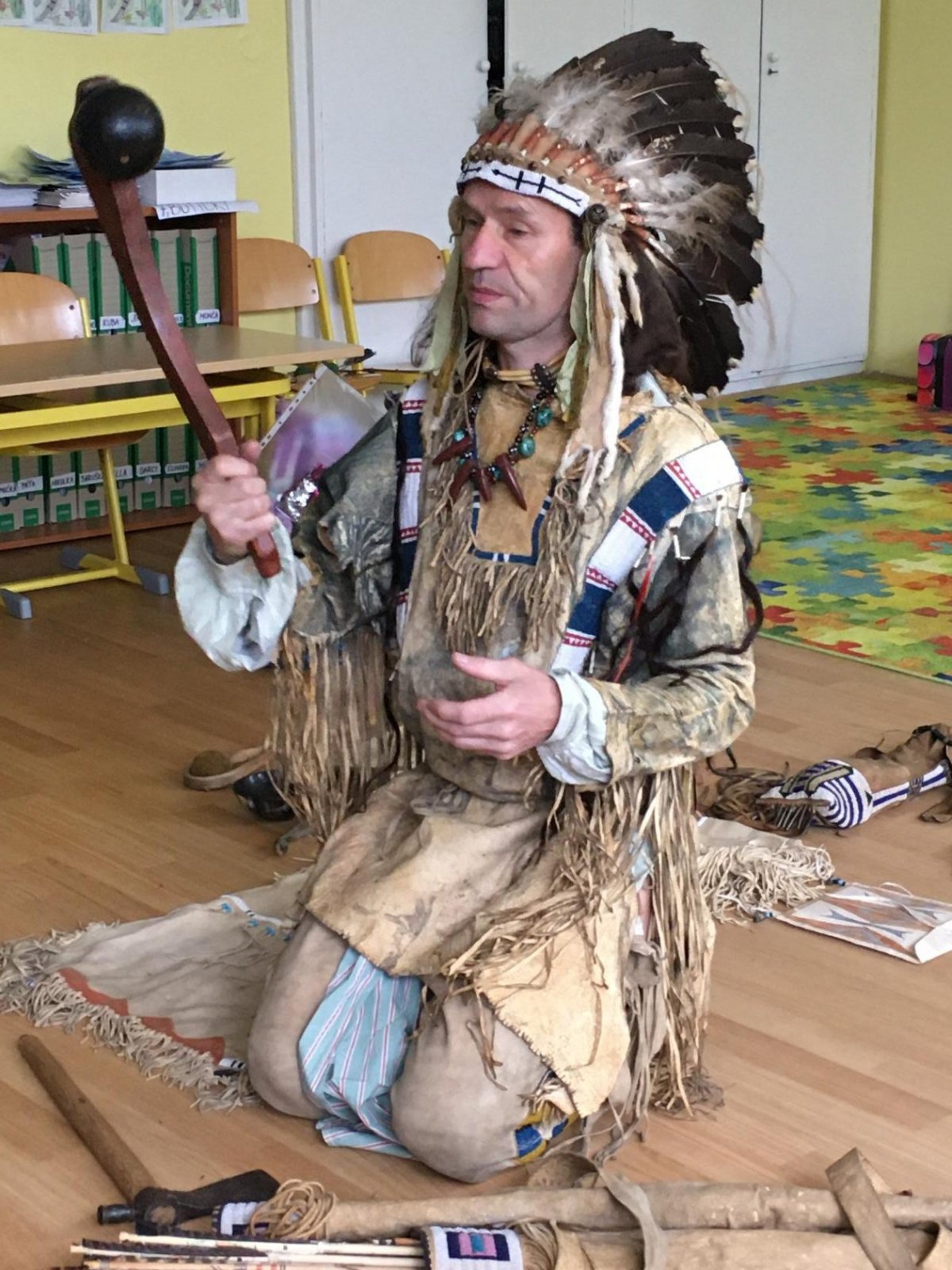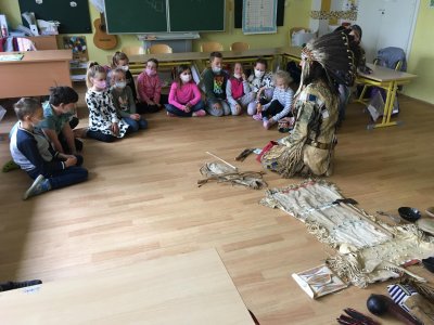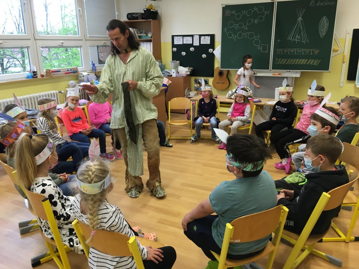 Za dětmi do 1.C přišel „pravý, nefalšovaný ?“ indián. Tak se dozvěděly spoustu zajímavých informací i životě indiánů. Mohly si sáhnout na oblečení z kůže, čelenku z peří i bojové nástroje. Viděly, jak se rozdělává oheň pomocí třecích dřívek nebo pazourků. Také si za doprovodu bubnu zazpívaly indiánskou vítací píseň a zahrály si nějaké hry.
