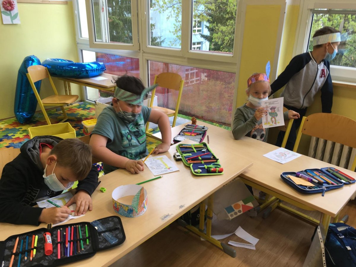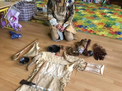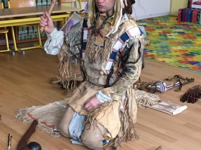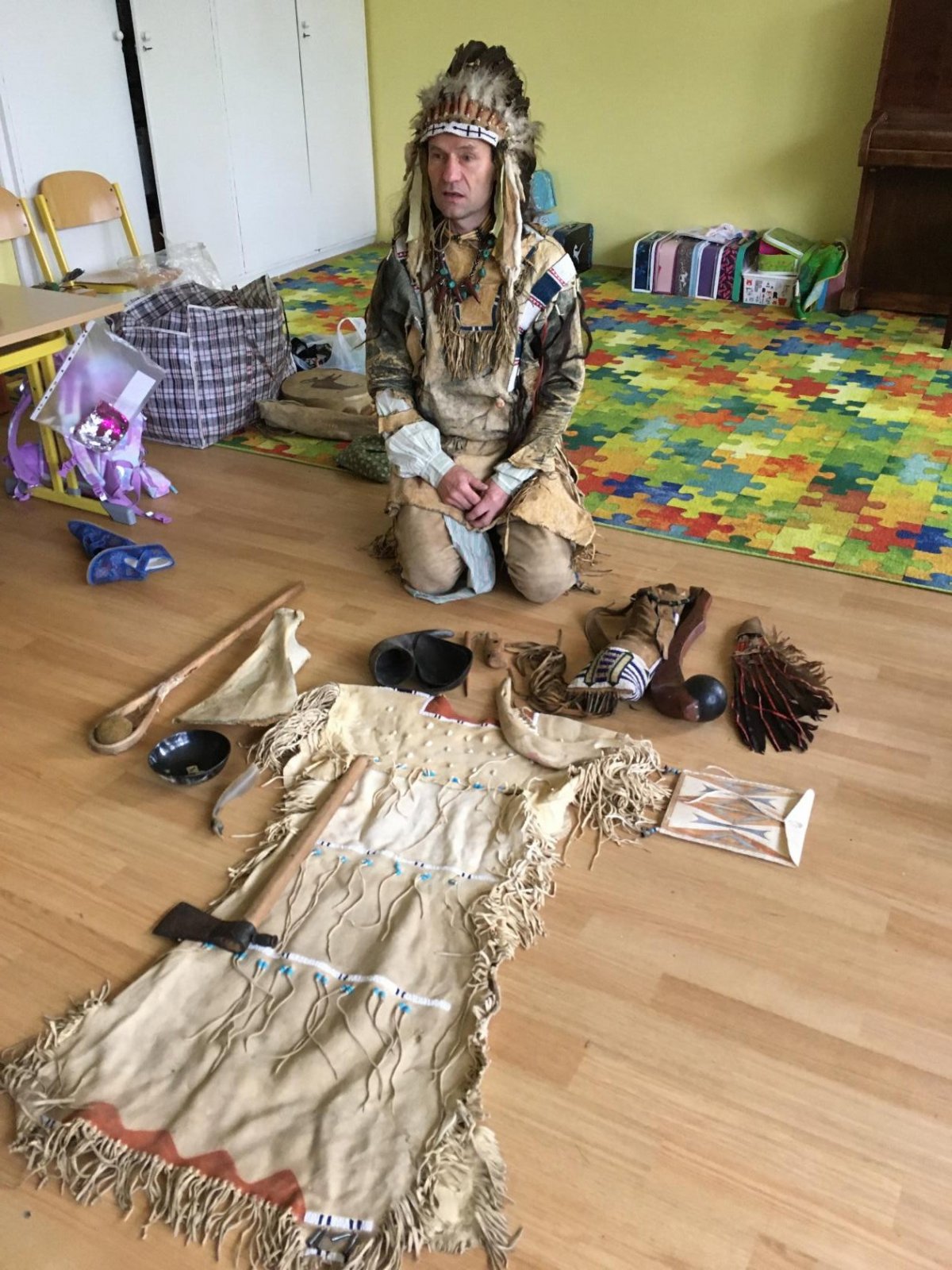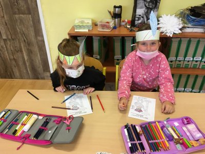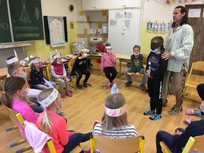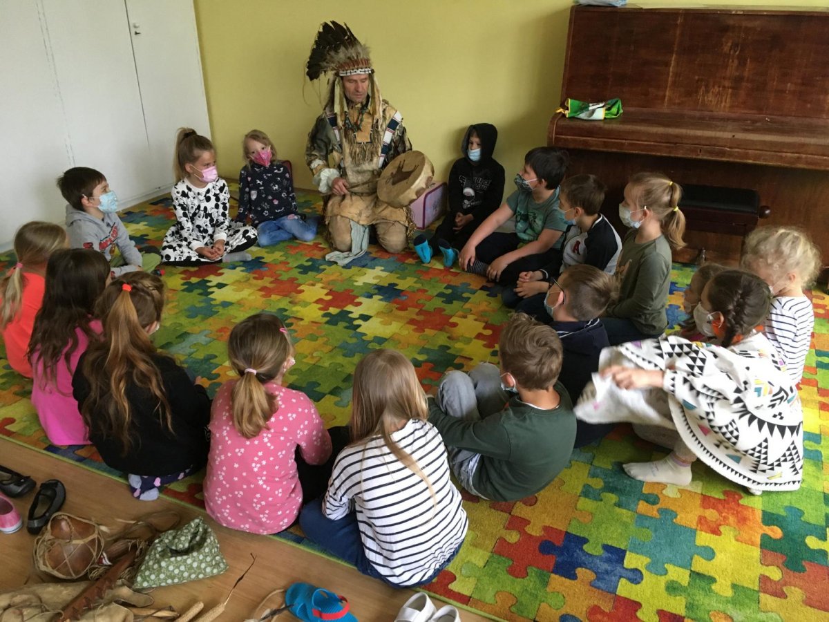 Za dětmi do 1.C přišel „pravý, nefalšovaný ?“ indián. Tak se dozvěděly spoustu zajímavých informací i životě indiánů. Mohly si sáhnout na oblečení z kůže, čelenku z peří i bojové nástroje. Viděly, jak se rozdělává oheň pomocí třecích dřívek nebo pazourků. Také si za doprovodu bubnu zazpívaly indiánskou vítací píseň a zahrály si nějaké hry.