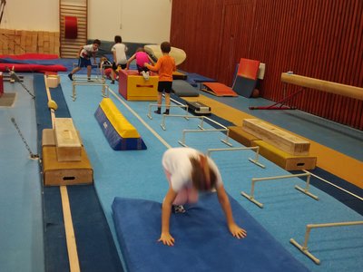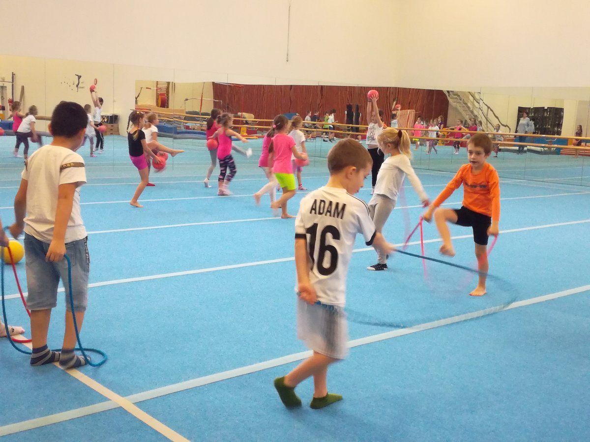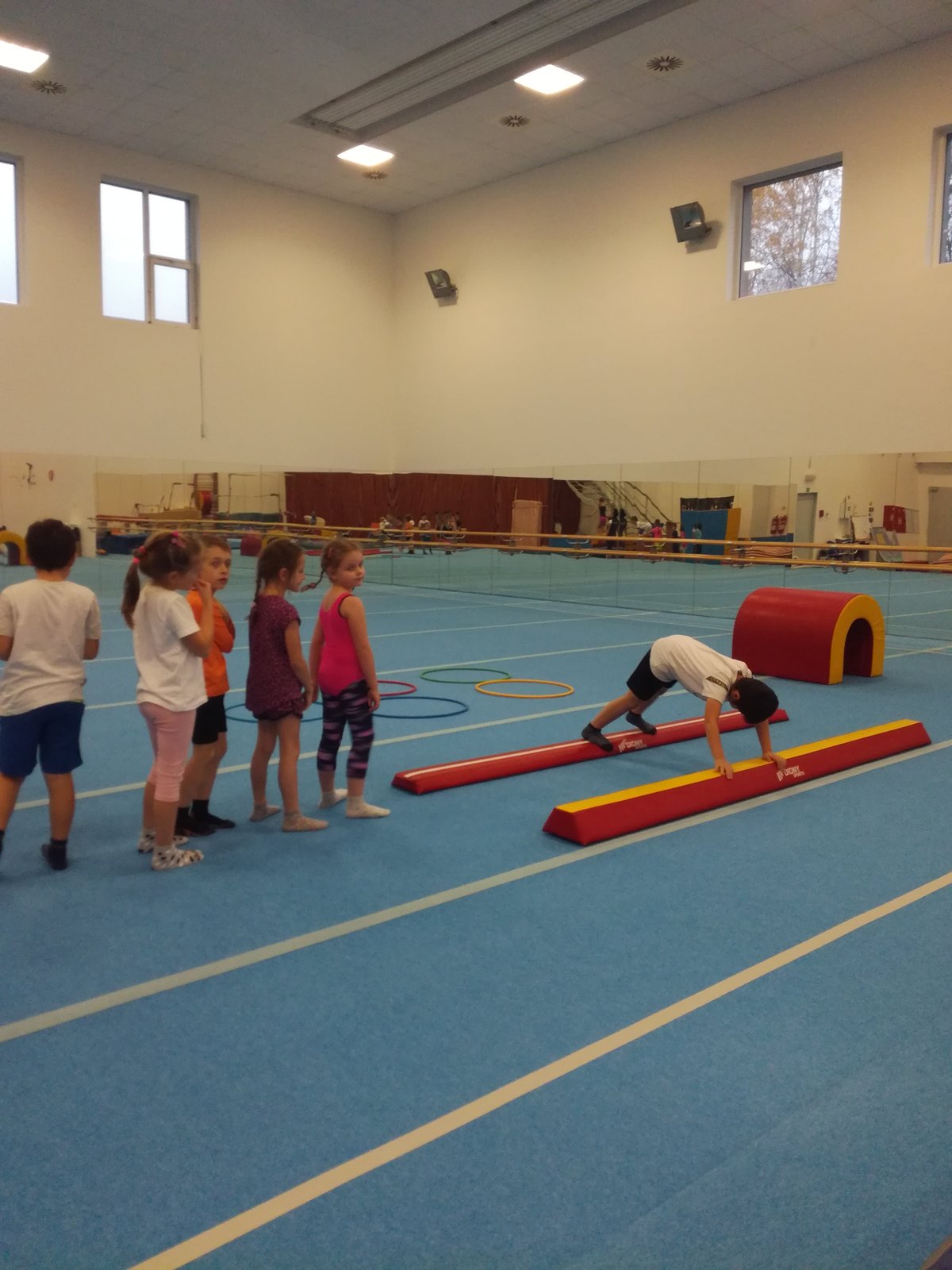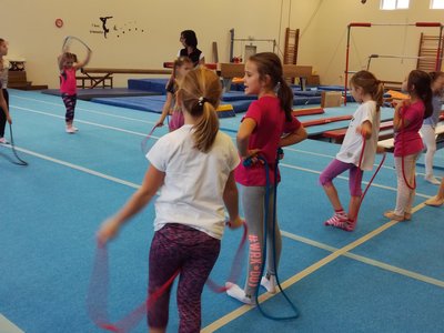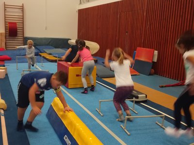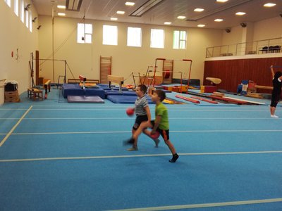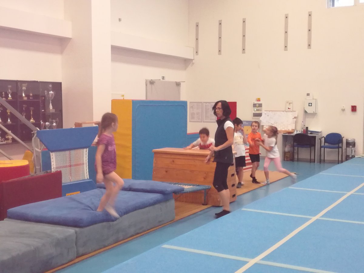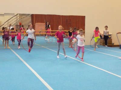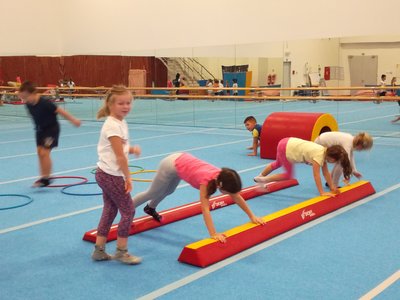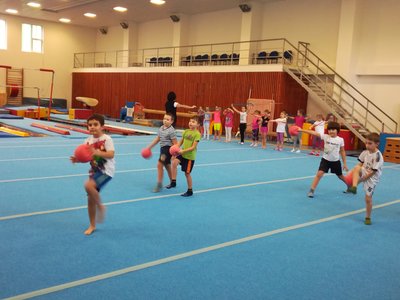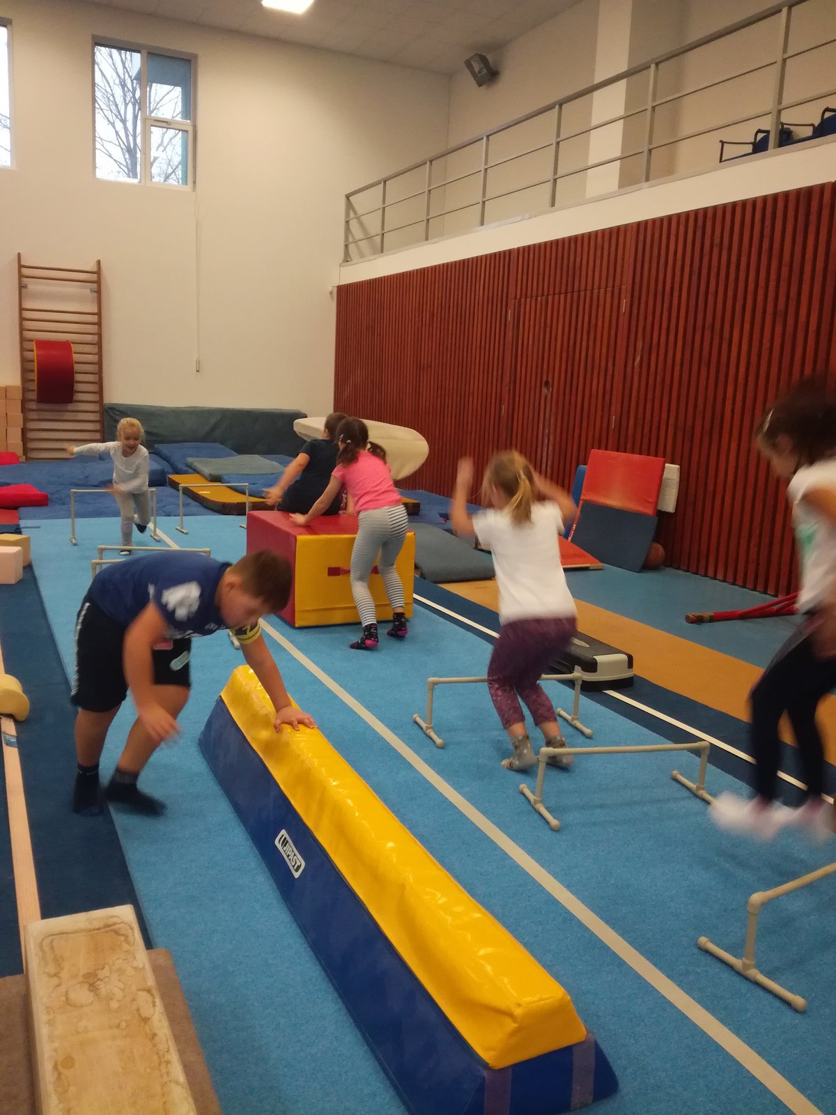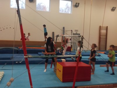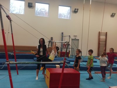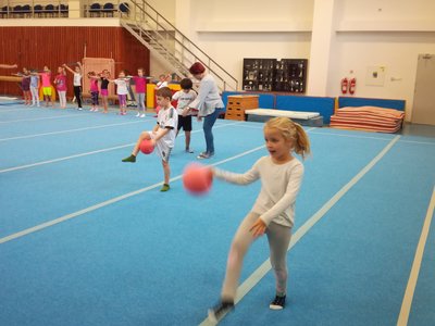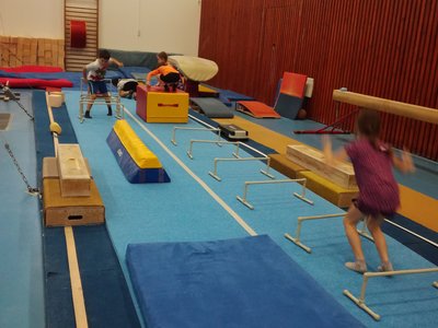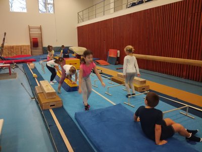Úvodní část hodiny - rozcvička bývá podobně zaměřená. Zde vidíte fotky z druhých částí hodin, kdy děti cvičí na různých nářadích nebo s náčiním.