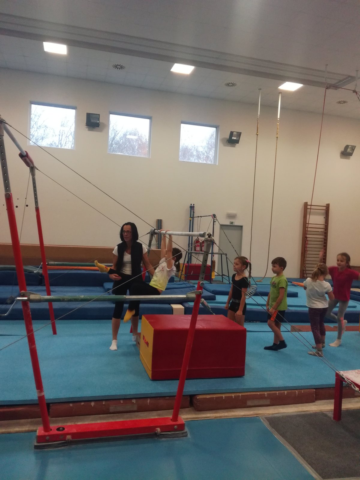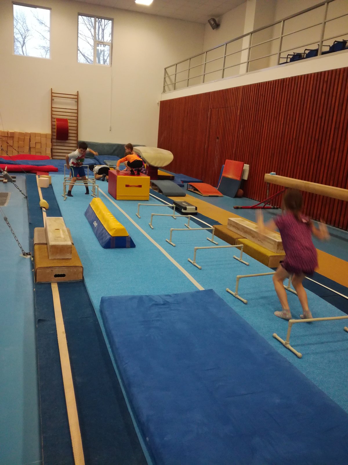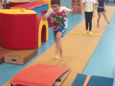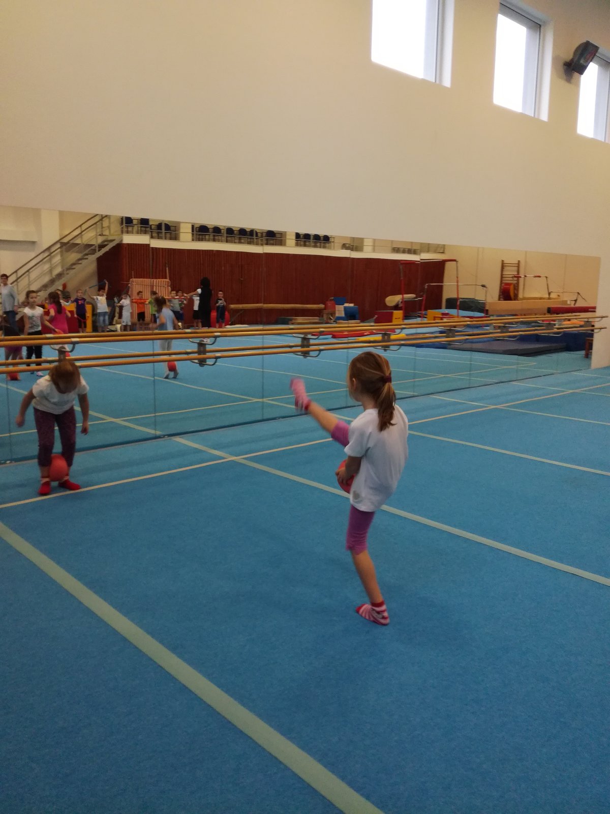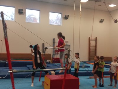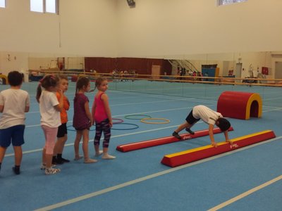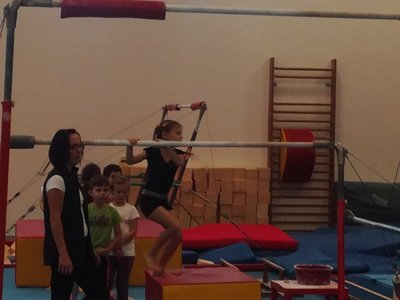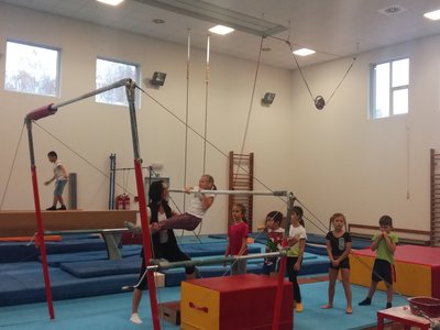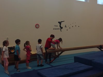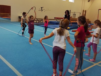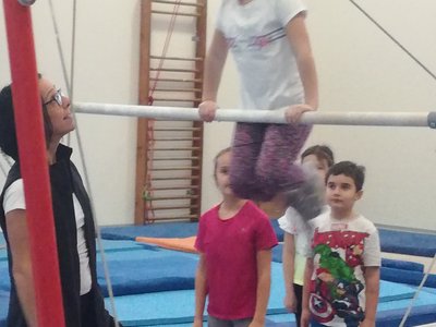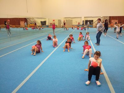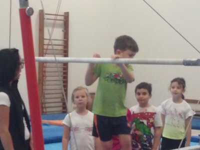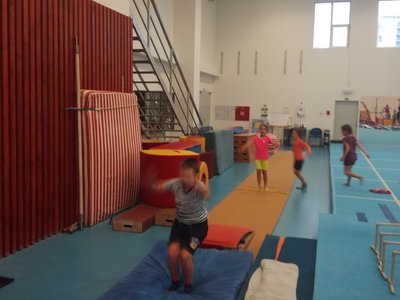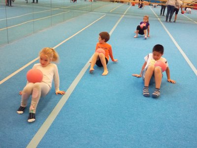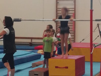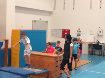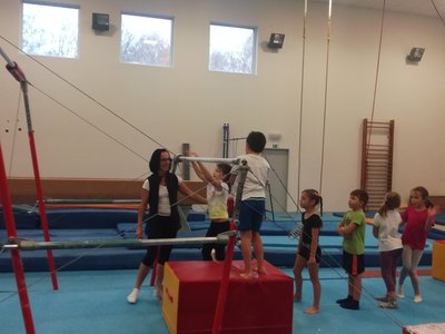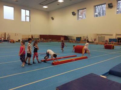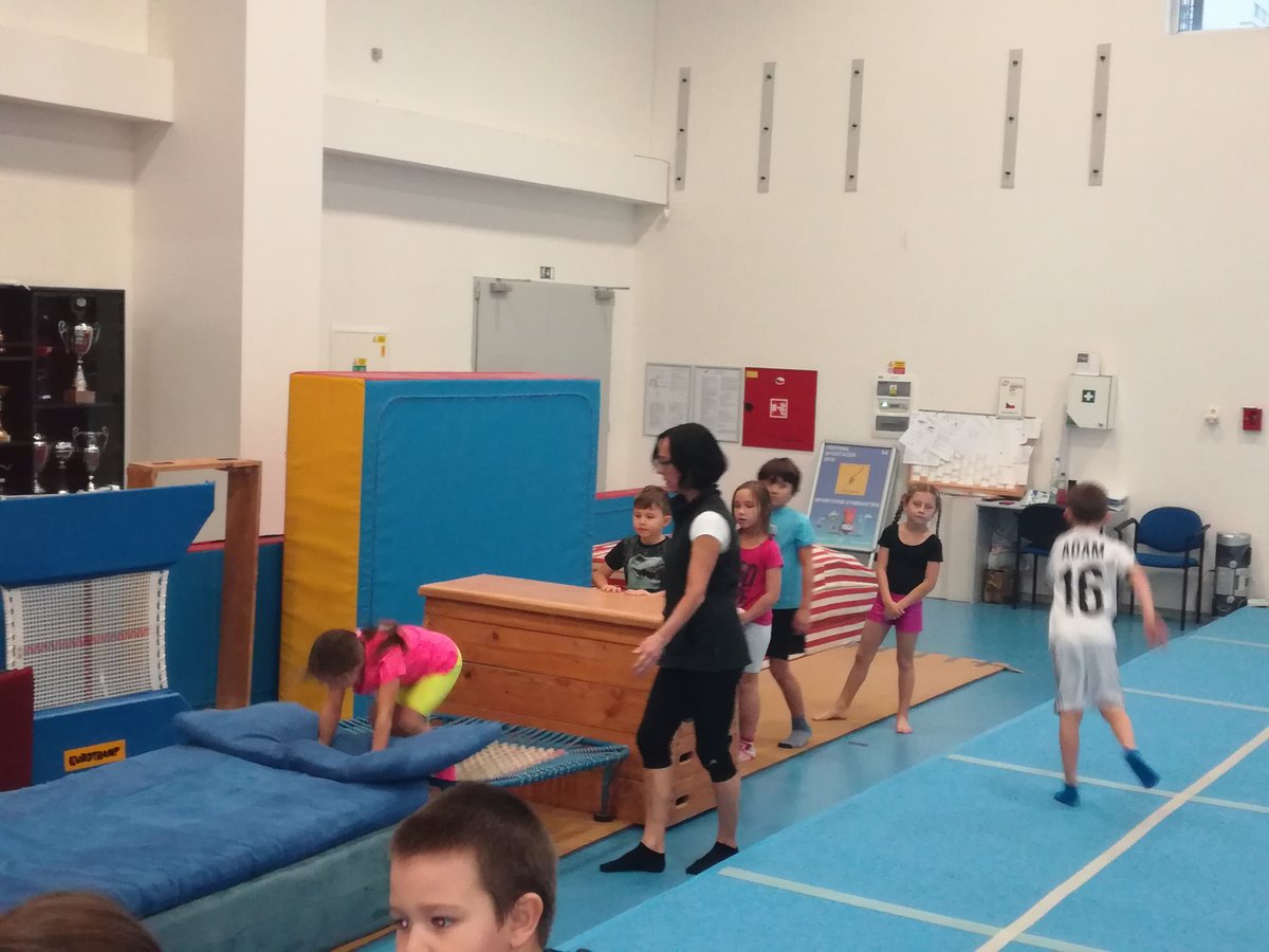 Úvodní část hodiny - rozcvička bývá podobně zaměřená. Zde vidíte fotky z druhých částí hodin, kdy děti cvičí na různých nářadích nebo s náčiním.