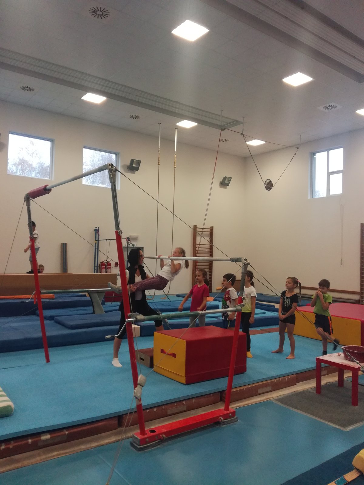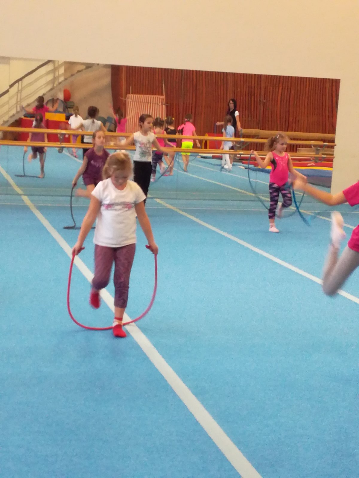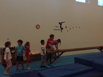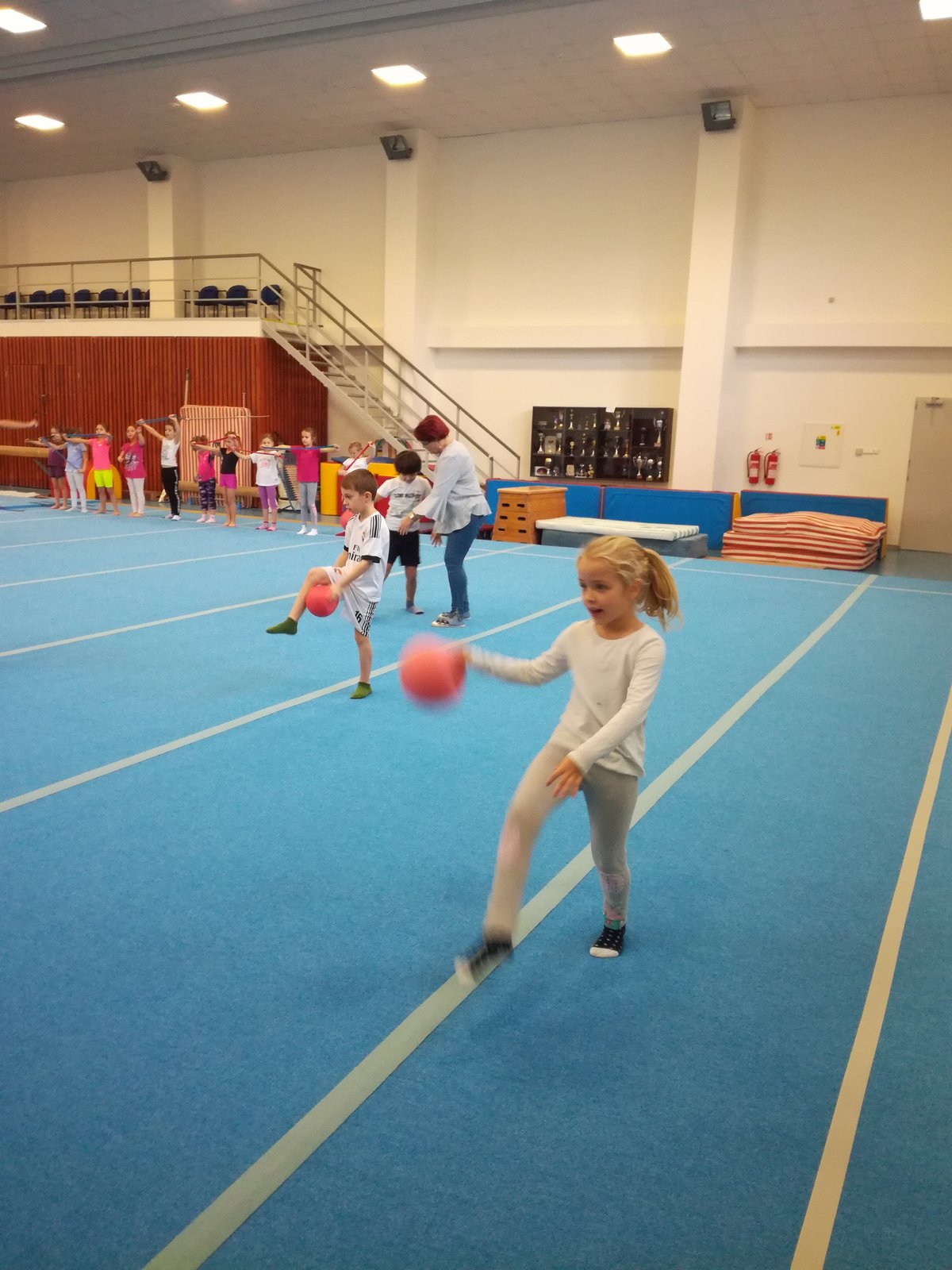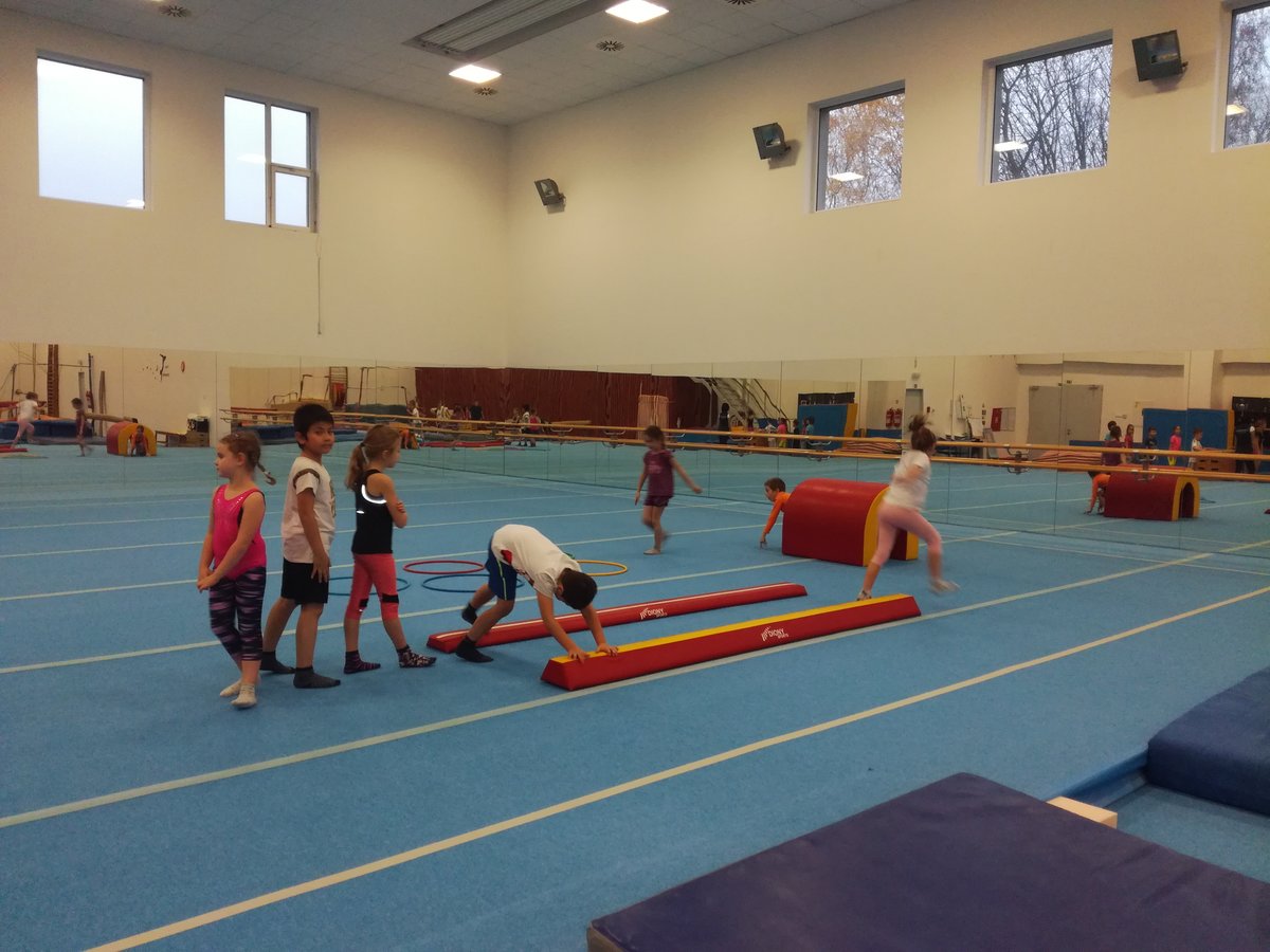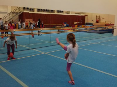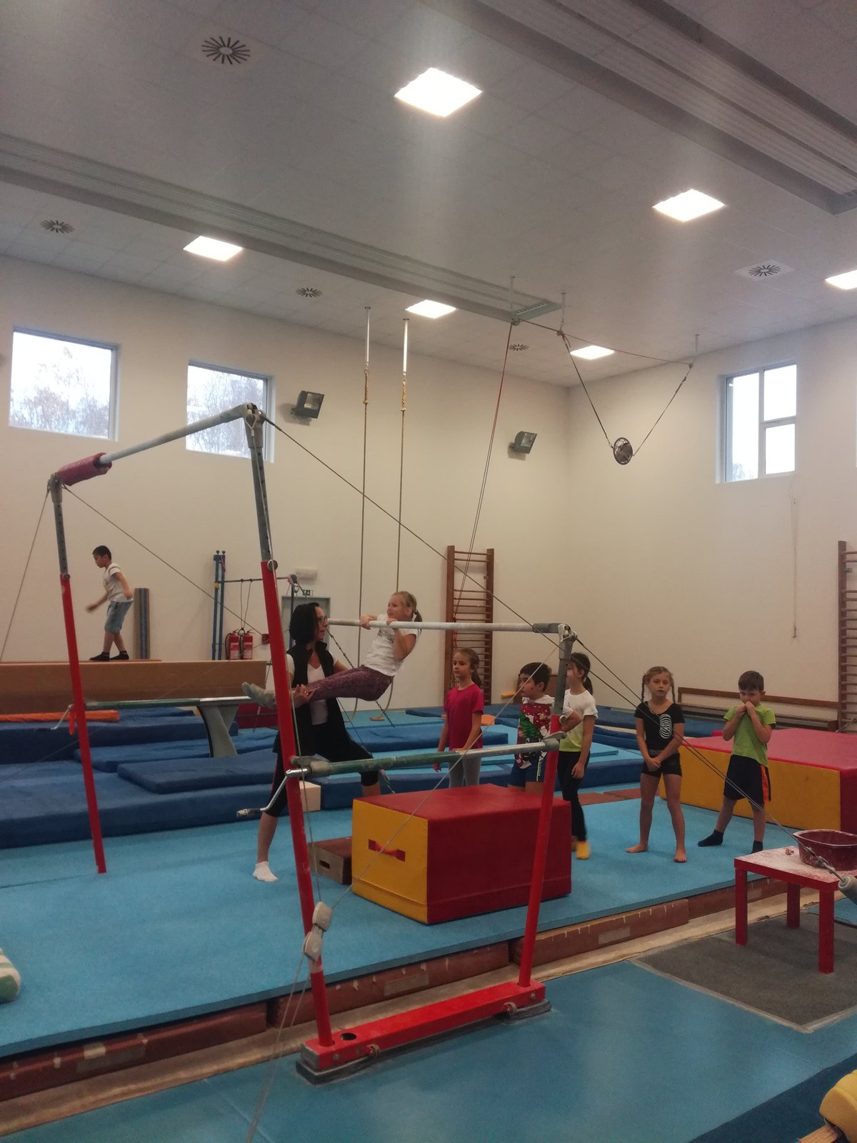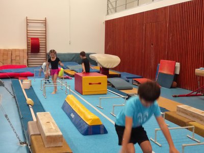 Úvodní část hodiny - rozcvička bývá podobně zaměřená. Zde vidíte fotky z druhých částí hodin, kdy děti cvičí na různých nářadích nebo s náčiním.