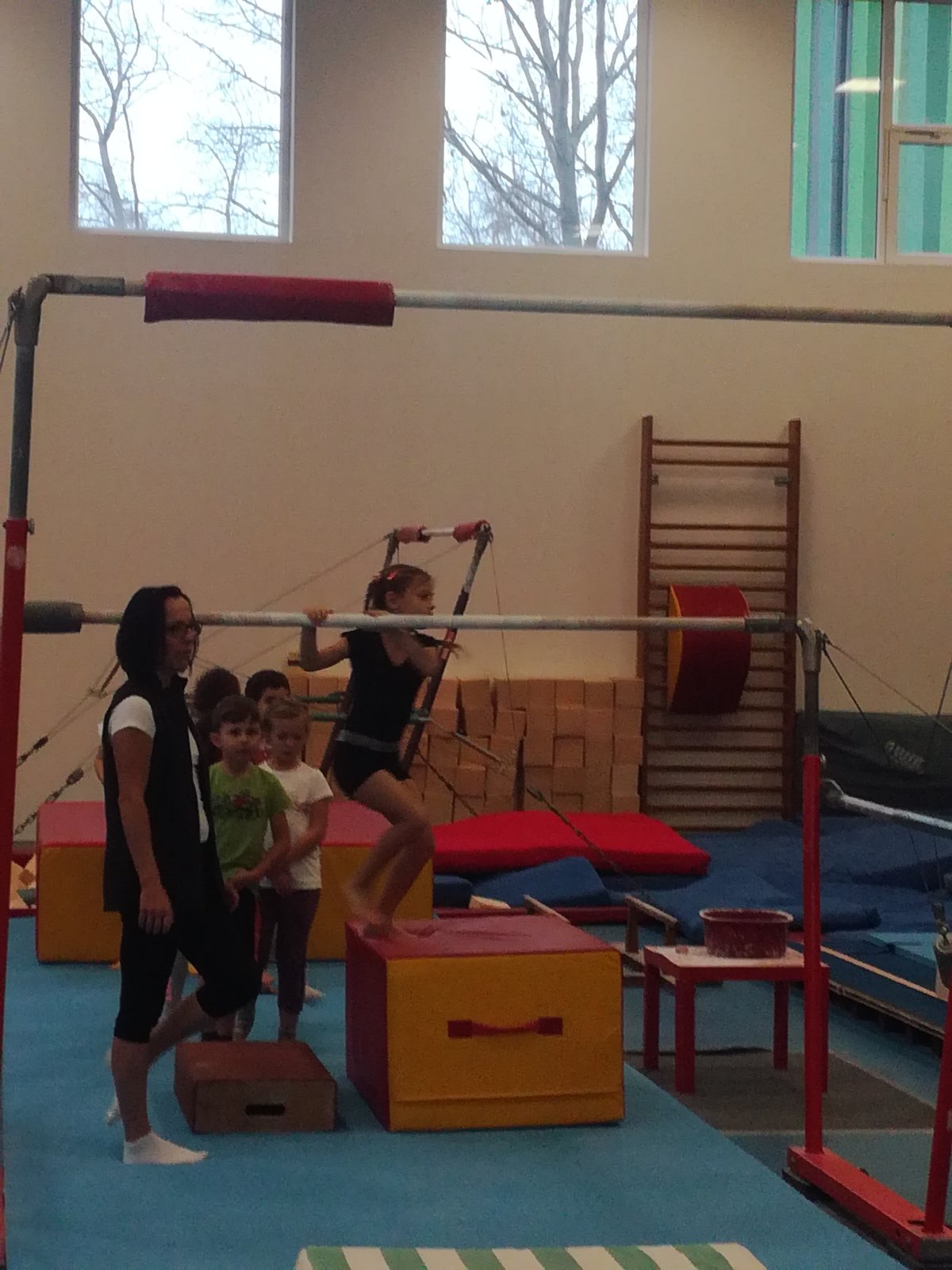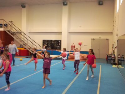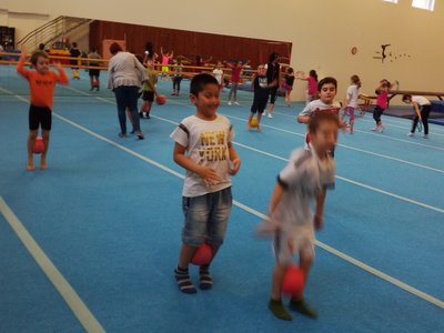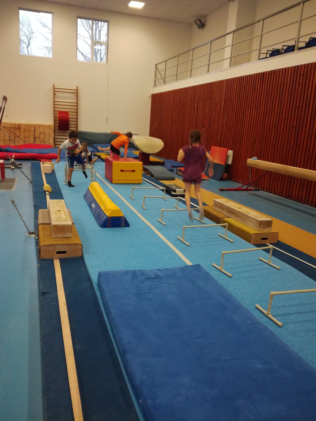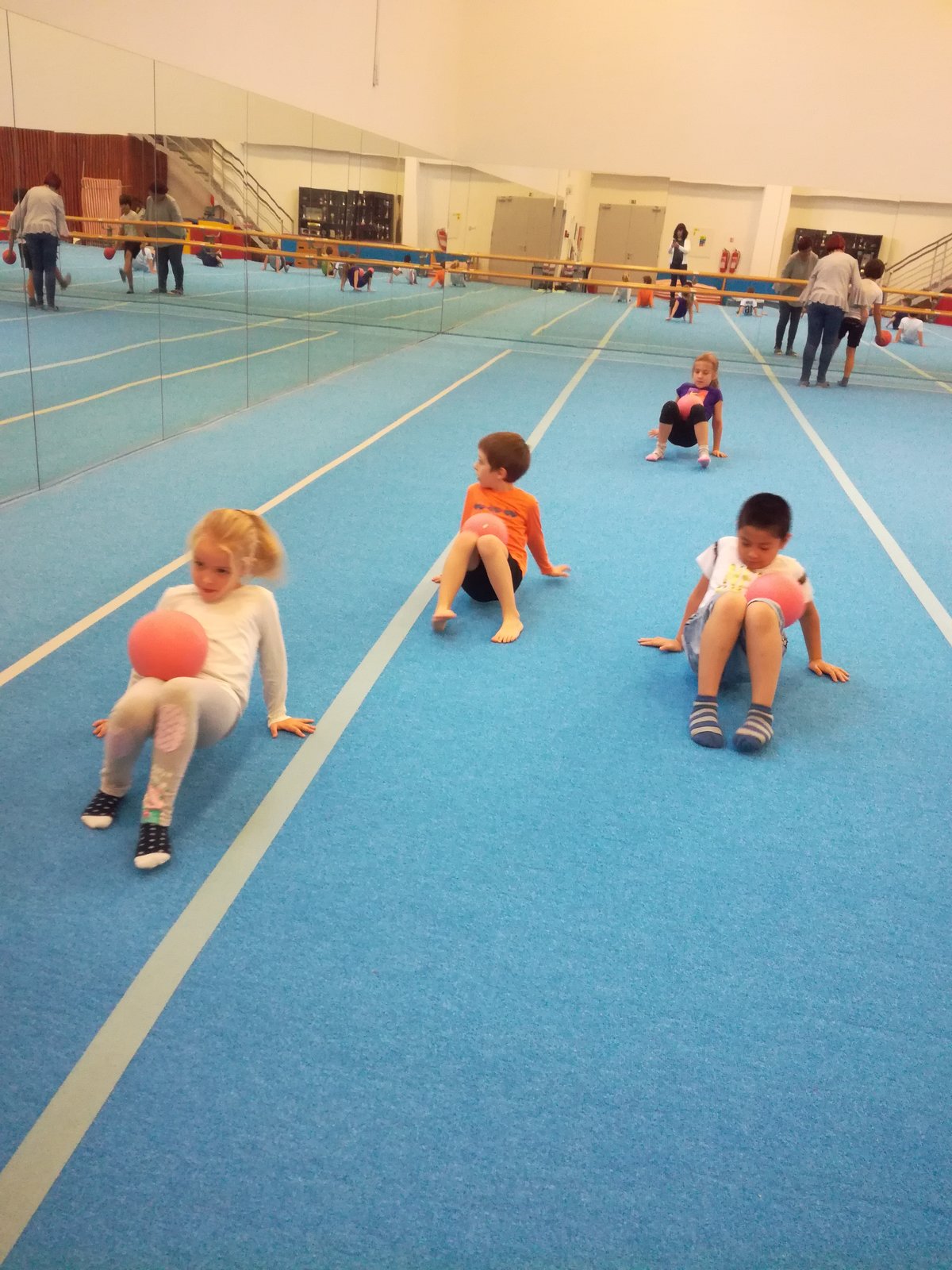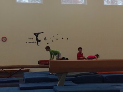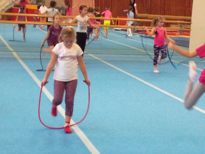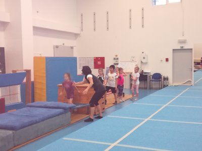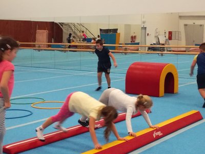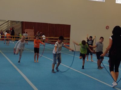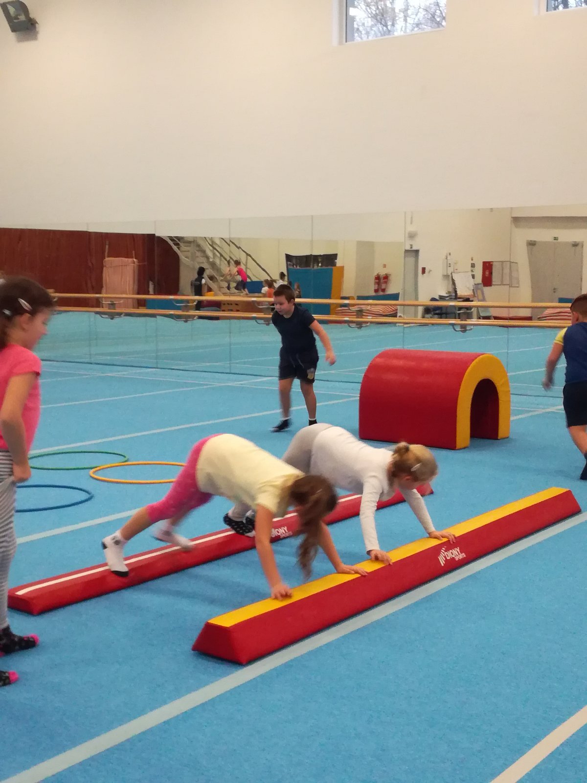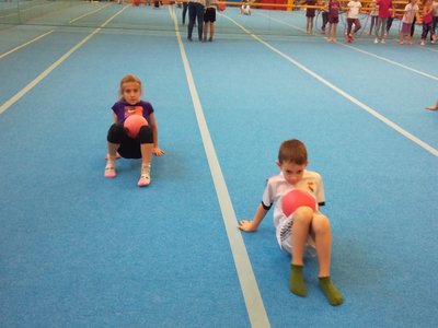 Úvodní část hodiny - rozcvička bývá podobně zaměřená. Zde vidíte fotky z druhých částí hodin, kdy děti cvičí na různých nářadích nebo s náčiním.