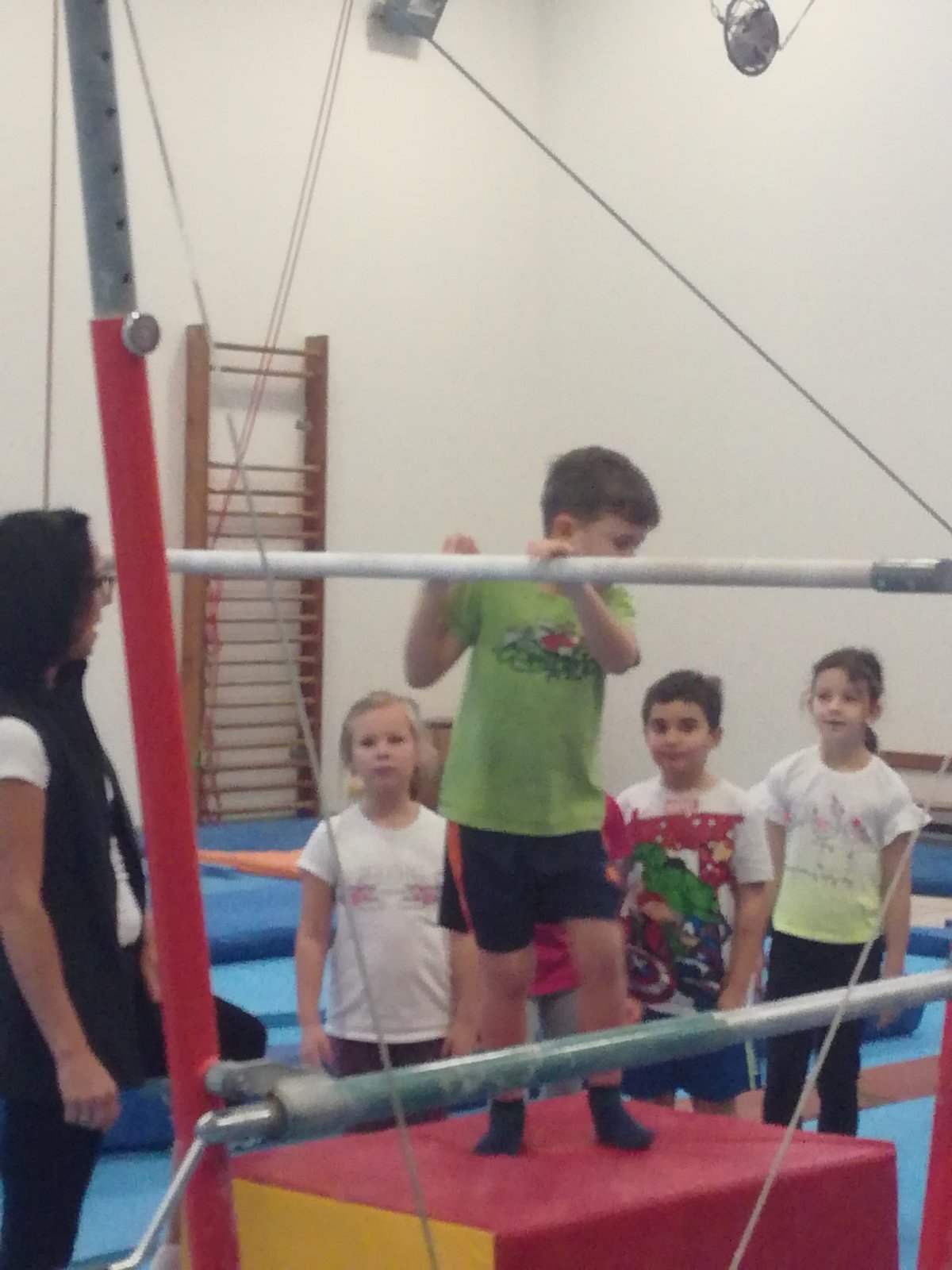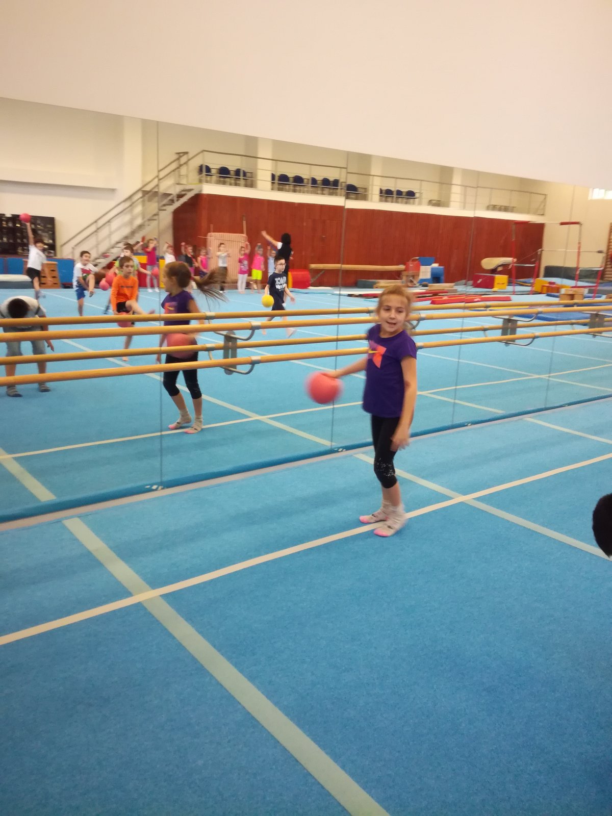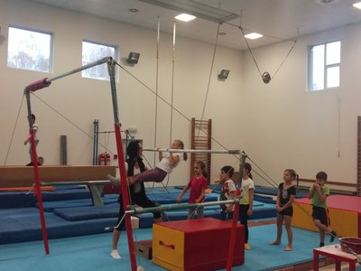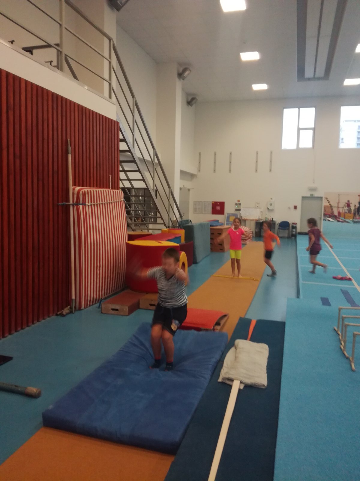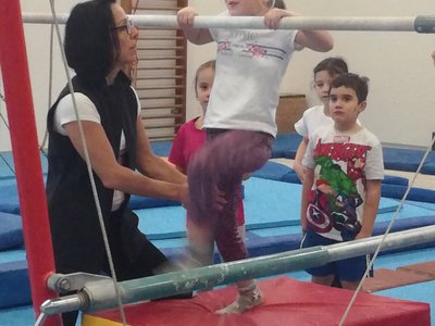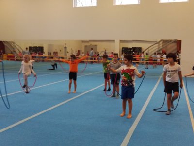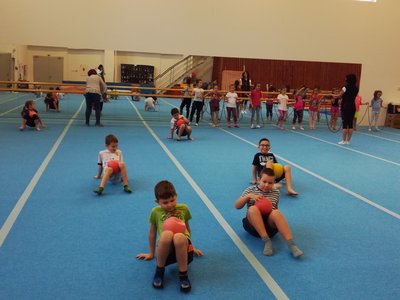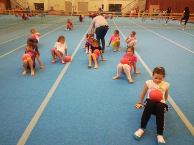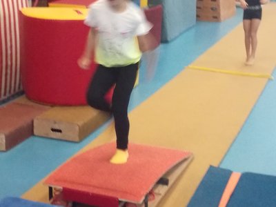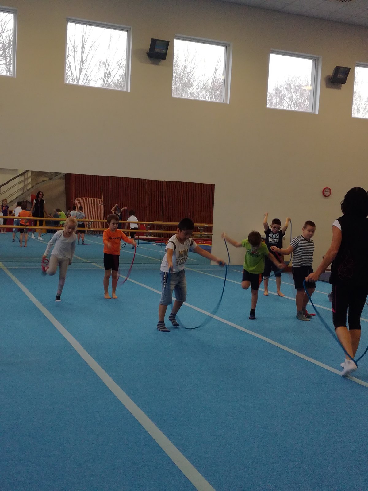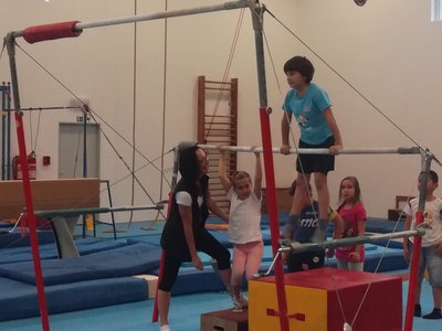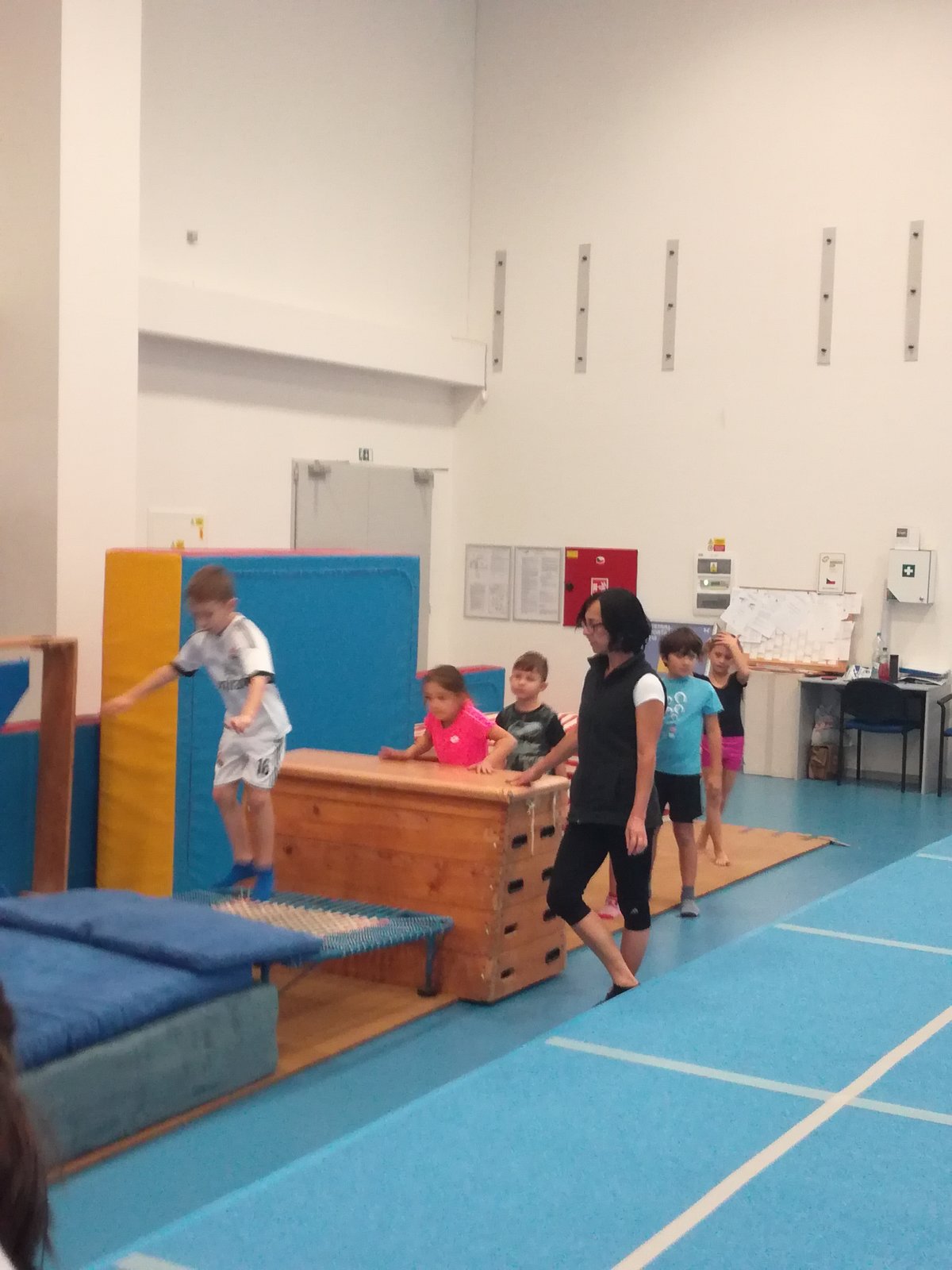 Úvodní část hodiny - rozcvička bývá podobně zaměřená. Zde vidíte fotky z druhých částí hodin, kdy děti cvičí na různých nářadích nebo s náčiním.
