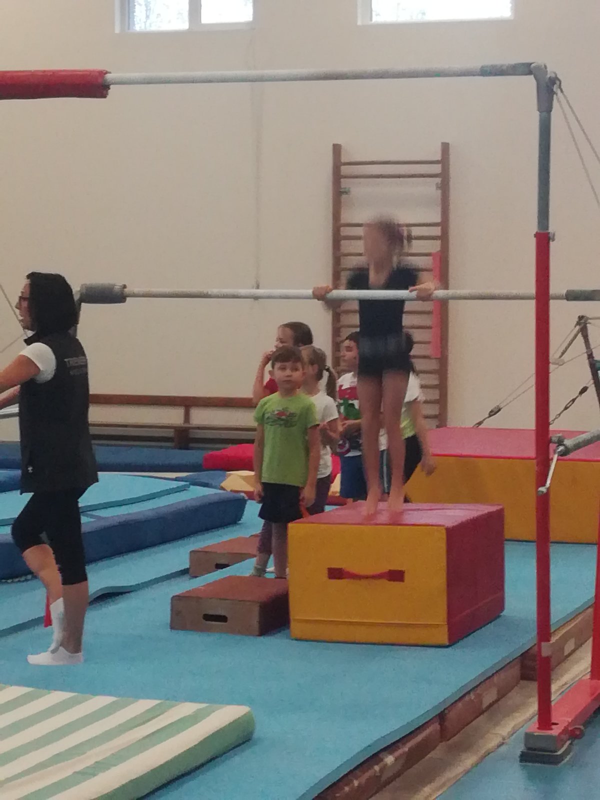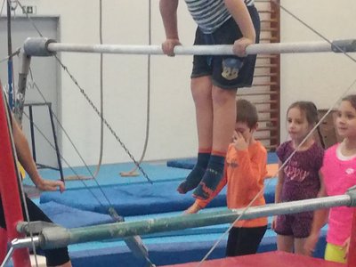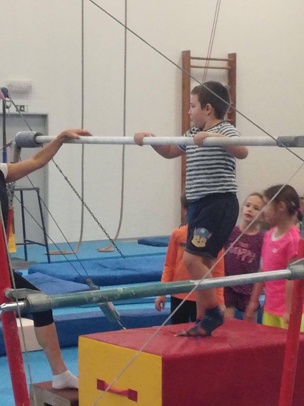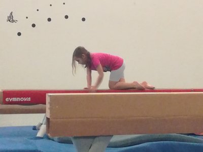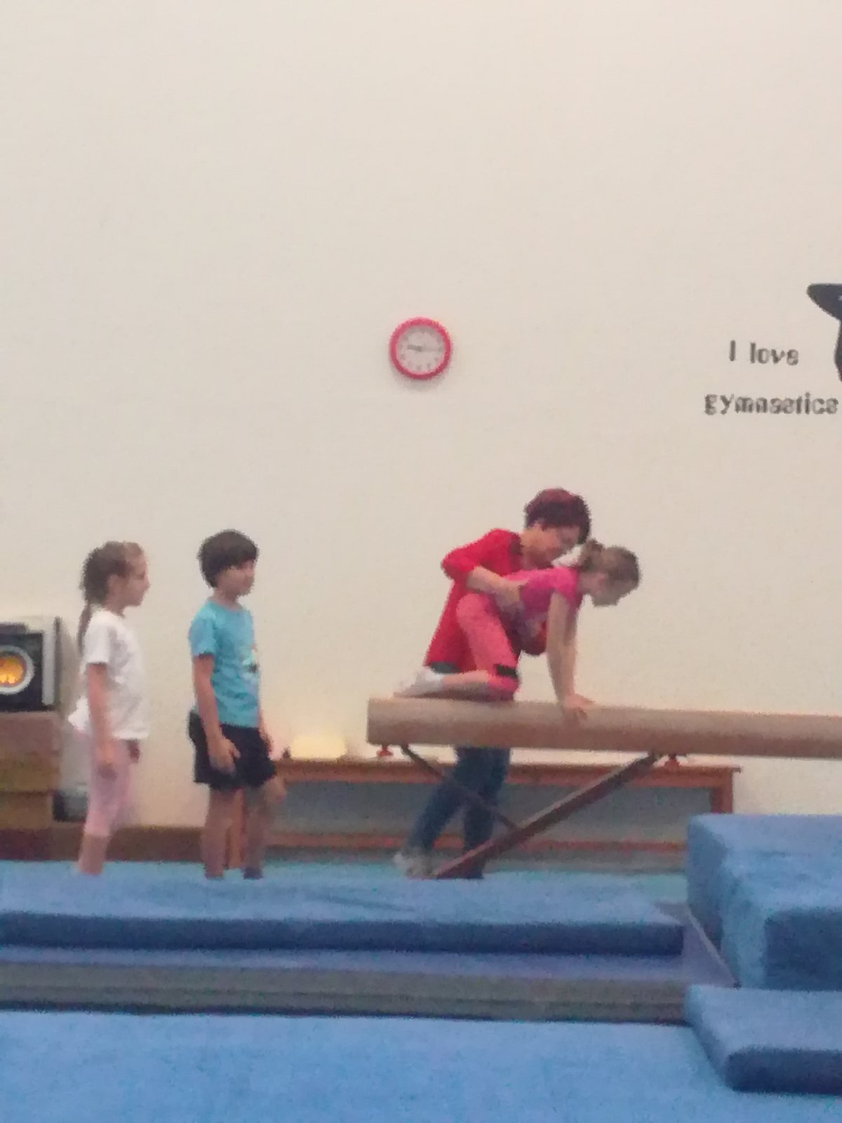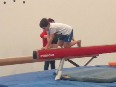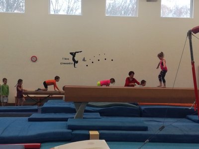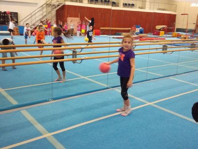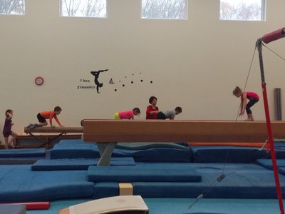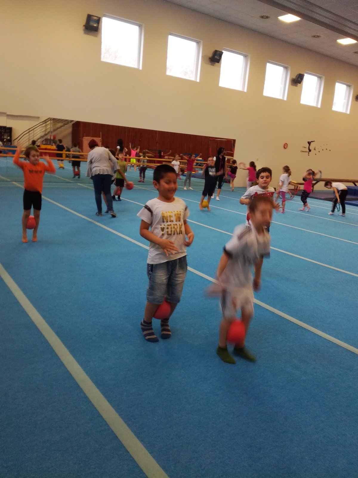 Úvodní část hodiny - rozcvička bývá podobně zaměřená. Zde vidíte fotky z druhých částí hodin, kdy děti cvičí na různých nářadích nebo s náčiním.