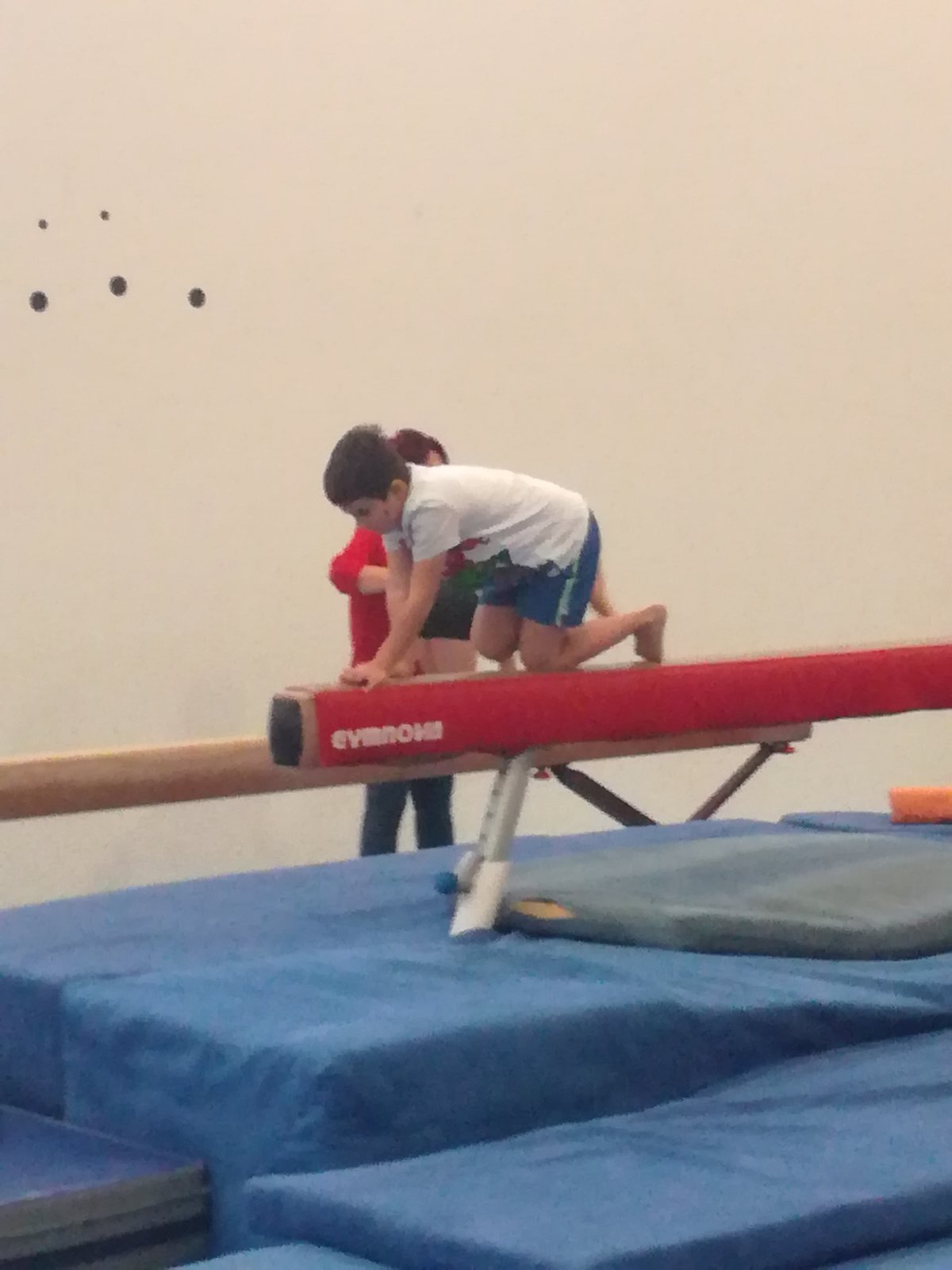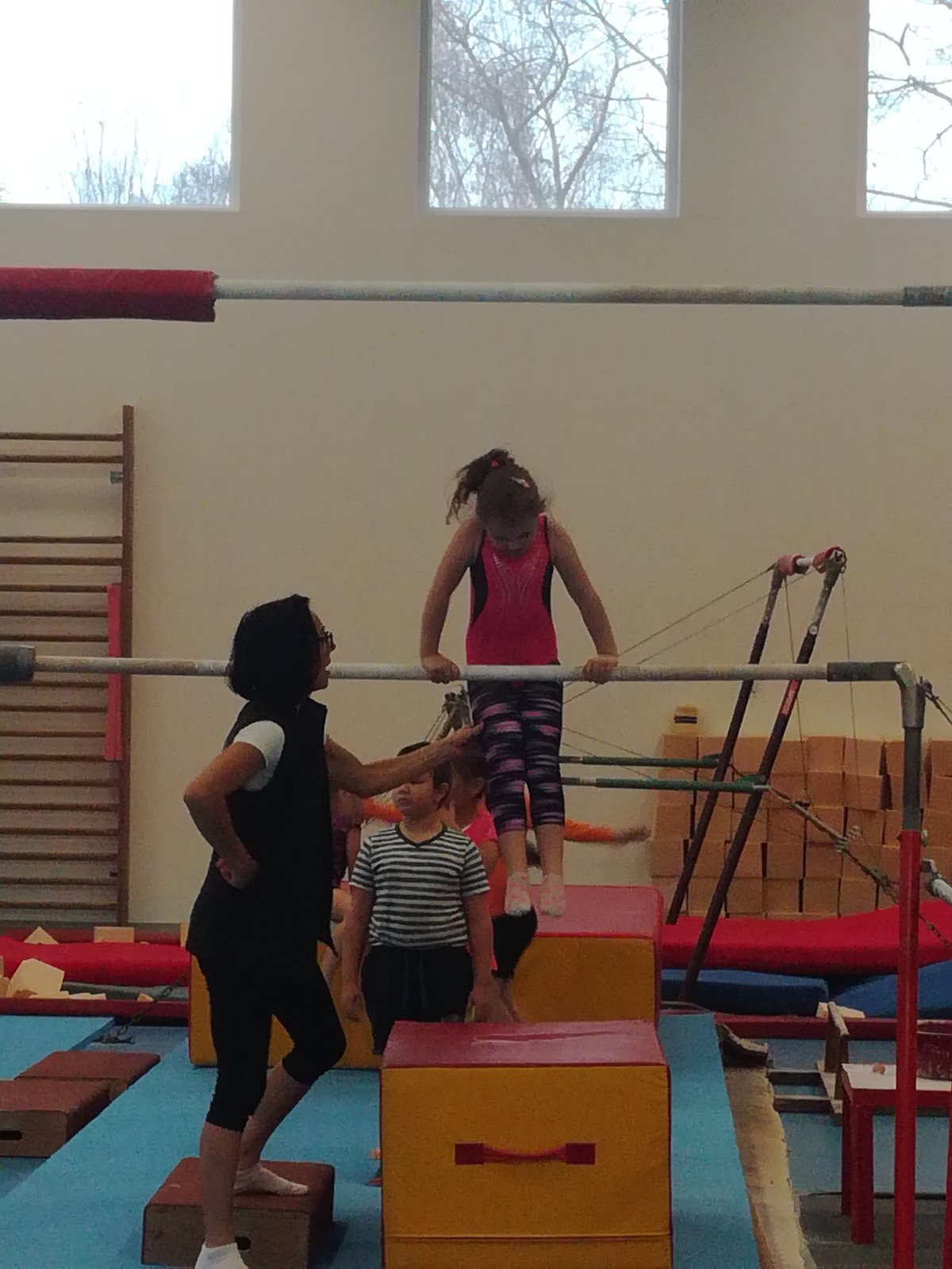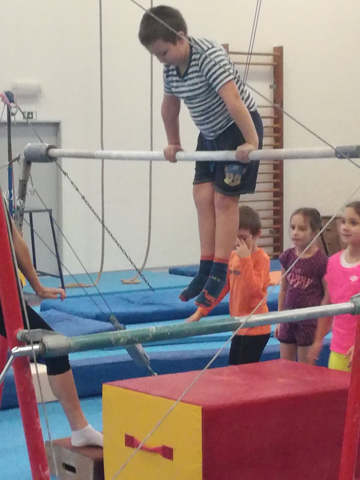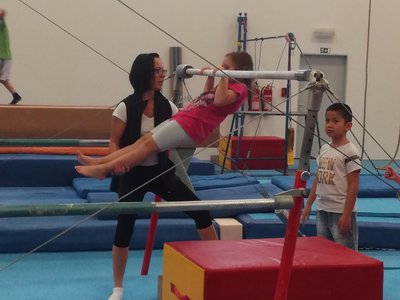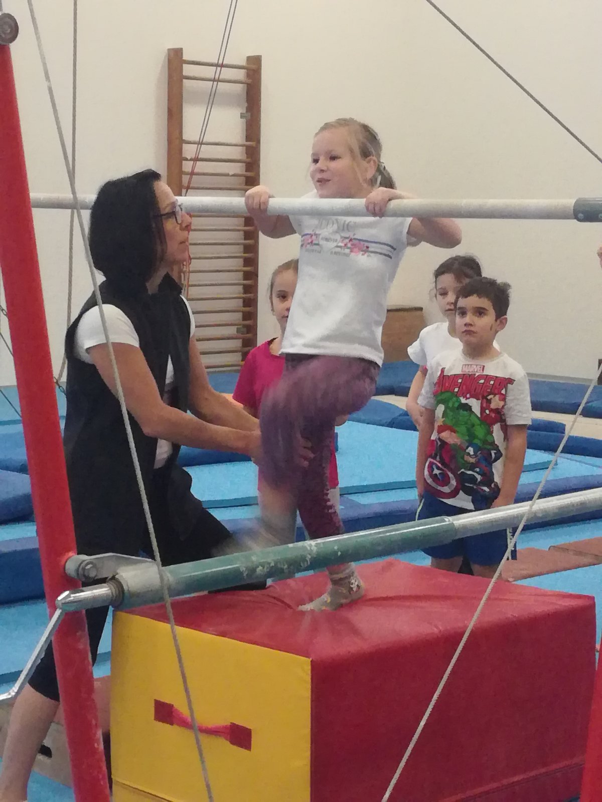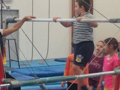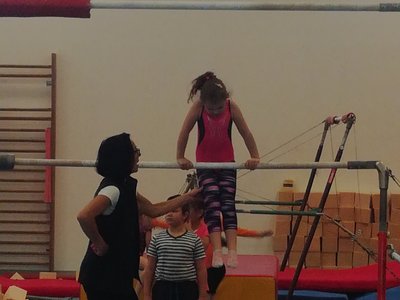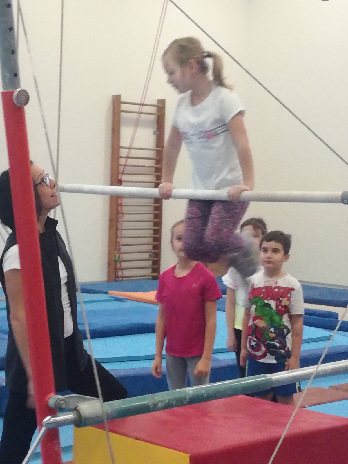 Úvodní část hodiny - rozcvička bývá podobně zaměřená. Zde vidíte fotky z druhých částí hodin, kdy děti cvičí na různých nářadích nebo s náčiním.