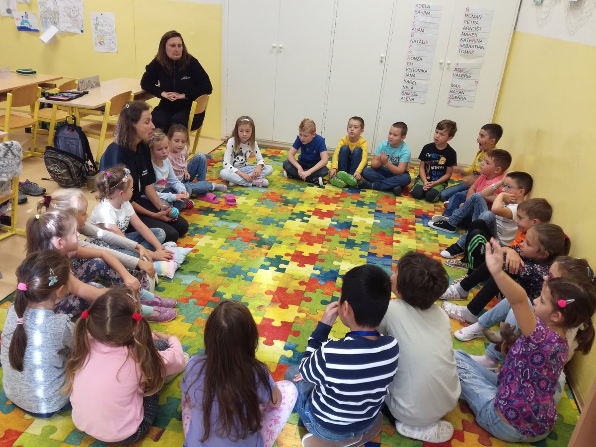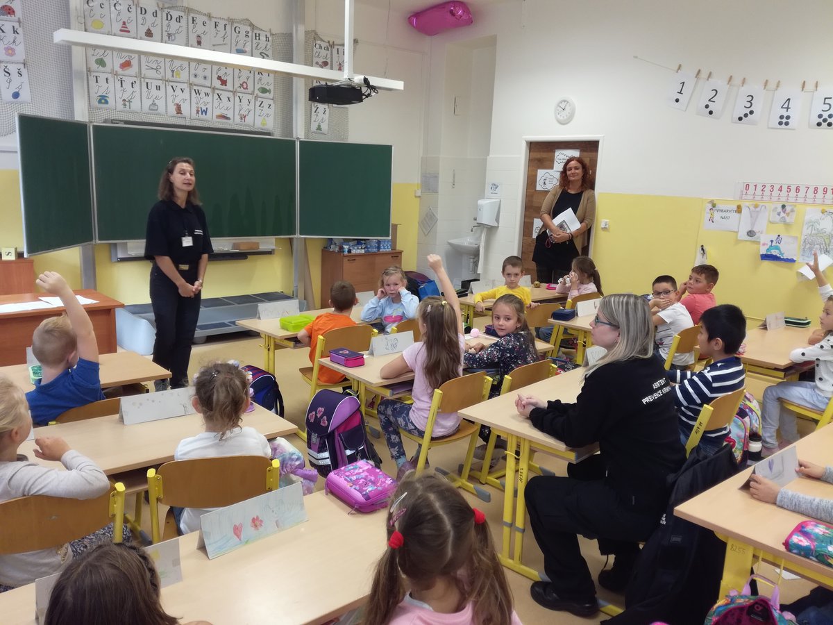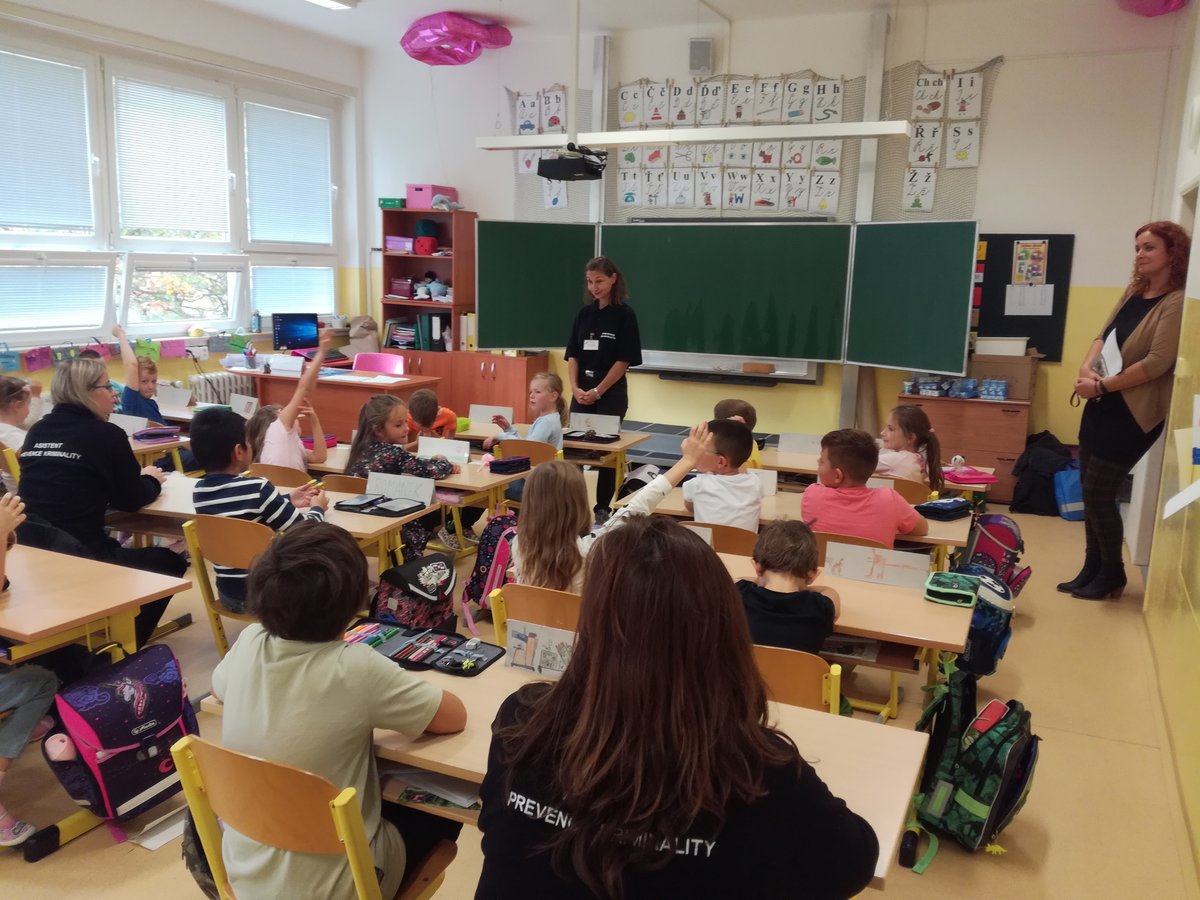 Ve středu 16. 9. měly děti besedu s preventistkou Městské policie v Litvínově paní Hejčovou. Přítomny byly i asistentky kriminality, které děti potkávají v okolí školy.