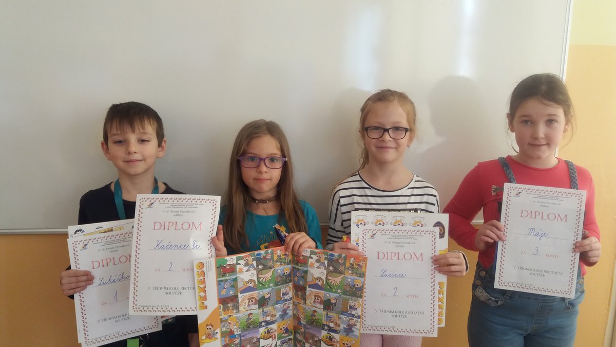 V lednu jsme si udělali třídní kolo v recitaci. Ti nejlepší postoupili do kola školního, které proběhlo 13. února. Děkujeme Máje i Lukáškovi za krásný přednes a reprezentaci naší třídy.