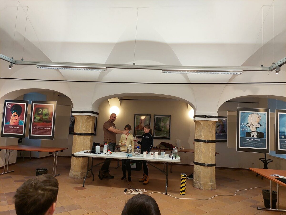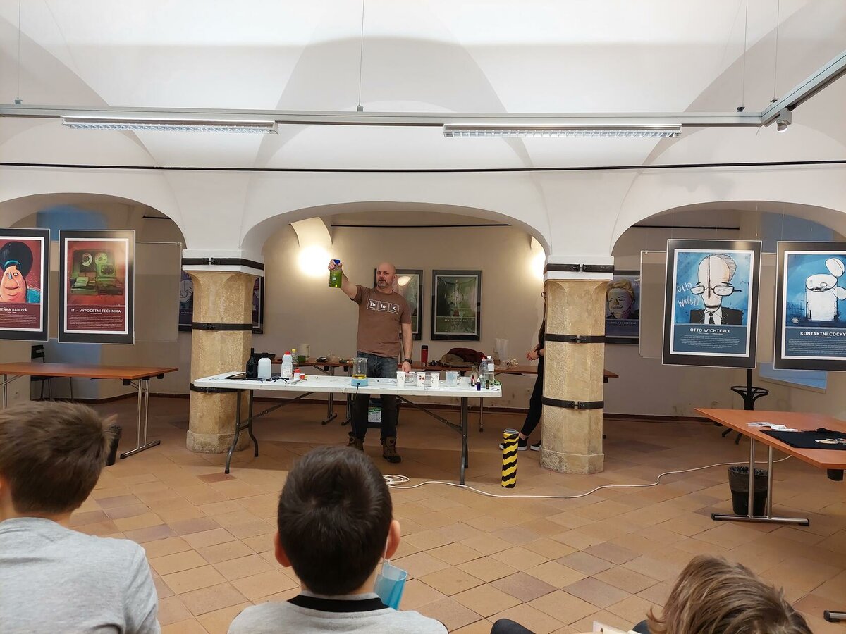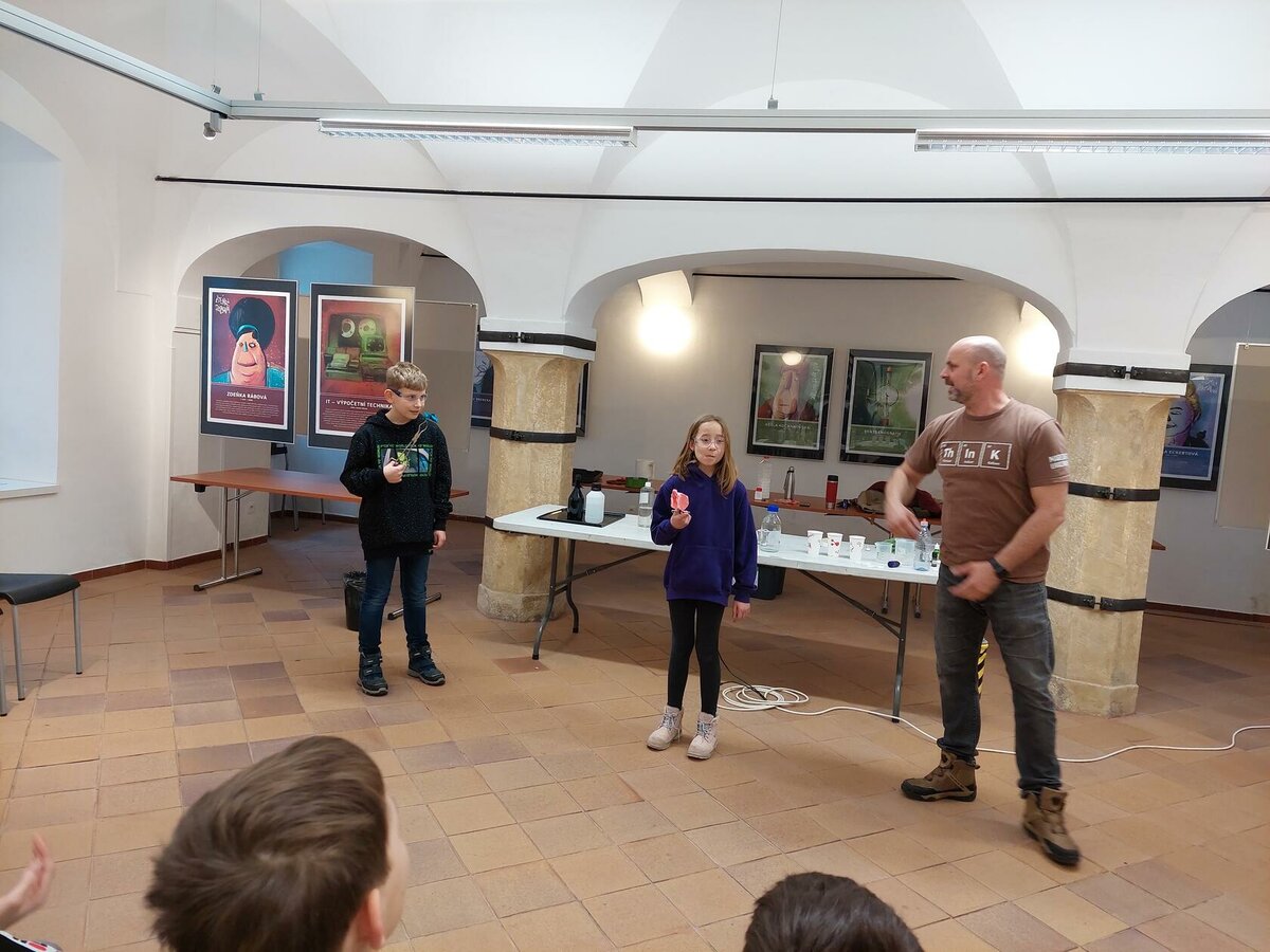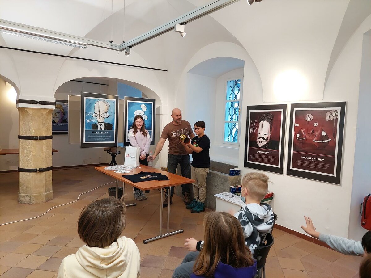 Chemie, pokusy? Slyšeli jsme zajímavé informace, máme nové zážitky, byli jsme nadšení. Neminuly nás ani drobnosti za odměnu. Robin s Lukášem jako nejlepší doplňovači informací získali triko. Děkujeme za zajímavý program.